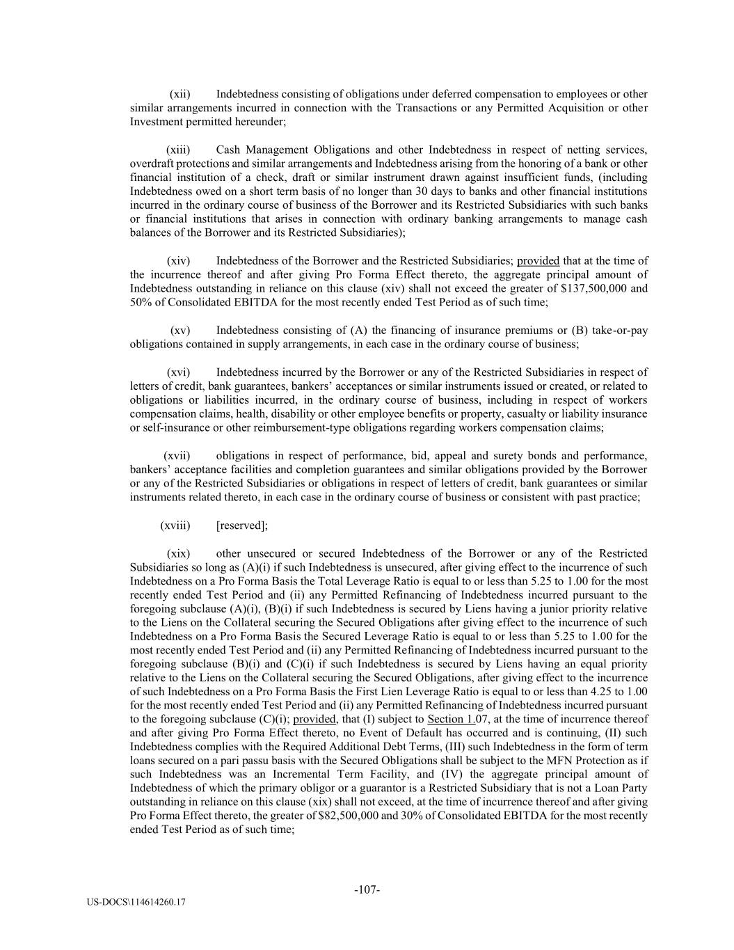 (xii) Indebtedness consisting of obligations under deferred compensation to employees or other similar arrangements incurred in connection with the Transactions or any Permitted Acquisition or other Investment permitted hereunder; (xiii) Cash Management Obligations and other Indebtedness in respect of netting services, overdraft protections and similar arrangements and Indebtedness arising from the honoring of a bank or other financial institution of a check, draft or similar instrument drawn against insufficient funds, (including Indebtedness owed on a short term basis of no longer than 30 days to banks and other financial institutions incurred in the ordinary course of business of the Borrower and its Restricted Subsidiaries with such banks or financial institutions that arises in connection with ordinary banking arrangements to manage cash balances of the Borrower and its Restricted Subsidiaries); (xiv) Indebtedness of the Borrower and the Restricted Subsidiaries; provided that at the time of the incurrence thereof and after giving Pro Forma Effect thereto, the aggregate principal amount of Indebtedness outstanding in reliance on this clause (xiv) shall not exceed the greater of $137,500,000 and 50% of Consolidated EBITDA for the most recently ended Test Period as of such time; (xv) Indebtedness consisting of (A) the financing of insurance premiums or (B) take-or-pay obligations contained in supply arrangements, in each case in the ordinary course of business; (xvi) Indebtedness incurred by the Borrower or any of the Restricted Subsidiaries in respect of obligations or liabilities incurred, in the ordinary course of business, including in respect of workers compensation claims, health, disability or other employee benefits or property, casualty or liability insurance or self-insurance or other reimbursement-type obligations regarding workers compensation claims; (xvii) obligations in respect of performance, bid, appeal and surety bonds and performance, or any of the Restricted Subsidiaries or obligations in respect of letters of credit, bank guarantees or similar instruments related thereto, in each case in the ordinary course of business or consistent with past practice; (xviii) [reserved]; (xix) other unsecured or secured Indebtedness of the Borrower or any of the Restricted Subsidiaries so long as (A)(i) if such Indebtedness is unsecured, after giving effect to the incurrence of such Indebtedness on a Pro Forma Basis the Total Leverage Ratio is equal to or less than 5.25 to 1.00 for the most recently ended Test Period and (ii) any Permitted Refinancing of Indebtedness incurred pursuant to the foregoing subclause (A)(i), (B)(i) if such Indebtedness is secured by Liens having a junior priority relative to the Liens on the Collateral securing the Secured Obligations after giving effect to the incurrence of such Indebtedness on a Pro Forma Basis the Secured Leverage Ratio is equal to or less than 5.25 to 1.00 for the most recently ended Test Period and (ii) any Permitted Refinancing of Indebtedness incurred pursuant to the foregoing subclause (B)(i) and (C)(i) if such Indebtedness is secured by Liens having an equal priority relative to the Liens on the Collateral securing the Secured Obligations, after giving effect to the incurrence of such Indebtedness on a Pro Forma Basis the First Lien Leverage Ratio is equal to or less than 4.25 to 1.00 for the most recently ended Test Period and (ii) any Permitted Refinancing of Indebtedness incurred pursuant to the foregoing subclause (C)(i); provided, that (I) subject to Section 1.07, at the time of incurrence thereof and after giving Pro Forma Effect thereto, no Event of Default has occurred and is continuing, (II) such Indebtedness complies with the Required Additional Debt Terms, (III) such Indebtedness in the form of term loans secured on a pari passu basis with the Secured Obligations shall be subject to the MFN Protection as if such Indebtedness was an Incremental Term Facility, and (IV) the aggregate principal amount of Indebtedness of which the primary obligor or a guarantor is a Restricted Subsidiary that is not a Loan Party outstanding in reliance on this clause (xix) shall not exceed, at the time of incurrence thereof and after giving Pro Forma Effect thereto, the greater of $82,500,000 and 30% of Consolidated EBITDA for the most recently ended Test Period as of such time; -107- US-DOCS\114614260.17