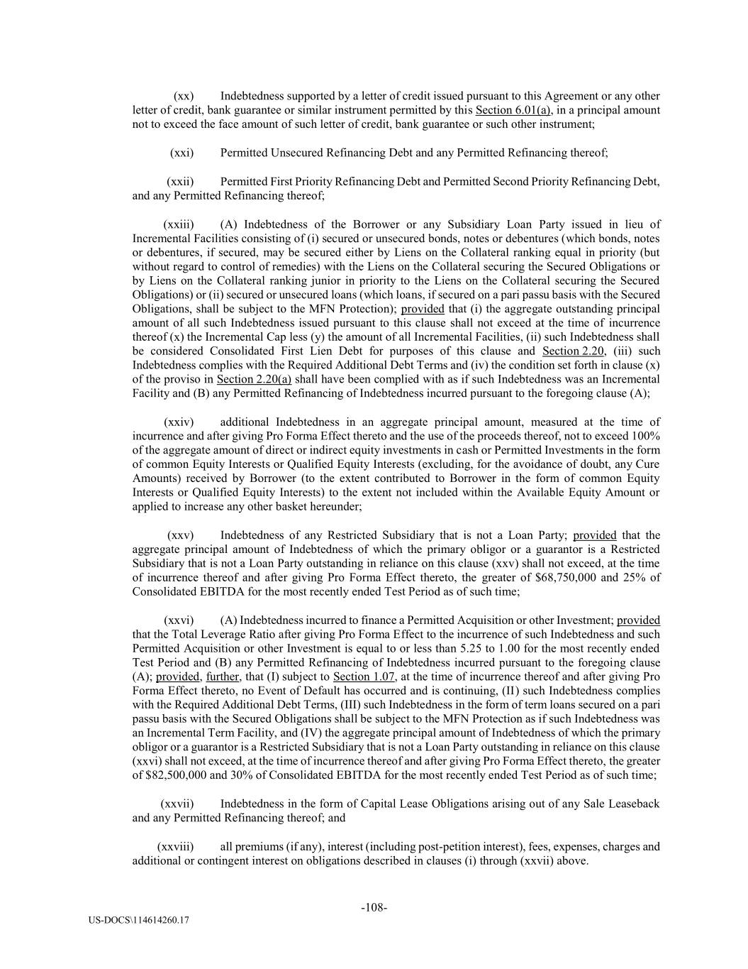 (xx) Indebtedness supported by a letter of credit issued pursuant to this Agreement or any other letter of credit, bank guarantee or similar instrument permitted by this Section 6.01(a), in a principal amount not to exceed the face amount of such letter of credit, bank guarantee or such other instrument; (xxi) Permitted Unsecured Refinancing Debt and any Permitted Refinancing thereof; (xxii) Permitted First Priority Refinancing Debt and Permitted Second Priority Refinancing Debt, and any Permitted Refinancing thereof; (xxiii) (A) Indebtedness of the Borrower or any Subsidiary Loan Party issued in lieu of Incremental Facilities consisting of (i) secured or unsecured bonds, notes or debentures (which bonds, notes or debentures, if secured, may be secured either by Liens on the Collateral ranking equal in priority (but without regard to control of remedies) with the Liens on the Collateral securing the Secured Obligations or by Liens on the Collateral ranking junior in priority to the Liens on the Collateral securing the Secured Obligations) or (ii) secured or unsecured loans (which loans, if secured on a pari passu basis with the Secured Obligations, shall be subject to the MFN Protection); provided that (i) the aggregate outstanding principal amount of all such Indebtedness issued pursuant to this clause shall not exceed at the time of incurrence thereof (x) the Incremental Cap less (y) the amount of all Incremental Facilities, (ii) such Indebtedness shall be considered Consolidated First Lien Debt for purposes of this clause and Section 2.20, (iii) such Indebtedness complies with the Required Additional Debt Terms and (iv) the condition set forth in clause (x) of the proviso in Section 2.20(a) shall have been complied with as if such Indebtedness was an Incremental Facility and (B) any Permitted Refinancing of Indebtedness incurred pursuant to the foregoing clause (A); (xxiv) additional Indebtedness in an aggregate principal amount, measured at the time of incurrence and after giving Pro Forma Effect thereto and the use of the proceeds thereof, not to exceed 100% of the aggregate amount of direct or indirect equity investments in cash or Permitted Investments in the form of common Equity Interests or Qualified Equity Interests (excluding, for the avoidance of doubt, any Cure Amounts) received by Borrower (to the extent contributed to Borrower in the form of common Equity Interests or Qualified Equity Interests) to the extent not included within the Available Equity Amount or applied to increase any other basket hereunder; (xxv) Indebtedness of any Restricted Subsidiary that is not a Loan Party; provided that the aggregate principal amount of Indebtedness of which the primary obligor or a guarantor is a Restricted Subsidiary that is not a Loan Party outstanding in reliance on this clause (xxv) shall not exceed, at the time of incurrence thereof and after giving Pro Forma Effect thereto, the greater of $68,750,000 and 25% of Consolidated EBITDA for the most recently ended Test Period as of such time; (xxvi) (A) Indebtedness incurred to finance a Permitted Acquisition or other Investment; provided that the Total Leverage Ratio after giving Pro Forma Effect to the incurrence of such Indebtedness and such Permitted Acquisition or other Investment is equal to or less than 5.25 to 1.00 for the most recently ended Test Period and (B) any Permitted Refinancing of Indebtedness incurred pursuant to the foregoing clause (A); provided, further, that (I) subject to Section 1.07, at the time of incurrence thereof and after giving Pro Forma Effect thereto, no Event of Default has occurred and is continuing, (II) such Indebtedness complies with the Required Additional Debt Terms, (III) such Indebtedness in the form of term loans secured on a pari passu basis with the Secured Obligations shall be subject to the MFN Protection as if such Indebtedness was an Incremental Term Facility, and (IV) the aggregate principal amount of Indebtedness of which the primary obligor or a guarantor is a Restricted Subsidiary that is not a Loan Party outstanding in reliance on this clause (xxvi) shall not exceed, at the time of incurrence thereof and after giving Pro Forma Effect thereto, the greater of $82,500,000 and 30% of Consolidated EBITDA for the most recently ended Test Period as of such time; (xxvii) Indebtedness in the form of Capital Lease Obligations arising out of any Sale Leaseback and any Permitted Refinancing thereof; and (xxviii) all premiums (if any), interest (including post-petition interest), fees, expenses, charges and additional or contingent interest on obligations described in clauses (i) through (xxvii) above. -108- US-DOCS\114614260.17