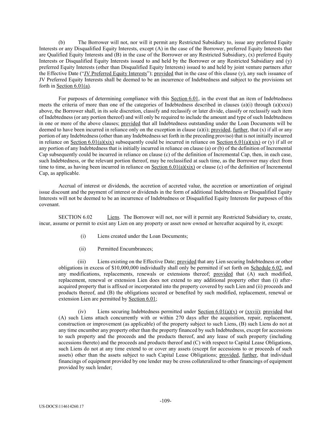 (b) The Borrower will not, nor will it permit any Restricted Subsidiary to, issue any preferred Equity Interests or any Disqualified Equity Interests, except (A) in the case of the Borrower, preferred Equity Interests that are Qualified Equity Interests and (B) in the case of the Borrower or any Restricted Subsidiary, (x) preferred Equity Interests or Disqualified Equity Interests issued to and held by the Borrower or any Restricted Subsidiary and (y) preferred Equity Interests (other than Disqualified Equity Interests) issued to and held by joint venture partners after the Effecti JV Preferred Equity Interests provided that in the case of this clause (y), any such issuance of JV Preferred Equity Interests shall be deemed to be an incurrence of Indebtedness and subject to the provisions set forth in Section 6.01(a). For purposes of determining compliance with this Section 6.01, in the event that an item of Indebtedness meets the criteria of more than one of the categories of Indebtedness described in clauses (a)(i) through (a)(xxxi) above, the Borrower shall, in its sole discretion, classify and reclassify or later divide, classify or reclassify such item of Indebtedness (or any portion thereof) and will only be required to include the amount and type of such Indebtedness in one or more of the above clauses; provided that all Indebtedness outstanding under the Loan Documents will be deemed to have been incurred in reliance only on the exception in clause (a)(i); provided, further, that (x) if all or any portion of any Indebtedness (other than any Indebtedness set forth in the preceding proviso) that is not initially incurred in reliance on Section 6.01(a)(xix) subsequently could be incurred in reliance on Section 6.01(a)(xix) or (y) if all or any portion of any Indebtedness that is initially incurred in reliance on clause (a) or (b) of the definition of Incremental Cap subsequently could be incurred in reliance on clause (c) of the definition of Incremental Cap, then, in each case, such Indebtedness, or the relevant portion thereof, may be reclassified at such time, as the Borrower may elect from time to time, as having been incurred in reliance on Section 6.01(a)(xix) or clause (c) of the definition of Incremental Cap, as applicable. Accrual of interest or dividends, the accretion of accreted value, the accretion or amortization of original issue discount and the payment of interest or dividends in the form of additional Indebtedness or Disqualified Equity Interests will not be deemed to be an incurrence of Indebtedness or Disqualified Equity Interests for purposes of this covenant. SECTION 6.02 Liens. The Borrower will not, nor will it permit any Restricted Subsidiary to, create, incur, assume or permit to exist any Lien on any property or asset now owned or hereafter acquired by it, except: (i) Liens created under the Loan Documents; (ii) Permitted Encumbrances; (iii) Liens existing on the Effective Date; provided that any Lien securing Indebtedness or other obligations in excess of $10,000,000 individually shall only be permitted if set forth on Schedule 6.02, and any modifications, replacements, renewals or extensions thereof; provided that (A) such modified, replacement, renewal or extension Lien does not extend to any additional property other than (i) after- acquired property that is affixed or incorporated into the property covered by such Lien and (ii) proceeds and products thereof, and (B) the obligations secured or benefited by such modified, replacement, renewal or extension Lien are permitted by Section 6.01; (iv) Liens securing Indebtedness permitted under Section 6.01(a)(v) or (xxvii); provided that (A) such Liens attach concurrently with or within 270 days after the acquisition, repair, replacement, construction or improvement (as applicable) of the property subject to such Liens, (B) such Liens do not at any time encumber any property other than the property financed by such Indebtedness, except for accessions to such property and the proceeds and the products thereof, and any lease of such property (including accessions thereto) and the proceeds and products thereof and (C) with respect to Capital Lease Obligations, such Liens do not at any time extend to or cover any assets (except for accessions to or proceeds of such assets) other than the assets subject to such Capital Lease Obligations; provided, further, that individual financings of equipment provided by one lender may be cross collateralized to other financings of equipment provided by such lender; -109- US-DOCS\114614260.17