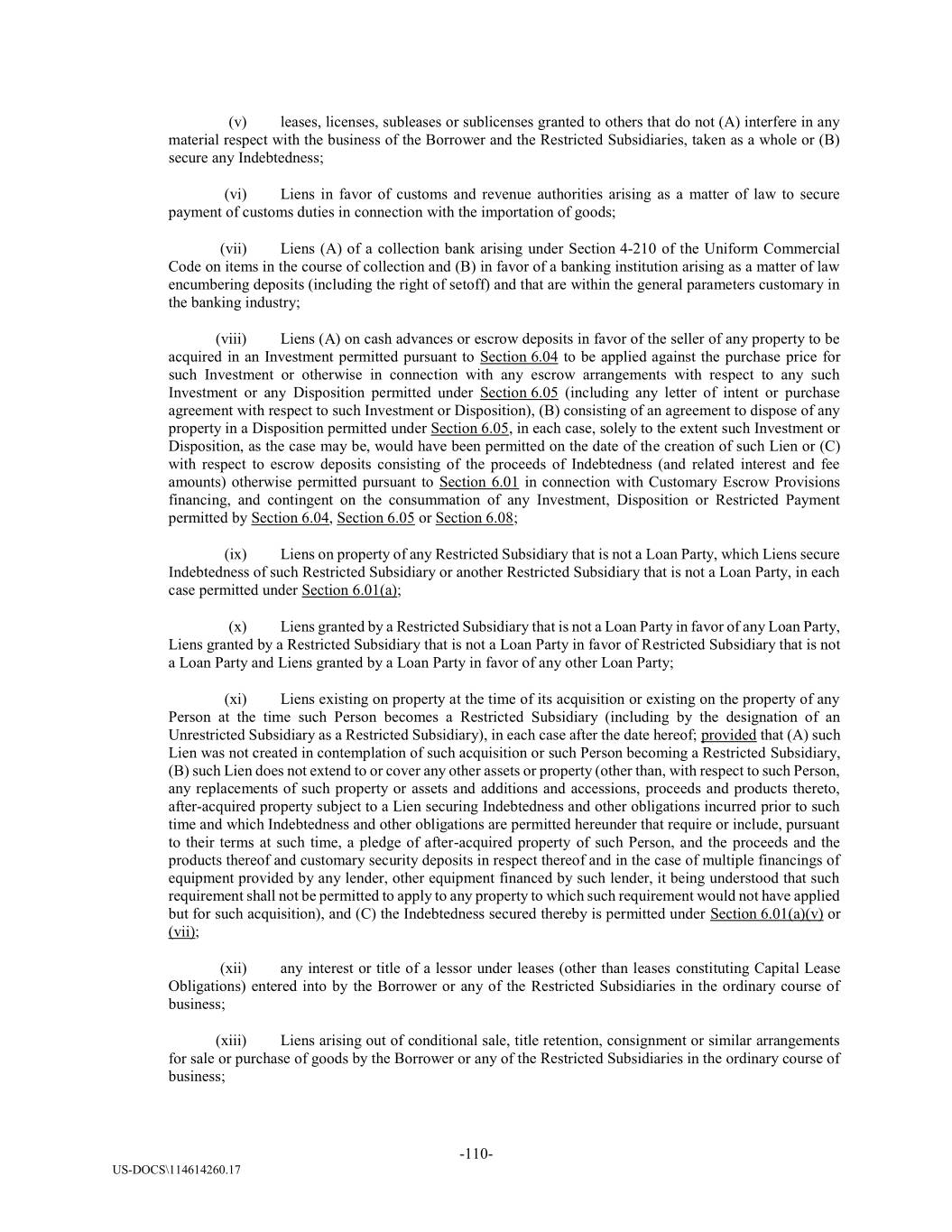 (v) leases, licenses, subleases or sublicenses granted to others that do not (A) interfere in any material respect with the business of the Borrower and the Restricted Subsidiaries, taken as a whole or (B) secure any Indebtedness; (vi) Liens in favor of customs and revenue authorities arising as a matter of law to secure payment of customs duties in connection with the importation of goods; (vii) Liens (A) of a collection bank arising under Section 4-210 of the Uniform Commercial Code on items in the course of collection and (B) in favor of a banking institution arising as a matter of law encumbering deposits (including the right of setoff) and that are within the general parameters customary in the banking industry; (viii) Liens (A) on cash advances or escrow deposits in favor of the seller of any property to be acquired in an Investment permitted pursuant to Section 6.04 to be applied against the purchase price for such Investment or otherwise in connection with any escrow arrangements with respect to any such Investment or any Disposition permitted under Section 6.05 (including any letter of intent or purchase agreement with respect to such Investment or Disposition), (B) consisting of an agreement to dispose of any property in a Disposition permitted under Section 6.05, in each case, solely to the extent such Investment or Disposition, as the case may be, would have been permitted on the date of the creation of such Lien or (C) with respect to escrow deposits consisting of the proceeds of Indebtedness (and related interest and fee amounts) otherwise permitted pursuant to Section 6.01 in connection with Customary Escrow Provisions financing, and contingent on the consummation of any Investment, Disposition or Restricted Payment permitted by Section 6.04, Section 6.05 or Section 6.08; (ix) Liens on property of any Restricted Subsidiary that is not a Loan Party, which Liens secure Indebtedness of such Restricted Subsidiary or another Restricted Subsidiary that is not a Loan Party, in each case permitted under Section 6.01(a); (x) Liens granted by a Restricted Subsidiary that is not a Loan Party in favor of any Loan Party, Liens granted by a Restricted Subsidiary that is not a Loan Party in favor of Restricted Subsidiary that is not a Loan Party and Liens granted by a Loan Party in favor of any other Loan Party; (xi) Liens existing on property at the time of its acquisition or existing on the property of any Person at the time such Person becomes a Restricted Subsidiary (including by the designation of an Unrestricted Subsidiary as a Restricted Subsidiary), in each case after the date hereof; provided that (A) such Lien was not created in contemplation of such acquisition or such Person becoming a Restricted Subsidiary, (B) such Lien does not extend to or cover any other assets or property (other than, with respect to such Person, any replacements of such property or assets and additions and accessions, proceeds and products thereto, after-acquired property subject to a Lien securing Indebtedness and other obligations incurred prior to such time and which Indebtedness and other obligations are permitted hereunder that require or include, pursuant to their terms at such time, a pledge of after-acquired property of such Person, and the proceeds and the products thereof and customary security deposits in respect thereof and in the case of multiple financings of equipment provided by any lender, other equipment financed by such lender, it being understood that such requirement shall not be permitted to apply to any property to which such requirement would not have applied but for such acquisition), and (C) the Indebtedness secured thereby is permitted under Section 6.01(a)(v) or (vii); (xii) any interest or title of a lessor under leases (other than leases constituting Capital Lease Obligations) entered into by the Borrower or any of the Restricted Subsidiaries in the ordinary course of business; (xiii) Liens arising out of conditional sale, title retention, consignment or similar arrangements for sale or purchase of goods by the Borrower or any of the Restricted Subsidiaries in the ordinary course of business; -110- US-DOCS\114614260.17