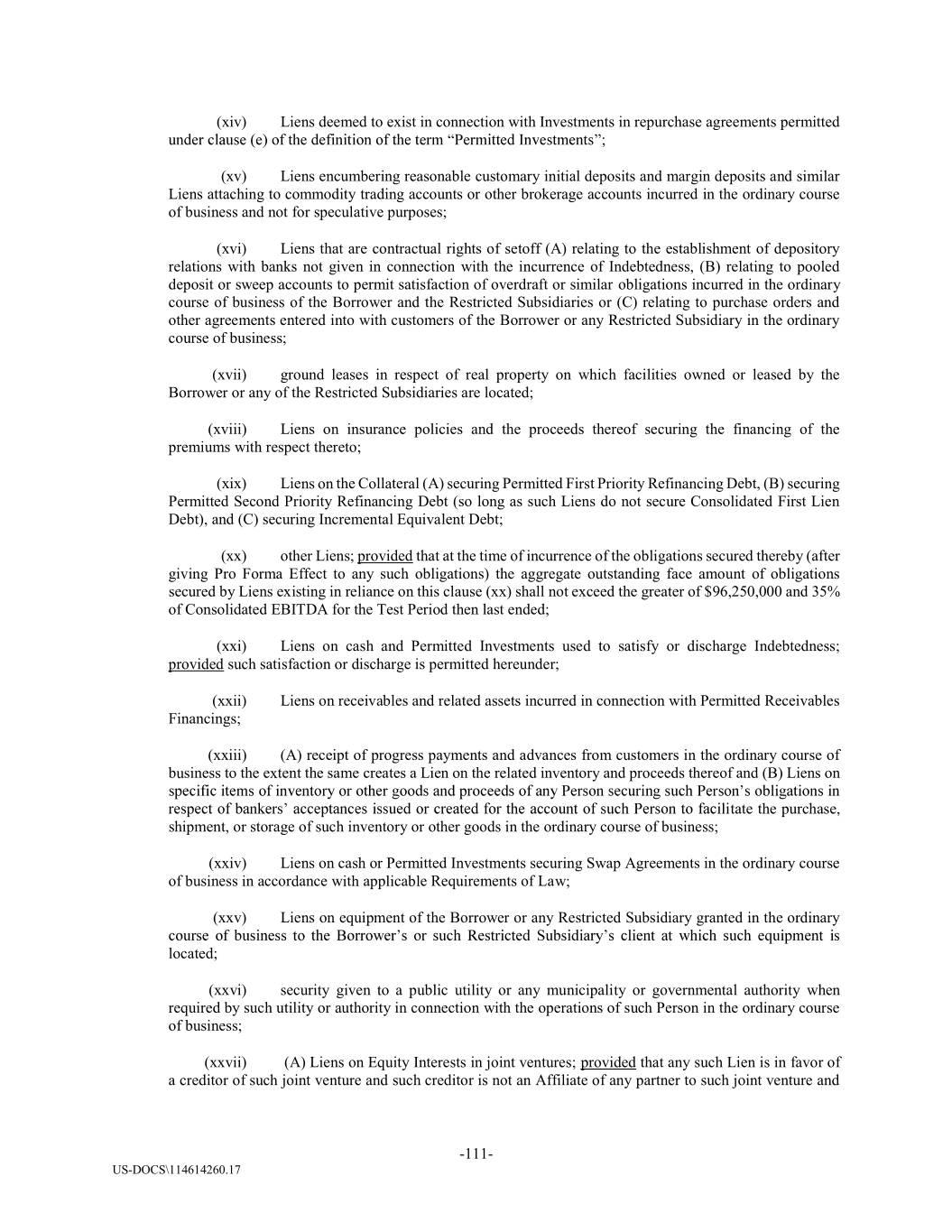 (xiv) Liens deemed to exist in connection with Investments in repurchase agreements permitted (xv) Liens encumbering reasonable customary initial deposits and margin deposits and similar Liens attaching to commodity trading accounts or other brokerage accounts incurred in the ordinary course of business and not for speculative purposes; (xvi) Liens that are contractual rights of setoff (A) relating to the establishment of depository relations with banks not given in connection with the incurrence of Indebtedness, (B) relating to pooled deposit or sweep accounts to permit satisfaction of overdraft or similar obligations incurred in the ordinary course of business of the Borrower and the Restricted Subsidiaries or (C) relating to purchase orders and other agreements entered into with customers of the Borrower or any Restricted Subsidiary in the ordinary course of business; (xvii) ground leases in respect of real property on which facilities owned or leased by the Borrower or any of the Restricted Subsidiaries are located; (xviii) Liens on insurance policies and the proceeds thereof securing the financing of the premiums with respect thereto; (xix) Liens on the Collateral (A) securing Permitted First Priority Refinancing Debt, (B) securing Permitted Second Priority Refinancing Debt (so long as such Liens do not secure Consolidated First Lien Debt), and (C) securing Incremental Equivalent Debt; (xx) other Liens; provided that at the time of incurrence of the obligations secured thereby (after giving Pro Forma Effect to any such obligations) the aggregate outstanding face amount of obligations secured by Liens existing in reliance on this clause (xx) shall not exceed the greater of $96,250,000 and 35% of Consolidated EBITDA for the Test Period then last ended; (xxi) Liens on cash and Permitted Investments used to satisfy or discharge Indebtedness; provided such satisfaction or discharge is permitted hereunder; (xxii) Liens on receivables and related assets incurred in connection with Permitted Receivables Financings; (xxiii) (A) receipt of progress payments and advances from customers in the ordinary course of business to the extent the same creates a Lien on the related inventory and proceeds thereof and (B) Liens on tate the purchase, shipment, or storage of such inventory or other goods in the ordinary course of business; (xxiv) Liens on cash or Permitted Investments securing Swap Agreements in the ordinary course of business in accordance with applicable Requirements of Law; (xxv) Liens on equipment of the Borrower or any Restricted Subsidiary granted in the ordinary located; (xxvi) security given to a public utility or any municipality or governmental authority when required by such utility or authority in connection with the operations of such Person in the ordinary course of business; (xxvii) (A) Liens on Equity Interests in joint ventures; provided that any such Lien is in favor of a creditor of such joint venture and such creditor is not an Affiliate of any partner to such joint venture and -111- US-DOCS\114614260.17