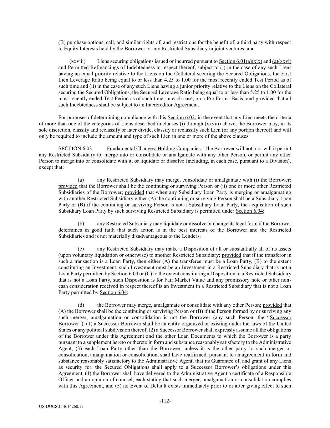 (B) purchase options, call, and similar rights of, and restrictions for the benefit of, a third party with respect to Equity Interests held by the Borrower or any Restricted Subsidiary in joint ventures; and (xxviii) Liens securing obligations issued or incurred pursuant to Section 6.01(a)(xix) and (a)(xxvi) and Permitted Refinancings of Indebtedness in respect thereof, subject to (i) in the case of any such Liens having an equal priority relative to the Liens on the Collateral securing the Secured Obligations, the First Lien Leverage Ratio being equal to or less than 4.25 to 1.00 for the most recently ended Test Period as of such time and (ii) in the case of any such Liens having a junior priority relative to the Liens on the Collateral securing the Secured Obligations, the Secured Leverage Ratio being equal to or less than 5.25 to 1.00 for the most recently ended Test Period as of such time, in each case, on a Pro Forma Basis; and provided that all such Indebtedness shall be subject to an Intercreditor Agreement. For purposes of determining compliance with this Section 6.02, in the event that any Lien meets the criteria of more than one of the categories of Liens described in clauses (i) through (xxviii) above, the Borrower may, in its sole discretion, classify and reclassify or later divide, classify or reclassify such Lien (or any portion thereof) and will only be required to include the amount and type of such Lien in one or more of the above clauses. SECTION 6.03 Fundamental Changes; Holding Companies. The Borrower will not, nor will it permit any Restricted Subsidiary to, merge into or consolidate or amalgamate with any other Person, or permit any other Person to merge into or consolidate with it, or liquidate or dissolve (including, in each case, pursuant to a Division), except that: (a) any Restricted Subsidiary may merge, consolidate or amalgamate with (i) the Borrower; provided that the Borrower shall be the continuing or surviving Person or (ii) one or more other Restricted Subsidiaries of the Borrower; provided that when any Subsidiary Loan Party is merging or amalgamating with another Restricted Subsidiary either (A) the continuing or surviving Person shall be a Subsidiary Loan Party or (B) if the continuing or surviving Person is not a Subsidiary Loan Party, the acquisition of such Subsidiary Loan Party by such surviving Restricted Subsidiary is permitted under Section 6.04; (b) any Restricted Subsidiary may liquidate or dissolve or change its legal form if the Borrower determines in good faith that such action is in the best interests of the Borrower and the Restricted Subsidiaries and is not materially disadvantageous to the Lenders; (c) any Restricted Subsidiary may make a Disposition of all or substantially all of its assets (upon voluntary liquidation or otherwise) to another Restricted Subsidiary; provided that if the transferor in such a transaction is a Loan Party, then either (A) the transferee must be a Loan Party, (B) to the extent constituting an Investment, such Investment must be an Investment in a Restricted Subsidiary that is not a Loan Party permitted by Section 6.04 or (C) to the extent constituting a Disposition to a Restricted Subsidiary that is not a Loan Party, such Disposition is for Fair Market Value and any promissory note or other non- cash consideration received in respect thereof is an Investment in a Restricted Subsidiary that is not a Loan Party permitted by Section 6.04; (d) the Borrower may merge, amalgamate or consolidate with any other Person; provided that (A) the Borrower shall be the continuing or surviving Person or (B) if the Person formed by or surviving any Successor Borrower laws of the United States or any political subdivision thereof, (2) a Successor Borrower shall expressly assume all the obligations of the Borrower under this Agreement and the other Loan Documents to which the Borrower is a party pursuant to a supplement hereto or thereto in form and substance reasonably satisfactory to the Administrative Agent, (3) each Loan Party other than the Borrower, unless it is the other party to such merger or consolidation, amalgamation or consolidation, shall have reaffirmed, pursuant to an agreement in form and substance reasonably satisfactory to the Administrative Agent, that its Guarantee of, and grant of any Liens Agreement, (4) the Borrower shall have delivered to the Administrative Agent a certificate of a Responsible Officer and an opinion of counsel, each stating that such merger, amalgamation or consolidation complies with this Agreement, and (5) no Event of Default exists immediately prior to or after giving effect to such -112- US-DOCS\114614260.17