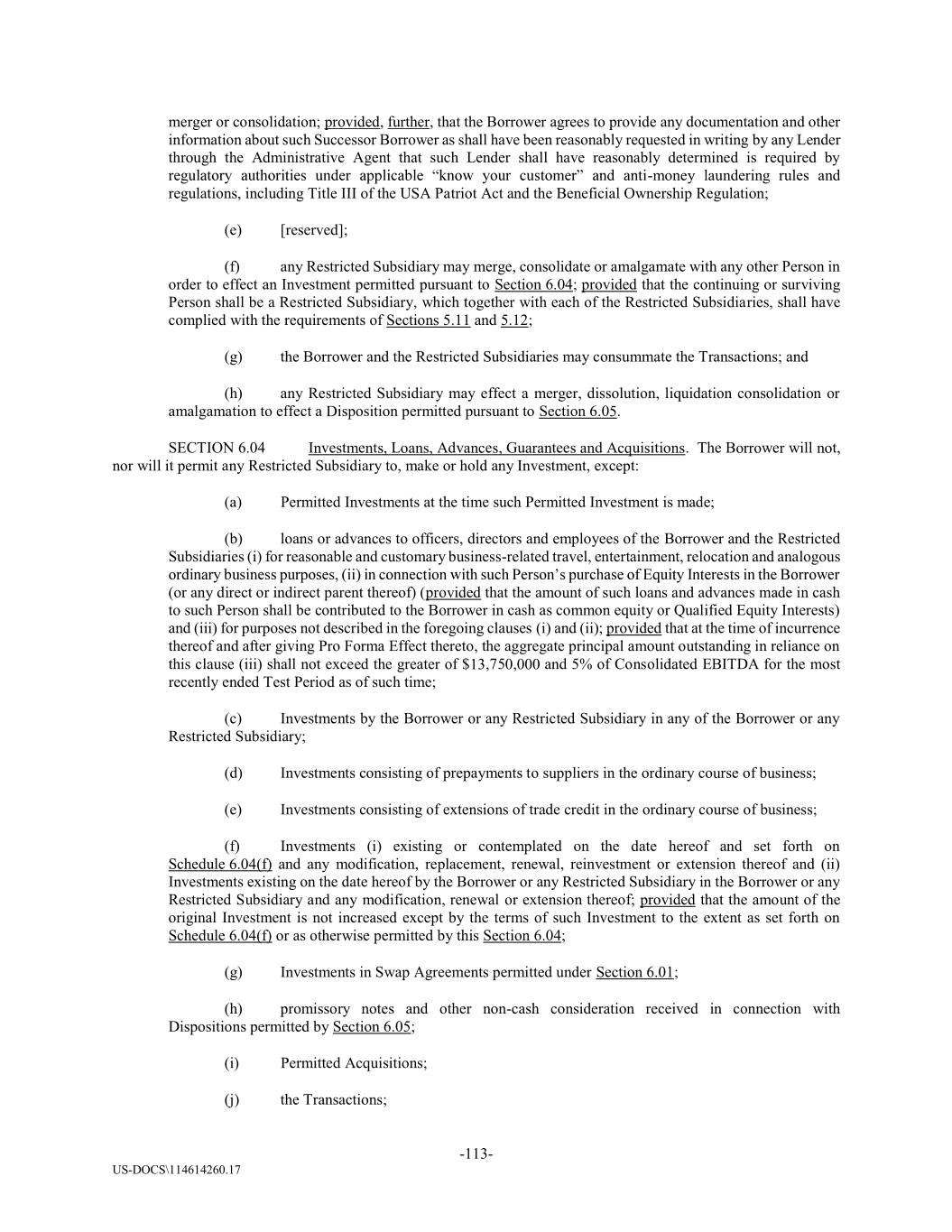 merger or consolidation; provided, further, that the Borrower agrees to provide any documentation and other information about such Successor Borrower as shall have been reasonably requested in writing by any Lender through the Administrative Agent that such Lender shall have reasonably determined is required by -money laundering rules and regulations, including Title III of the USA Patriot Act and the Beneficial Ownership Regulation; (e) [reserved]; (f) any Restricted Subsidiary may merge, consolidate or amalgamate with any other Person in order to effect an Investment permitted pursuant to Section 6.04; provided that the continuing or surviving Person shall be a Restricted Subsidiary, which together with each of the Restricted Subsidiaries, shall have complied with the requirements of Sections 5.11 and 5.12; (g) the Borrower and the Restricted Subsidiaries may consummate the Transactions; and (h) any Restricted Subsidiary may effect a merger, dissolution, liquidation consolidation or amalgamation to effect a Disposition permitted pursuant to Section 6.05. SECTION 6.04 Investments, Loans, Advances, Guarantees and Acquisitions. The Borrower will not, nor will it permit any Restricted Subsidiary to, make or hold any Investment, except: (a) Permitted Investments at the time such Permitted Investment is made; (b) loans or advances to officers, directors and employees of the Borrower and the Restricted Subsidiaries (i) for reasonable and customary business-related travel, entertainment, relocation and analogous (or any direct or indirect parent thereof) (provided that the amount of such loans and advances made in cash to such Person shall be contributed to the Borrower in cash as common equity or Qualified Equity Interests) and (iii) for purposes not described in the foregoing clauses (i) and (ii); provided that at the time of incurrence thereof and after giving Pro Forma Effect thereto, the aggregate principal amount outstanding in reliance on this clause (iii) shall not exceed the greater of $13,750,000 and 5% of Consolidated EBITDA for the most recently ended Test Period as of such time; (c) Investments by the Borrower or any Restricted Subsidiary in any of the Borrower or any Restricted Subsidiary; (d) Investments consisting of prepayments to suppliers in the ordinary course of business; (e) Investments consisting of extensions of trade credit in the ordinary course of business; (f) Investments (i) existing or contemplated on the date hereof and set forth on Schedule 6.04(f) and any modification, replacement, renewal, reinvestment or extension thereof and (ii) Investments existing on the date hereof by the Borrower or any Restricted Subsidiary in the Borrower or any Restricted Subsidiary and any modification, renewal or extension thereof; provided that the amount of the original Investment is not increased except by the terms of such Investment to the extent as set forth on Schedule 6.04(f) or as otherwise permitted by this Section 6.04; (g) Investments in Swap Agreements permitted under Section 6.01; (h) promissory notes and other non-cash consideration received in connection with Dispositions permitted by Section 6.05; (i) Permitted Acquisitions; (j) the Transactions; -113- US-DOCS\114614260.17