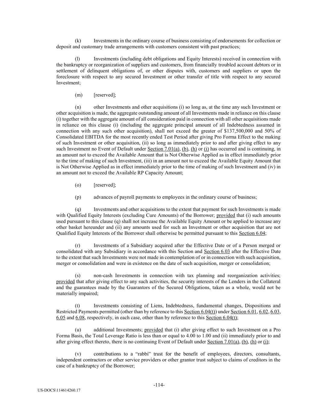 (k) Investments in the ordinary course of business consisting of endorsements for collection or deposit and customary trade arrangements with customers consistent with past practices; (l) Investments (including debt obligations and Equity Interests) received in connection with the bankruptcy or reorganization of suppliers and customers, from financially troubled account debtors or in settlement of delinquent obligations of, or other disputes with, customers and suppliers or upon the foreclosure with respect to any secured Investment or other transfer of title with respect to any secured Investment; (m) [reserved]; (n) other Investments and other acquisitions (i) so long as, at the time any such Investment or other acquisition is made, the aggregate outstanding amount of all Investments made in reliance on this clause (i) together with the aggregate amount of all consideration paid in connection with all other acquisitions made in reliance on this clause (i) (including the aggregate principal amount of all Indebtedness assumed in connection with any such other acquisition), shall not exceed the greater of $137,500,000 and 50% of Consolidated EBITDA for the most recently ended Test Period after giving Pro Forma Effect to the making of such Investment or other acquisition, (ii) so long as immediately prior to and after giving effect to any such Investment no Event of Default under Section 7.01(a), (b), (h) or (i) has occurred and is continuing, in an amount not to exceed the Available Amount that is Not Otherwise Applied as in effect immediately prior to the time of making of such Investment, (iii) in an amount not to exceed the Available Equity Amount that is Not Otherwise Applied as in effect immediately prior to the time of making of such Investment and (iv) in an amount not to exceed the Available RP Capacity Amount; (o) [reserved]; (p) advances of payroll payments to employees in the ordinary course of business; (q) Investments and other acquisitions to the extent that payment for such Investments is made with Qualified Equity Interests (excluding Cure Amounts) of the Borrower; provided that (i) such amounts used pursuant to this clause (q) shall not increase the Available Equity Amount or be applied to increase any other basket hereunder and (ii) any amounts used for such an Investment or other acquisition that are not Qualified Equity Interests of the Borrower shall otherwise be permitted pursuant to this Section 6.04; (r) Investments of a Subsidiary acquired after the Effective Date or of a Person merged or consolidated with any Subsidiary in accordance with this Section and Section 6.03 after the Effective Date to the extent that such Investments were not made in contemplation of or in connection with such acquisition, merger or consolidation and were in existence on the date of such acquisition, merger or consolidation; (s) non-cash Investments in connection with tax planning and reorganization activities; provided that after giving effect to any such activities, the security interests of the Lenders in the Collateral and the guarantees made by the Guarantors of the Secured Obligations, taken as a whole, would not be materially impaired; (t) Investments consisting of Liens, Indebtedness, fundamental changes, Dispositions and Restricted Payments permitted (other than by reference to this Section 6.04(t)) under Section 6.01, 6.02, 6.03, 6.05 and 6.08, respectively, in each case, other than by reference to this Section 6.04(t); (u) additional Investments; provided that (i) after giving effect to such Investment on a Pro Forma Basis, the Total Leverage Ratio is less than or equal to 4.00 to 1.00 and (ii) immediately prior to and after giving effect thereto, there is no continuing Event of Default under Section 7.01(a), (b), (h) or (i); (v) independent contractors or other service providers or other grantor trust subject to claims of creditors in the case of a bankruptcy of the Borrower; -114- US-DOCS\114614260.17