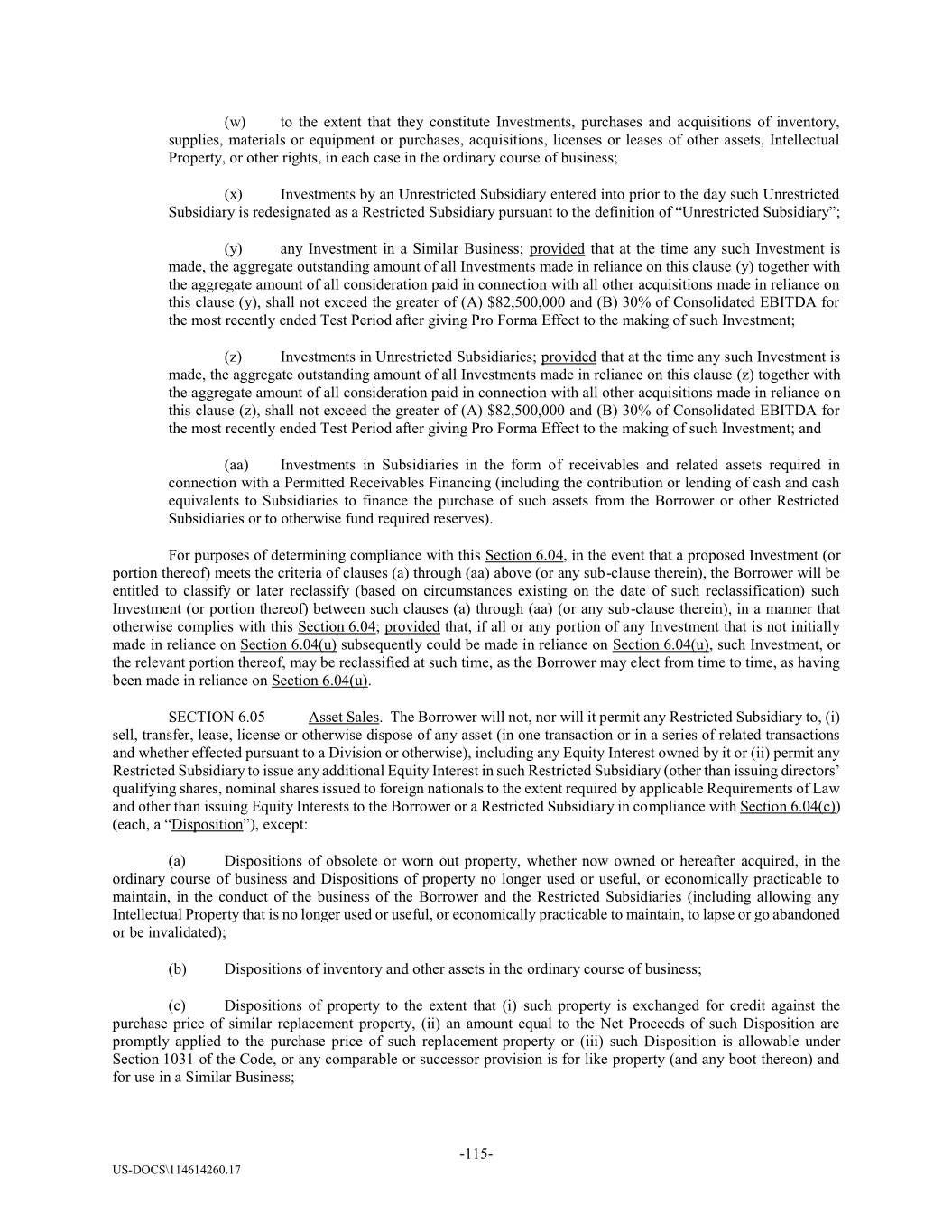 (w) to the extent that they constitute Investments, purchases and acquisitions of inventory, supplies, materials or equipment or purchases, acquisitions, licenses or leases of other assets, Intellectual Property, or other rights, in each case in the ordinary course of business; (x) Investments by an Unrestricted Subsidiary entered into prior to the day such Unrestricted Subsidiary is redesignated as a Restricted Subsidiary pursuant to the defi (y) any Investment in a Similar Business; provided that at the time any such Investment is made, the aggregate outstanding amount of all Investments made in reliance on this clause (y) together with the aggregate amount of all consideration paid in connection with all other acquisitions made in reliance on this clause (y), shall not exceed the greater of (A) $82,500,000 and (B) 30% of Consolidated EBITDA for the most recently ended Test Period after giving Pro Forma Effect to the making of such Investment; (z) Investments in Unrestricted Subsidiaries; provided that at the time any such Investment is made, the aggregate outstanding amount of all Investments made in reliance on this clause (z) together with the aggregate amount of all consideration paid in connection with all other acquisitions made in reliance on this clause (z), shall not exceed the greater of (A) $82,500,000 and (B) 30% of Consolidated EBITDA for the most recently ended Test Period after giving Pro Forma Effect to the making of such Investment; and (aa) Investments in Subsidiaries in the form of receivables and related assets required in connection with a Permitted Receivables Financing (including the contribution or lending of cash and cash equivalents to Subsidiaries to finance the purchase of such assets from the Borrower or other Restricted Subsidiaries or to otherwise fund required reserves). For purposes of determining compliance with this Section 6.04, in the event that a proposed Investment (or portion thereof) meets the criteria of clauses (a) through (aa) above (or any sub-clause therein), the Borrower will be entitled to classify or later reclassify (based on circumstances existing on the date of such reclassification) such Investment (or portion thereof) between such clauses (a) through (aa) (or any sub-clause therein), in a manner that otherwise complies with this Section 6.04; provided that, if all or any portion of any Investment that is not initially made in reliance on Section 6.04(u) subsequently could be made in reliance on Section 6.04(u), such Investment, or the relevant portion thereof, may be reclassified at such time, as the Borrower may elect from time to time, as having been made in reliance on Section 6.04(u). SECTION 6.05 Asset Sales. The Borrower will not, nor will it permit any Restricted Subsidiary to, (i) sell, transfer, lease, license or otherwise dispose of any asset (in one transaction or in a series of related transactions and whether effected pursuant to a Division or otherwise), including any Equity Interest owned by it or (ii) permit any Restricted Subsidiary to issue any additional Equity Interest in such Rest qualifying shares, nominal shares issued to foreign nationals to the extent required by applicable Requirements of Law and other than issuing Equity Interests to the Borrower or a Restricted Subsidiary in compliance with Section 6.04(c)) Disposition (a) Dispositions of obsolete or worn out property, whether now owned or hereafter acquired, in the ordinary course of business and Dispositions of property no longer used or useful, or economically practicable to maintain, in the conduct of the business of the Borrower and the Restricted Subsidiaries (including allowing any Intellectual Property that is no longer used or useful, or economically practicable to maintain, to lapse or go abandoned or be invalidated); (b) Dispositions of inventory and other assets in the ordinary course of business; (c) Dispositions of property to the extent that (i) such property is exchanged for credit against the purchase price of similar replacement property, (ii) an amount equal to the Net Proceeds of such Disposition are promptly applied to the purchase price of such replacement property or (iii) such Disposition is allowable under Section 1031 of the Code, or any comparable or successor provision is for like property (and any boot thereon) and for use in a Similar Business; -115- US-DOCS\114614260.17