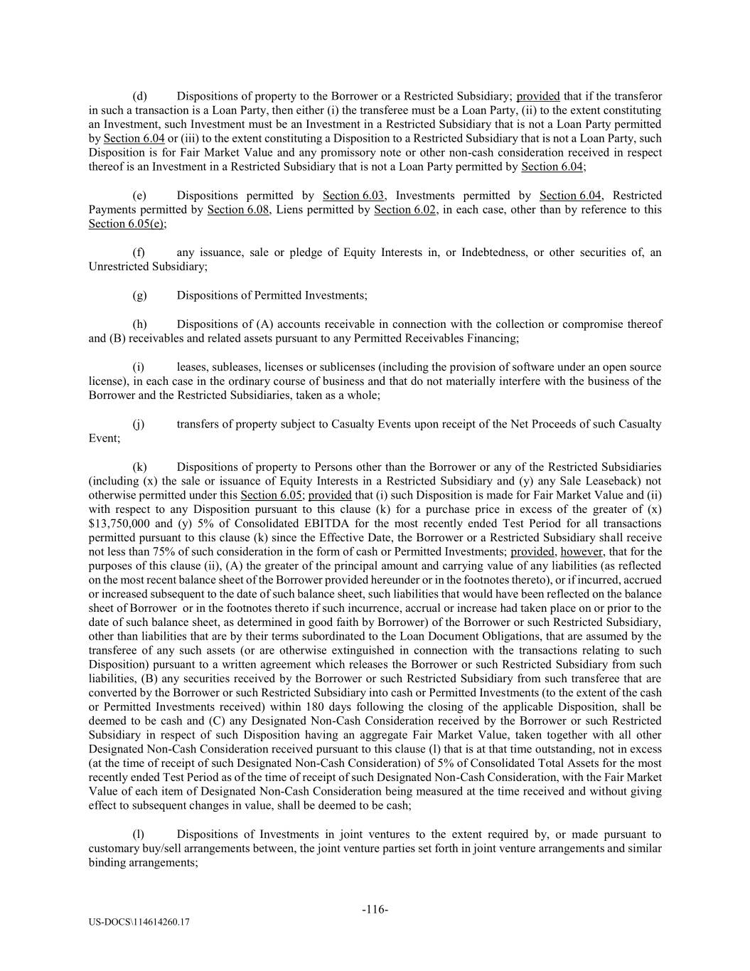(d) Dispositions of property to the Borrower or a Restricted Subsidiary; provided that if the transferor in such a transaction is a Loan Party, then either (i) the transferee must be a Loan Party, (ii) to the extent constituting an Investment, such Investment must be an Investment in a Restricted Subsidiary that is not a Loan Party permitted by Section 6.04 or (iii) to the extent constituting a Disposition to a Restricted Subsidiary that is not a Loan Party, such Disposition is for Fair Market Value and any promissory note or other non-cash consideration received in respect thereof is an Investment in a Restricted Subsidiary that is not a Loan Party permitted by Section 6.04; (e) Dispositions permitted by Section 6.03, Investments permitted by Section 6.04, Restricted Payments permitted by Section 6.08, Liens permitted by Section 6.02, in each case, other than by reference to this Section 6.05(e); (f) any issuance, sale or pledge of Equity Interests in, or Indebtedness, or other securities of, an Unrestricted Subsidiary; (g) Dispositions of Permitted Investments; (h) Dispositions of (A) accounts receivable in connection with the collection or compromise thereof and (B) receivables and related assets pursuant to any Permitted Receivables Financing; (i) leases, subleases, licenses or sublicenses (including the provision of software under an open source license), in each case in the ordinary course of business and that do not materially interfere with the business of the Borrower and the Restricted Subsidiaries, taken as a whole; (j) transfers of property subject to Casualty Events upon receipt of the Net Proceeds of such Casualty Event; (k) Dispositions of property to Persons other than the Borrower or any of the Restricted Subsidiaries (including (x) the sale or issuance of Equity Interests in a Restricted Subsidiary and (y) any Sale Leaseback) not otherwise permitted under this Section 6.05; provided that (i) such Disposition is made for Fair Market Value and (ii) with respect to any Disposition pursuant to this clause (k) for a purchase price in excess of the greater of (x) $13,750,000 and (y) 5% of Consolidated EBITDA for the most recently ended Test Period for all transactions permitted pursuant to this clause (k) since the Effective Date, the Borrower or a Restricted Subsidiary shall receive not less than 75% of such consideration in the form of cash or Permitted Investments; provided, however, that for the purposes of this clause (ii), (A) the greater of the principal amount and carrying value of any liabilities (as reflected on the most recent balance sheet of the Borrower provided hereunder or in the footnotes thereto), or if incurred, accrued or increased subsequent to the date of such balance sheet, such liabilities that would have been reflected on the balance sheet of Borrower or in the footnotes thereto if such incurrence, accrual or increase had taken place on or prior to the date of such balance sheet, as determined in good faith by Borrower) of the Borrower or such Restricted Subsidiary, other than liabilities that are by their terms subordinated to the Loan Document Obligations, that are assumed by the transferee of any such assets (or are otherwise extinguished in connection with the transactions relating to such Disposition) pursuant to a written agreement which releases the Borrower or such Restricted Subsidiary from such liabilities, (B) any securities received by the Borrower or such Restricted Subsidiary from such transferee that are converted by the Borrower or such Restricted Subsidiary into cash or Permitted Investments (to the extent of the cash or Permitted Investments received) within 180 days following the closing of the applicable Disposition, shall be deemed to be cash and (C) any Designated Non-Cash Consideration received by the Borrower or such Restricted Subsidiary in respect of such Disposition having an aggregate Fair Market Value, taken together with all other Designated Non-Cash Consideration received pursuant to this clause (l) that is at that time outstanding, not in excess (at the time of receipt of such Designated Non-Cash Consideration) of 5% of Consolidated Total Assets for the most recently ended Test Period as of the time of receipt of such Designated Non-Cash Consideration, with the Fair Market Value of each item of Designated Non-Cash Consideration being measured at the time received and without giving effect to subsequent changes in value, shall be deemed to be cash; (l) Dispositions of Investments in joint ventures to the extent required by, or made pursuant to customary buy/sell arrangements between, the joint venture parties set forth in joint venture arrangements and similar binding arrangements; -116- US-DOCS\114614260.17