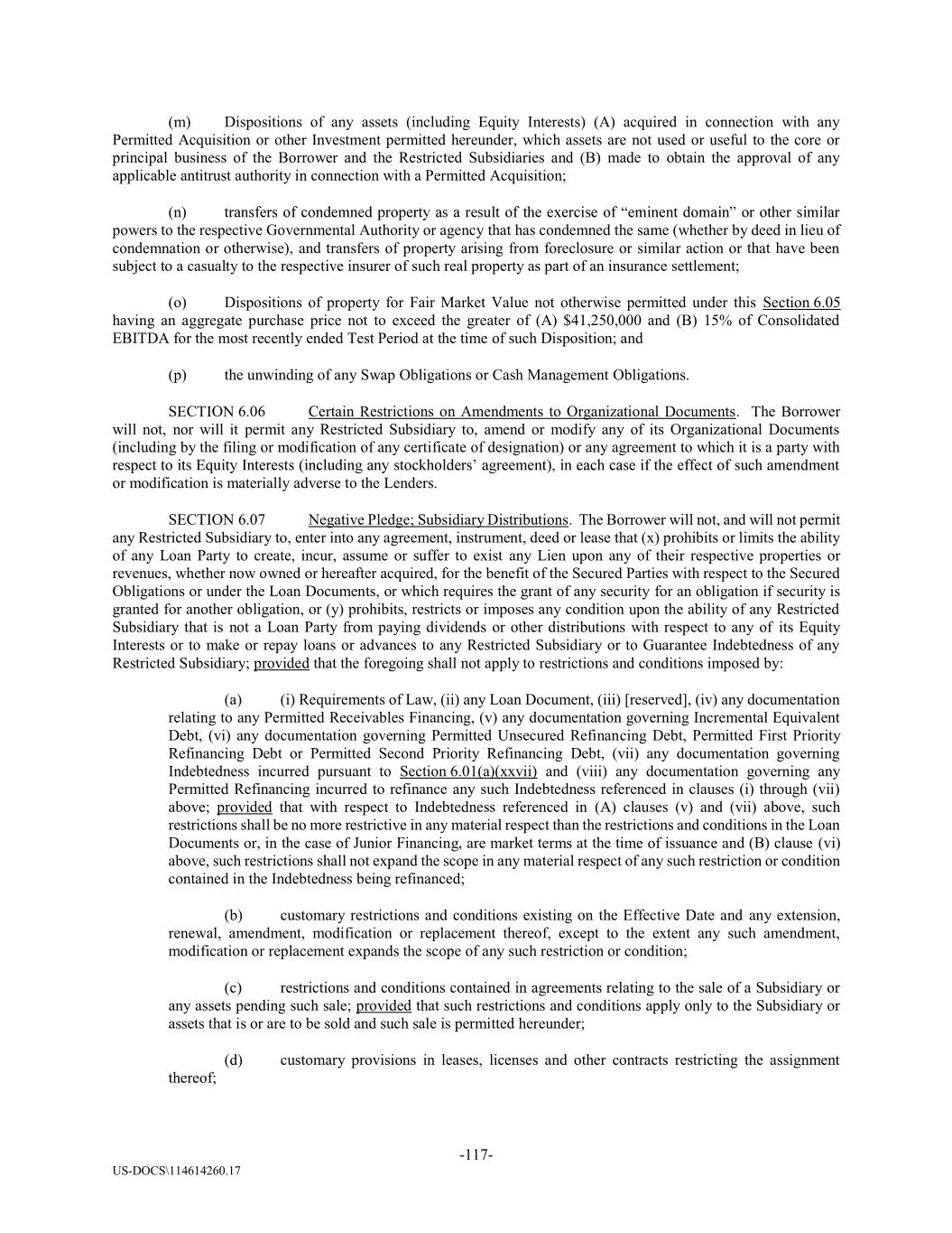 (m) Dispositions of any assets (including Equity Interests) (A) acquired in connection with any Permitted Acquisition or other Investment permitted hereunder, which assets are not used or useful to the core or principal business of the Borrower and the Restricted Subsidiaries and (B) made to obtain the approval of any applicable antitrust authority in connection with a Permitted Acquisition; (n) powers to the respective Governmental Authority or agency that has condemned the same (whether by deed in lieu of condemnation or otherwise), and transfers of property arising from foreclosure or similar action or that have been subject to a casualty to the respective insurer of such real property as part of an insurance settlement; (o) Dispositions of property for Fair Market Value not otherwise permitted under this Section 6.05 having an aggregate purchase price not to exceed the greater of (A) $41,250,000 and (B) 15% of Consolidated EBITDA for the most recently ended Test Period at the time of such Disposition; and (p) the unwinding of any Swap Obligations or Cash Management Obligations. SECTION 6.06 Certain Restrictions on Amendments to Organizational Documents. The Borrower will not, nor will it permit any Restricted Subsidiary to, amend or modify any of its Organizational Documents (including by the filing or modification of any certificate of designation) or any agreement to which it is a party with or modification is materially adverse to the Lenders. SECTION 6.07 Negative Pledge; Subsidiary Distributions. The Borrower will not, and will not permit any Restricted Subsidiary to, enter into any agreement, instrument, deed or lease that (x) prohibits or limits the ability of any Loan Party to create, incur, assume or suffer to exist any Lien upon any of their respective properties or revenues, whether now owned or hereafter acquired, for the benefit of the Secured Parties with respect to the Secured Obligations or under the Loan Documents, or which requires the grant of any security for an obligation if security is granted for another obligation, or (y) prohibits, restricts or imposes any condition upon the ability of any Restricted Subsidiary that is not a Loan Party from paying dividends or other distributions with respect to any of its Equity Interests or to make or repay loans or advances to any Restricted Subsidiary or to Guarantee Indebtedness of any Restricted Subsidiary; provided that the foregoing shall not apply to restrictions and conditions imposed by: (a) (i) Requirements of Law, (ii) any Loan Document, (iii) [reserved], (iv) any documentation relating to any Permitted Receivables Financing, (v) any documentation governing Incremental Equivalent Debt, (vi) any documentation governing Permitted Unsecured Refinancing Debt, Permitted First Priority Refinancing Debt or Permitted Second Priority Refinancing Debt, (vii) any documentation governing Indebtedness incurred pursuant to Section 6.01(a)(xxvii) and (viii) any documentation governing any Permitted Refinancing incurred to refinance any such Indebtedness referenced in clauses (i) through (vii) above; provided that with respect to Indebtedness referenced in (A) clauses (v) and (vii) above, such restrictions shall be no more restrictive in any material respect than the restrictions and conditions in the Loan Documents or, in the case of Junior Financing, are market terms at the time of issuance and (B) clause (vi) above, such restrictions shall not expand the scope in any material respect of any such restriction or condition contained in the Indebtedness being refinanced; (b) customary restrictions and conditions existing on the Effective Date and any extension, renewal, amendment, modification or replacement thereof, except to the extent any such amendment, modification or replacement expands the scope of any such restriction or condition; (c) restrictions and conditions contained in agreements relating to the sale of a Subsidiary or any assets pending such sale; provided that such restrictions and conditions apply only to the Subsidiary or assets that is or are to be sold and such sale is permitted hereunder; (d) customary provisions in leases, licenses and other contracts restricting the assignment thereof; -117- US-DOCS\114614260.17