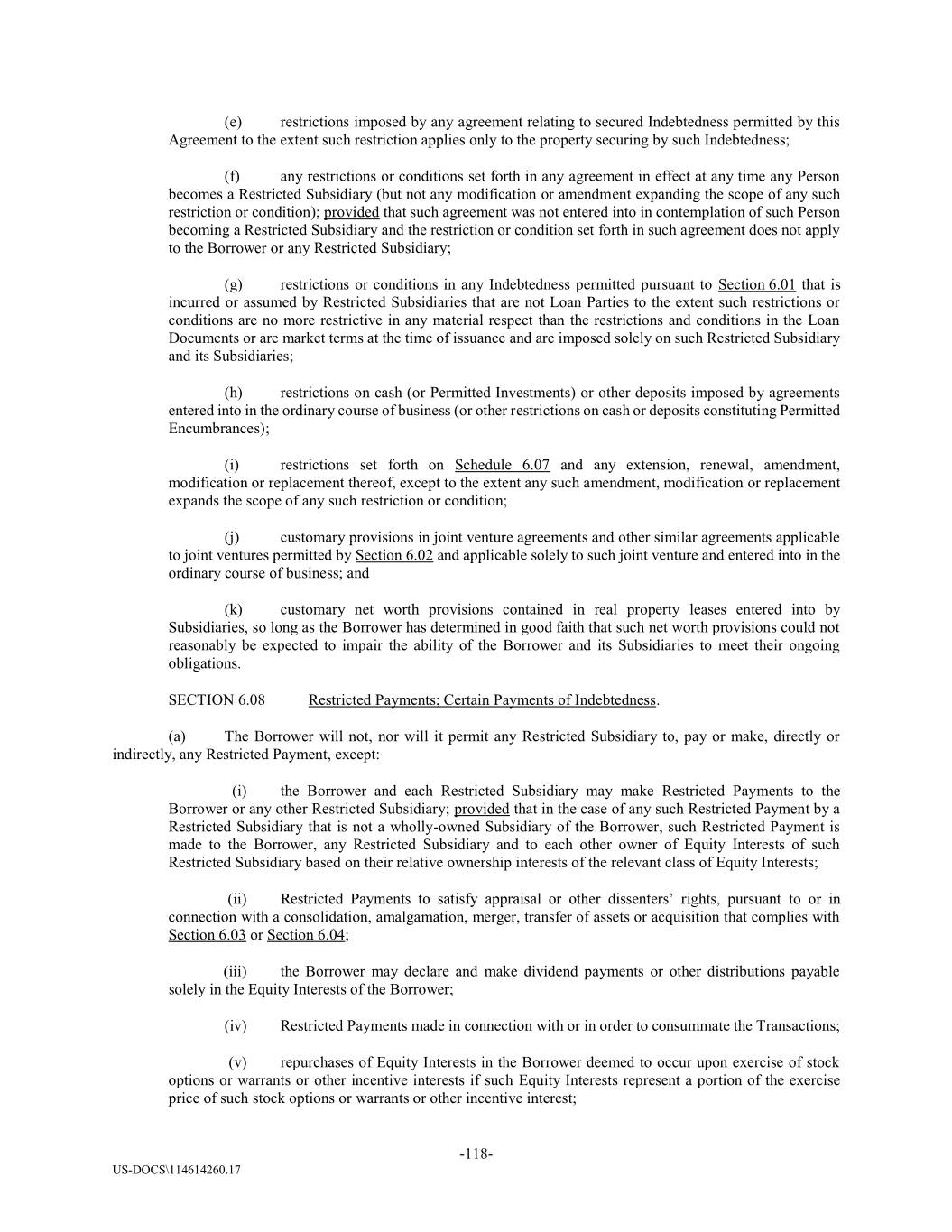 (e) restrictions imposed by any agreement relating to secured Indebtedness permitted by this Agreement to the extent such restriction applies only to the property securing by such Indebtedness; (f) any restrictions or conditions set forth in any agreement in effect at any time any Person becomes a Restricted Subsidiary (but not any modification or amendment expanding the scope of any such restriction or condition); provided that such agreement was not entered into in contemplation of such Person becoming a Restricted Subsidiary and the restriction or condition set forth in such agreement does not apply to the Borrower or any Restricted Subsidiary; (g) restrictions or conditions in any Indebtedness permitted pursuant to Section 6.01 that is incurred or assumed by Restricted Subsidiaries that are not Loan Parties to the extent such restrictions or conditions are no more restrictive in any material respect than the restrictions and conditions in the Loan Documents or are market terms at the time of issuance and are imposed solely on such Restricted Subsidiary and its Subsidiaries; (h) restrictions on cash (or Permitted Investments) or other deposits imposed by agreements entered into in the ordinary course of business (or other restrictions on cash or deposits constituting Permitted Encumbrances); (i) restrictions set forth on Schedule 6.07 and any extension, renewal, amendment, modification or replacement thereof, except to the extent any such amendment, modification or replacement expands the scope of any such restriction or condition; (j) customary provisions in joint venture agreements and other similar agreements applicable to joint ventures permitted by Section 6.02 and applicable solely to such joint venture and entered into in the ordinary course of business; and (k) customary net worth provisions contained in real property leases entered into by Subsidiaries, so long as the Borrower has determined in good faith that such net worth provisions could not reasonably be expected to impair the ability of the Borrower and its Subsidiaries to meet their ongoing obligations. SECTION 6.08 Restricted Payments; Certain Payments of Indebtedness. (a) The Borrower will not, nor will it permit any Restricted Subsidiary to, pay or make, directly or indirectly, any Restricted Payment, except: (i) the Borrower and each Restricted Subsidiary may make Restricted Payments to the Borrower or any other Restricted Subsidiary; provided that in the case of any such Restricted Payment by a Restricted Subsidiary that is not a wholly-owned Subsidiary of the Borrower, such Restricted Payment is made to the Borrower, any Restricted Subsidiary and to each other owner of Equity Interests of such Restricted Subsidiary based on their relative ownership interests of the relevant class of Equity Interests; (ii) to or in connection with a consolidation, amalgamation, merger, transfer of assets or acquisition that complies with Section 6.03 or Section 6.04; (iii) the Borrower may declare and make dividend payments or other distributions payable solely in the Equity Interests of the Borrower; (iv) Restricted Payments made in connection with or in order to consummate the Transactions; (v) repurchases of Equity Interests in the Borrower deemed to occur upon exercise of stock options or warrants or other incentive interests if such Equity Interests represent a portion of the exercise price of such stock options or warrants or other incentive interest; -118- US-DOCS\114614260.17