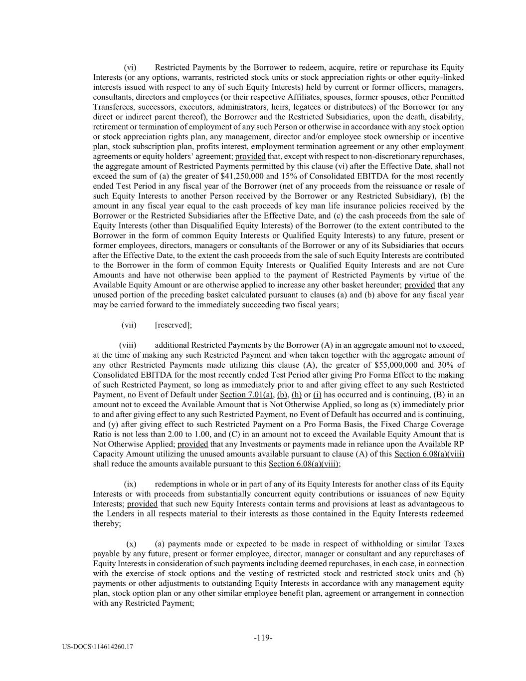 (vi) Restricted Payments by the Borrower to redeem, acquire, retire or repurchase its Equity Interests (or any options, warrants, restricted stock units or stock appreciation rights or other equity-linked interests issued with respect to any of such Equity Interests) held by current or former officers, managers, consultants, directors and employees (or their respective Affiliates, spouses, former spouses, other Permitted Transferees, successors, executors, administrators, heirs, legatees or distributees) of the Borrower (or any direct or indirect parent thereof), the Borrower and the Restricted Subsidiaries, upon the death, disability, retirement or termination of employment of any such Person or otherwise in accordance with any stock option or stock appreciation rights plan, any management, director and/or employee stock ownership or incentive plan, stock subscription plan, profits interest, employment termination agreement or any other employment provided that, except with respect to non-discretionary repurchases, the aggregate amount of Restricted Payments permitted by this clause (vi) after the Effective Date, shall not exceed the sum of (a) the greater of $41,250,000 and 15% of Consolidated EBITDA for the most recently ended Test Period in any fiscal year of the Borrower (net of any proceeds from the reissuance or resale of such Equity Interests to another Person received by the Borrower or any Restricted Subsidiary), (b) the amount in any fiscal year equal to the cash proceeds of key man life insurance policies received by the Borrower or the Restricted Subsidiaries after the Effective Date, and (c) the cash proceeds from the sale of Equity Interests (other than Disqualified Equity Interests) of the Borrower (to the extent contributed to the Borrower in the form of common Equity Interests or Qualified Equity Interests) to any future, present or former employees, directors, managers or consultants of the Borrower or any of its Subsidiaries that occurs after the Effective Date, to the extent the cash proceeds from the sale of such Equity Interests are contributed to the Borrower in the form of common Equity Interests or Qualified Equity Interests and are not Cure Amounts and have not otherwise been applied to the payment of Restricted Payments by virtue of the Available Equity Amount or are otherwise applied to increase any other basket hereunder; provided that any unused portion of the preceding basket calculated pursuant to clauses (a) and (b) above for any fiscal year may be carried forward to the immediately succeeding two fiscal years; (vii) [reserved]; (viii) additional Restricted Payments by the Borrower (A) in an aggregate amount not to exceed, at the time of making any such Restricted Payment and when taken together with the aggregate amount of any other Restricted Payments made utilizing this clause (A), the greater of $55,000,000 and 30% of Consolidated EBITDA for the most recently ended Test Period after giving Pro Forma Effect to the making of such Restricted Payment, so long as immediately prior to and after giving effect to any such Restricted Payment, no Event of Default under Section 7.01(a), (b), (h) or (i) has occurred and is continuing, (B) in an amount not to exceed the Available Amount that is Not Otherwise Applied, so long as (x) immediately prior to and after giving effect to any such Restricted Payment, no Event of Default has occurred and is continuing, and (y) after giving effect to such Restricted Payment on a Pro Forma Basis, the Fixed Charge Coverage Ratio is not less than 2.00 to 1.00, and (C) in an amount not to exceed the Available Equity Amount that is Not Otherwise Applied; provided that any Investments or payments made in reliance upon the Available RP Capacity Amount utilizing the unused amounts available pursuant to clause (A) of this Section 6.08(a)(viii) shall reduce the amounts available pursuant to this Section 6.08(a)(viii); (ix) redemptions in whole or in part of any of its Equity Interests for another class of its Equity Interests or with proceeds from substantially concurrent equity contributions or issuances of new Equity Interests; provided that such new Equity Interests contain terms and provisions at least as advantageous to the Lenders in all respects material to their interests as those contained in the Equity Interests redeemed thereby; (x) (a) payments made or expected to be made in respect of withholding or similar Taxes payable by any future, present or former employee, director, manager or consultant and any repurchases of Equity Interests in consideration of such payments including deemed repurchases, in each case, in connection with the exercise of stock options and the vesting of restricted stock and restricted stock units and (b) payments or other adjustments to outstanding Equity Interests in accordance with any management equity plan, stock option plan or any other similar employee benefit plan, agreement or arrangement in connection with any Restricted Payment; -119- US-DOCS\114614260.17