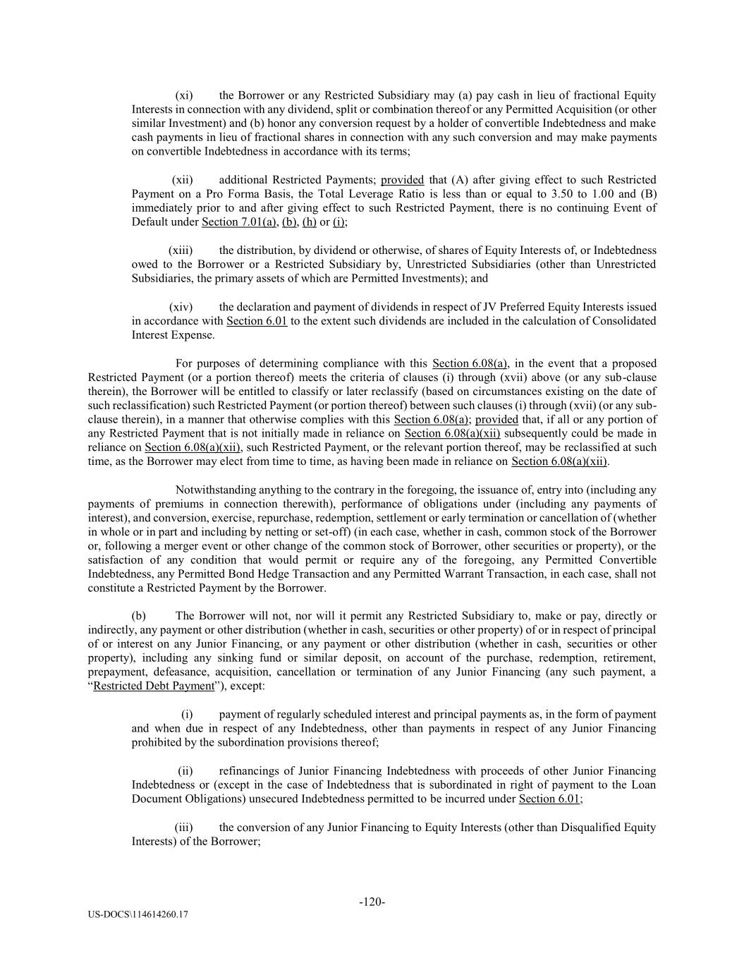 (xi) the Borrower or any Restricted Subsidiary may (a) pay cash in lieu of fractional Equity Interests in connection with any dividend, split or combination thereof or any Permitted Acquisition (or other similar Investment) and (b) honor any conversion request by a holder of convertible Indebtedness and make cash payments in lieu of fractional shares in connection with any such conversion and may make payments on convertible Indebtedness in accordance with its terms; (xii) additional Restricted Payments; provided that (A) after giving effect to such Restricted Payment on a Pro Forma Basis, the Total Leverage Ratio is less than or equal to 3.50 to 1.00 and (B) immediately prior to and after giving effect to such Restricted Payment, there is no continuing Event of Default under Section 7.01(a), (b), (h) or (i); (xiii) the distribution, by dividend or otherwise, of shares of Equity Interests of, or Indebtedness owed to the Borrower or a Restricted Subsidiary by, Unrestricted Subsidiaries (other than Unrestricted Subsidiaries, the primary assets of which are Permitted Investments); and (xiv) the declaration and payment of dividends in respect of JV Preferred Equity Interests issued in accordance with Section 6.01 to the extent such dividends are included in the calculation of Consolidated Interest Expense. For purposes of determining compliance with this Section 6.08(a), in the event that a proposed Restricted Payment (or a portion thereof) meets the criteria of clauses (i) through (xvii) above (or any sub-clause therein), the Borrower will be entitled to classify or later reclassify (based on circumstances existing on the date of such reclassification) such Restricted Payment (or portion thereof) between such clauses (i) through (xvii) (or any sub- clause therein), in a manner that otherwise complies with this Section 6.08(a); provided that, if all or any portion of any Restricted Payment that is not initially made in reliance on Section 6.08(a)(xii) subsequently could be made in reliance on Section 6.08(a)(xii), such Restricted Payment, or the relevant portion thereof, may be reclassified at such time, as the Borrower may elect from time to time, as having been made in reliance on Section 6.08(a)(xii). Notwithstanding anything to the contrary in the foregoing, the issuance of, entry into (including any payments of premiums in connection therewith), performance of obligations under (including any payments of interest), and conversion, exercise, repurchase, redemption, settlement or early termination or cancellation of (whether in whole or in part and including by netting or set-off) (in each case, whether in cash, common stock of the Borrower or, following a merger event or other change of the common stock of Borrower, other securities or property), or the satisfaction of any condition that would permit or require any of the foregoing, any Permitted Convertible Indebtedness, any Permitted Bond Hedge Transaction and any Permitted Warrant Transaction, in each case, shall not constitute a Restricted Payment by the Borrower. (b) The Borrower will not, nor will it permit any Restricted Subsidiary to, make or pay, directly or indirectly, any payment or other distribution (whether in cash, securities or other property) of or in respect of principal of or interest on any Junior Financing, or any payment or other distribution (whether in cash, securities or other property), including any sinking fund or similar deposit, on account of the purchase, redemption, retirement, prepayment, defeasance, acquisition, cancellation or termination of any Junior Financing (any such payment, a Restricted Debt Payment (i) payment of regularly scheduled interest and principal payments as, in the form of payment and when due in respect of any Indebtedness, other than payments in respect of any Junior Financing prohibited by the subordination provisions thereof; (ii) refinancings of Junior Financing Indebtedness with proceeds of other Junior Financing Indebtedness or (except in the case of Indebtedness that is subordinated in right of payment to the Loan Document Obligations) unsecured Indebtedness permitted to be incurred under Section 6.01; (iii) the conversion of any Junior Financing to Equity Interests (other than Disqualified Equity Interests) of the Borrower; -120- US-DOCS\114614260.17