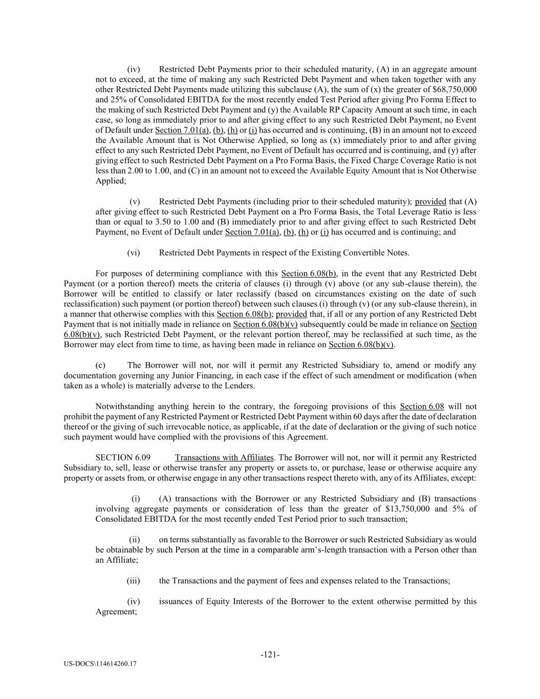 (iv) Restricted Debt Payments prior to their scheduled maturity, (A) in an aggregate amount not to exceed, at the time of making any such Restricted Debt Payment and when taken together with any other Restricted Debt Payments made utilizing this subclause (A), the sum of (x) the greater of $68,750,000 and 25% of Consolidated EBITDA for the most recently ended Test Period after giving Pro Forma Effect to the making of such Restricted Debt Payment and (y) the Available RP Capacity Amount at such time, in each case, so long as immediately prior to and after giving effect to any such Restricted Debt Payment, no Event of Default under Section 7.01(a), (b), (h) or (i) has occurred and is continuing, (B) in an amount not to exceed the Available Amount that is Not Otherwise Applied, so long as (x) immediately prior to and after giving effect to any such Restricted Debt Payment, no Event of Default has occurred and is continuing, and (y) after giving effect to such Restricted Debt Payment on a Pro Forma Basis, the Fixed Charge Coverage Ratio is not less than 2.00 to 1.00, and (C) in an amount not to exceed the Available Equity Amount that is Not Otherwise Applied; (v) Restricted Debt Payments (including prior to their scheduled maturity); provided that (A) after giving effect to such Restricted Debt Payment on a Pro Forma Basis, the Total Leverage Ratio is less than or equal to 3.50 to 1.00 and (B) immediately prior to and after giving effect to such Restricted Debt Payment, no Event of Default under Section 7.01(a), (b), (h) or (i) has occurred and is continuing; and (vi) Restricted Debt Payments in respect of the Existing Convertible Notes. For purposes of determining compliance with this Section 6.08(b), in the event that any Restricted Debt Payment (or a portion thereof) meets the criteria of clauses (i) through (v) above (or any sub-clause therein), the Borrower will be entitled to classify or later reclassify (based on circumstances existing on the date of such reclassification) such payment (or portion thereof) between such clauses (i) through (v) (or any sub-clause therein), in a manner that otherwise complies with this Section 6.08(b); provided that, if all or any portion of any Restricted Debt Payment that is not initially made in reliance on Section 6.08(b)(v) subsequently could be made in reliance on Section 6.08(b)(v), such Restricted Debt Payment, or the relevant portion thereof, may be reclassified at such time, as the Borrower may elect from time to time, as having been made in reliance on Section 6.08(b)(v). (c) The Borrower will not, nor will it permit any Restricted Subsidiary to, amend or modify any documentation governing any Junior Financing, in each case if the effect of such amendment or modification (when taken as a whole) is materially adverse to the Lenders. Notwithstanding anything herein to the contrary, the foregoing provisions of this Section 6.08 will not prohibit the payment of any Restricted Payment or Restricted Debt Payment within 60 days after the date of declaration thereof or the giving of such irrevocable notice, as applicable, if at the date of declaration or the giving of such notice such payment would have complied with the provisions of this Agreement. SECTION 6.09 Transactions with Affiliates. The Borrower will not, nor will it permit any Restricted Subsidiary to, sell, lease or otherwise transfer any property or assets to, or purchase, lease or otherwise acquire any property or assets from, or otherwise engage in any other transactions respect thereto with, any of its Affiliates, except: (i) (A) transactions with the Borrower or any Restricted Subsidiary and (B) transactions involving aggregate payments or consideration of less than the greater of $13,750,000 and 5% of Consolidated EBITDA for the most recently ended Test Period prior to such transaction; (ii) on terms substantially as favorable to the Borrower or such Restricted Subsidiary as would be obtai -length transaction with a Person other than an Affiliate; (iii) the Transactions and the payment of fees and expenses related to the Transactions; (iv) issuances of Equity Interests of the Borrower to the extent otherwise permitted by this Agreement; -121- US-DOCS\114614260.17
