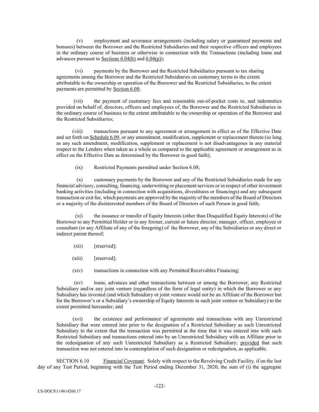 (v) employment and severance arrangements (including salary or guaranteed payments and bonuses) between the Borrower and the Restricted Subsidiaries and their respective officers and employees in the ordinary course of business or otherwise in connection with the Transactions (including loans and advances pursuant to Sections 6.04(b) and 6.04(p)); (vi) payments by the Borrower and the Restricted Subsidiaries pursuant to tax sharing agreements among the Borrower and the Restricted Subsidiaries on customary terms to the extent attributable to the ownership or operation of the Borrower and the Restricted Subsidiaries, to the extent payments are permitted by Section 6.08; (vii) the payment of customary fees and reasonable out-of-pocket costs to, and indemnities provided on behalf of, directors, officers and employees of, the Borrower and the Restricted Subsidiaries in the ordinary course of business to the extent attributable to the ownership or operation of the Borrower and the Restricted Subsidiaries; (viii) transactions pursuant to any agreement or arrangement in effect as of the Effective Date and set forth on Schedule 6.09, or any amendment, modification, supplement or replacement thereto (so long as any such amendment, modification, supplement or replacement is not disadvantageous in any material respect to the Lenders when taken as a whole as compared to the applicable agreement or arrangement as in effect on the Effective Date as determined by the Borrower in good faith); (ix) Restricted Payments permitted under Section 6.08; (x) customary payments by the Borrower and any of the Restricted Subsidiaries made for any financial advisory, consulting, financing, underwriting or placement services or in respect of other investment banking activities (including in connection with acquisitions, divestitures or financings) and any subsequent transaction or exit fee, which payments are approved by the majority of the members of the Board of Directors or a majority of the disinterested members of the Board of Directors of such Person in good faith; (xi) the issuance or transfer of Equity Interests (other than Disqualified Equity Interests) of the Borrower to any Permitted Holder or to any former, current or future director, manager, officer, employee or consultant (or any Affiliate of any of the foregoing) of the Borrower, any of the Subsidiaries or any direct or indirect parent thereof; (xii) [reserved]; (xiii) [reserved]; (xiv) transactions in connection with any Permitted Receivables Financing; (xv) loans, advances and other transactions between or among the Borrower, any Restricted Subsidiary and/or any joint venture (regardless of the form of legal entity) in which the Borrower or any Subsidiary has invested (and which Subsidiary or joint venture would not be an Affiliate of the Borrower but extent permitted hereunder; and (xvi) the existence and performance of agreements and transactions with any Unrestricted Subsidiary that were entered into prior to the designation of a Restricted Subsidiary as such Unrestricted Subsidiary to the extent that the transaction was permitted at the time that it was entered into with such Restricted Subsidiary and transactions entered into by an Unrestricted Subsidiary with an Affiliate prior to the redesignation of any such Unrestricted Subsidiary as a Restricted Subsidiary; provided that such transaction was not entered into in contemplation of such designation or redesignation, as applicable. SECTION 6.10 Financial Covenant. Solely with respect to the Revolving Credit Facility, if on the last day of any Test Period, beginning with the Test Period ending December 31, 2020, the sum of (i) the aggregate -122- US-DOCS\114614260.17