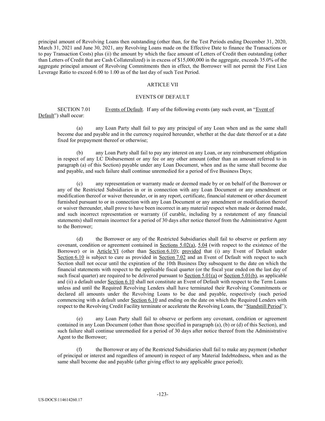 principal amount of Revolving Loans then outstanding (other than, for the Test Periods ending December 31, 2020, March 31, 2021 and June 30, 2021, any Revolving Loans made on the Effective Date to finance the Transactions or to pay Transaction Costs) plus (ii) the amount by which the face amount of Letters of Credit then outstanding (other than Letters of Credit that are Cash Collateralized) is in excess of $15,000,000 in the aggregate, exceeds 35.0% of the aggregate principal amount of Revolving Commitments then in effect, the Borrower will not permit the First Lien Leverage Ratio to exceed 6.00 to 1.00 as of the last day of such Test Period. ARTICLE VII EVENTS OF DEFAULT SECTION 7.01 Events of Default Event of Default (a) any Loan Party shall fail to pay any principal of any Loan when and as the same shall become due and payable and in the currency required hereunder, whether at the due date thereof or at a date fixed for prepayment thereof or otherwise; (b) any Loan Party shall fail to pay any interest on any Loan, or any reimbursement obligation in respect of any LC Disbursement or any fee or any other amount (other than an amount referred to in paragraph (a) of this Section) payable under any Loan Document, when and as the same shall become due and payable, and such failure shall continue unremedied for a period of five Business Days; (c) any representation or warranty made or deemed made by or on behalf of the Borrower or any of the Restricted Subsidiaries in or in connection with any Loan Document or any amendment or modification thereof or waiver thereunder, or in any report, certificate, financial statement or other document furnished pursuant to or in connection with any Loan Document or any amendment or modification thereof or waiver thereunder, shall prove to have been incorrect in any material respect when made or deemed made, and such incorrect representation or warranty (if curable, including by a restatement of any financial statements) shall remain incorrect for a period of 30 days after notice thereof from the Administrative Agent to the Borrower; (d) the Borrower or any of the Restricted Subsidiaries shall fail to observe or perform any covenant, condition or agreement contained in Sections 5.02(a), 5.04 (with respect to the existence of the Borrower) or in Article VI (other than Section 6.10); provided that (i) any Event of Default under Section 6.10 is subject to cure as provided in Section 7.02 and an Event of Default with respect to such Section shall not occur until the expiration of the 10th Business Day subsequent to the date on which the financial statements with respect to the applicable fiscal quarter (or the fiscal year ended on the last day of such fiscal quarter) are required to be delivered pursuant to Section 5.01(a) or Section 5.01(b), as applicable and (ii) a default under Section 6.10 shall not constitute an Event of Default with respect to the Term Loans unless and until the Required Revolving Lenders shall have terminated their Revolving Commitments or declared all amounts under the Revolving Loans to be due and payable, respectively (such period commencing with a default under Section 6.10 and ending on the date on which the Required Lenders with Standstill Period (e) any Loan Party shall fail to observe or perform any covenant, condition or agreement contained in any Loan Document (other than those specified in paragraph (a), (b) or (d) of this Section), and such failure shall continue unremedied for a period of 30 days after notice thereof from the Administrative Agent to the Borrower; (f) the Borrower or any of the Restricted Subsidiaries shall fail to make any payment (whether of principal or interest and regardless of amount) in respect of any Material Indebtedness, when and as the same shall become due and payable (after giving effect to any applicable grace period); -123- US-DOCS\114614260.17