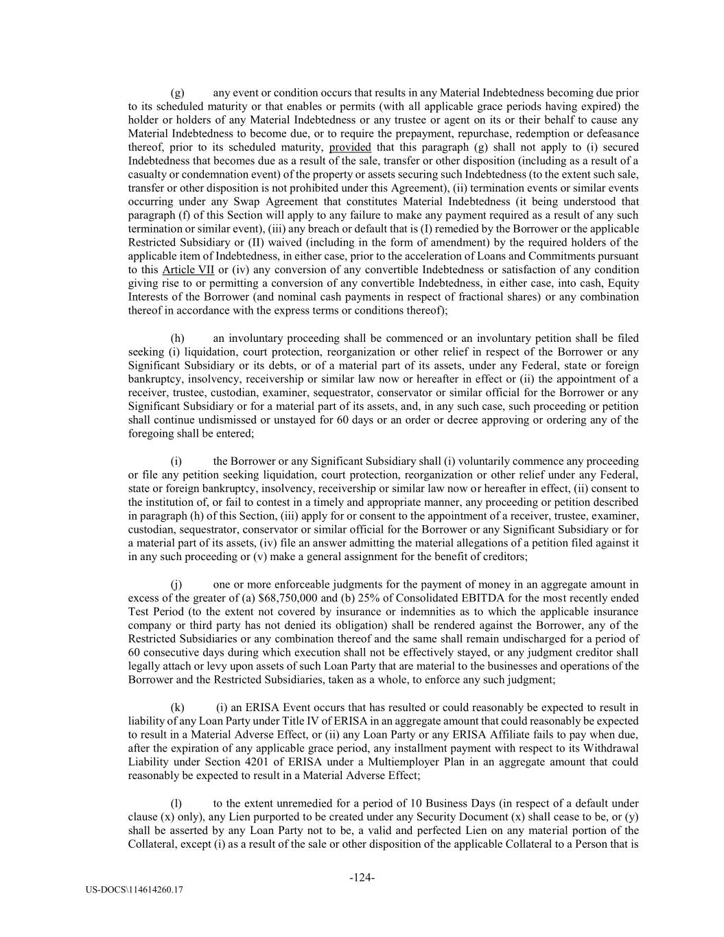 (g) any event or condition occurs that results in any Material Indebtedness becoming due prior to its scheduled maturity or that enables or permits (with all applicable grace periods having expired) the holder or holders of any Material Indebtedness or any trustee or agent on its or their behalf to cause any Material Indebtedness to become due, or to require the prepayment, repurchase, redemption or defeasance thereof, prior to its scheduled maturity, provided that this paragraph (g) shall not apply to (i) secured Indebtedness that becomes due as a result of the sale, transfer or other disposition (including as a result of a casualty or condemnation event) of the property or assets securing such Indebtedness (to the extent such sale, transfer or other disposition is not prohibited under this Agreement), (ii) termination events or similar events occurring under any Swap Agreement that constitutes Material Indebtedness (it being understood that paragraph (f) of this Section will apply to any failure to make any payment required as a result of any such termination or similar event), (iii) any breach or default that is (I) remedied by the Borrower or the applicable Restricted Subsidiary or (II) waived (including in the form of amendment) by the required holders of the applicable item of Indebtedness, in either case, prior to the acceleration of Loans and Commitments pursuant to this Article VII or (iv) any conversion of any convertible Indebtedness or satisfaction of any condition giving rise to or permitting a conversion of any convertible Indebtedness, in either case, into cash, Equity Interests of the Borrower (and nominal cash payments in respect of fractional shares) or any combination thereof in accordance with the express terms or conditions thereof); (h) an involuntary proceeding shall be commenced or an involuntary petition shall be filed seeking (i) liquidation, court protection, reorganization or other relief in respect of the Borrower or any Significant Subsidiary or its debts, or of a material part of its assets, under any Federal, state or foreign bankruptcy, insolvency, receivership or similar law now or hereafter in effect or (ii) the appointment of a receiver, trustee, custodian, examiner, sequestrator, conservator or similar official for the Borrower or any Significant Subsidiary or for a material part of its assets, and, in any such case, such proceeding or petition shall continue undismissed or unstayed for 60 days or an order or decree approving or ordering any of the foregoing shall be entered; (i) the Borrower or any Significant Subsidiary shall (i) voluntarily commence any proceeding or file any petition seeking liquidation, court protection, reorganization or other relief under any Federal, state or foreign bankruptcy, insolvency, receivership or similar law now or hereafter in effect, (ii) consent to the institution of, or fail to contest in a timely and appropriate manner, any proceeding or petition described in paragraph (h) of this Section, (iii) apply for or consent to the appointment of a receiver, trustee, examiner, custodian, sequestrator, conservator or similar official for the Borrower or any Significant Subsidiary or for a material part of its assets, (iv) file an answer admitting the material allegations of a petition filed against it in any such proceeding or (v) make a general assignment for the benefit of creditors; (j) one or more enforceable judgments for the payment of money in an aggregate amount in excess of the greater of (a) $68,750,000 and (b) 25% of Consolidated EBITDA for the most recently ended Test Period (to the extent not covered by insurance or indemnities as to which the applicable insurance company or third party has not denied its obligation) shall be rendered against the Borrower, any of the Restricted Subsidiaries or any combination thereof and the same shall remain undischarged for a period of 60 consecutive days during which execution shall not be effectively stayed, or any judgment creditor shall legally attach or levy upon assets of such Loan Party that are material to the businesses and operations of the Borrower and the Restricted Subsidiaries, taken as a whole, to enforce any such judgment; (k) (i) an ERISA Event occurs that has resulted or could reasonably be expected to result in liability of any Loan Party under Title IV of ERISA in an aggregate amount that could reasonably be expected to result in a Material Adverse Effect, or (ii) any Loan Party or any ERISA Affiliate fails to pay when due, after the expiration of any applicable grace period, any installment payment with respect to its Withdrawal Liability under Section 4201 of ERISA under a Multiemployer Plan in an aggregate amount that could reasonably be expected to result in a Material Adverse Effect; (l) to the extent unremedied for a period of 10 Business Days (in respect of a default under clause (x) only), any Lien purported to be created under any Security Document (x) shall cease to be, or (y) shall be asserted by any Loan Party not to be, a valid and perfected Lien on any material portion of the Collateral, except (i) as a result of the sale or other disposition of the applicable Collateral to a Person that is -124- US-DOCS\114614260.17