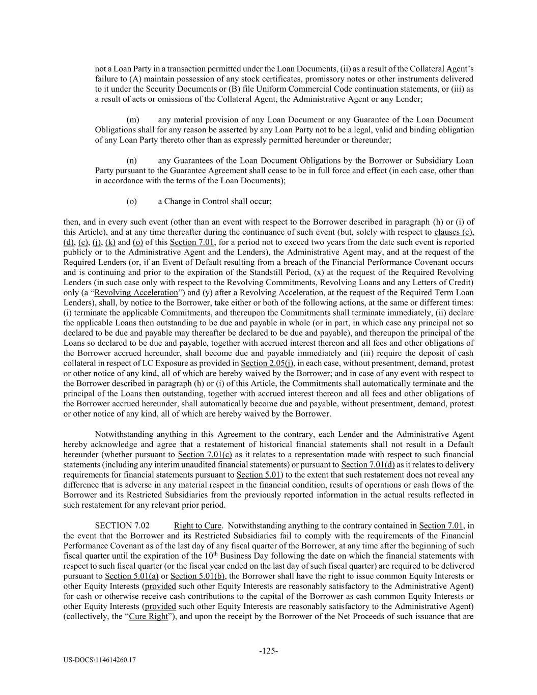 failure to (A) maintain possession of any stock certificates, promissory notes or other instruments delivered to it under the Security Documents or (B) file Uniform Commercial Code continuation statements, or (iii) as a result of acts or omissions of the Collateral Agent, the Administrative Agent or any Lender; (m) any material provision of any Loan Document or any Guarantee of the Loan Document Obligations shall for any reason be asserted by any Loan Party not to be a legal, valid and binding obligation of any Loan Party thereto other than as expressly permitted hereunder or thereunder; (n) any Guarantees of the Loan Document Obligations by the Borrower or Subsidiary Loan Party pursuant to the Guarantee Agreement shall cease to be in full force and effect (in each case, other than in accordance with the terms of the Loan Documents); (o) a Change in Control shall occur; then, and in every such event (other than an event with respect to the Borrower described in paragraph (h) or (i) of this Article), and at any time thereafter during the continuance of such event (but, solely with respect to clauses (c), (d), (e), (j), (k) and (o) of this Section 7.01, for a period not to exceed two years from the date such event is reported publicly or to the Administrative Agent and the Lenders), the Administrative Agent may, and at the request of the Required Lenders (or, if an Event of Default resulting from a breach of the Financial Performance Covenant occurs and is continuing and prior to the expiration of the Standstill Period, (x) at the request of the Required Revolving Lenders (in such case only with respect to the Revolving Commitments, Revolving Loans and any Letters of Credit) Revolving Acceleration evolving Acceleration, at the request of the Required Term Loan Lenders), shall, by notice to the Borrower, take either or both of the following actions, at the same or different times: (i) terminate the applicable Commitments, and thereupon the Commitments shall terminate immediately, (ii) declare the applicable Loans then outstanding to be due and payable in whole (or in part, in which case any principal not so declared to be due and payable may thereafter be declared to be due and payable), and thereupon the principal of the Loans so declared to be due and payable, together with accrued interest thereon and all fees and other obligations of the Borrower accrued hereunder, shall become due and payable immediately and (iii) require the deposit of cash collateral in respect of LC Exposure as provided in Section 2.05(j), in each case, without presentment, demand, protest or other notice of any kind, all of which are hereby waived by the Borrower; and in case of any event with respect to the Borrower described in paragraph (h) or (i) of this Article, the Commitments shall automatically terminate and the principal of the Loans then outstanding, together with accrued interest thereon and all fees and other obligations of the Borrower accrued hereunder, shall automatically become due and payable, without presentment, demand, protest or other notice of any kind, all of which are hereby waived by the Borrower. Notwithstanding anything in this Agreement to the contrary, each Lender and the Administrative Agent hereby acknowledge and agree that a restatement of historical financial statements shall not result in a Default hereunder (whether pursuant to Section 7.01(c) as it relates to a representation made with respect to such financial statements (including any interim unaudited financial statements) or pursuant to Section 7.01(d) as it relates to delivery requirements for financial statements pursuant to Section 5.01) to the extent that such restatement does not reveal any difference that is adverse in any material respect in the financial condition, results of operations or cash flows of the Borrower and its Restricted Subsidiaries from the previously reported information in the actual results reflected in such restatement for any relevant prior period. SECTION 7.02 Right to Cure. Notwithstanding anything to the contrary contained in Section 7.01, in the event that the Borrower and its Restricted Subsidiaries fail to comply with the requirements of the Financial Performance Covenant as of the last day of any fiscal quarter of the Borrower, at any time after the beginning of such fiscal quarter until the expiration of the 10th Business Day following the date on which the financial statements with respect to such fiscal quarter (or the fiscal year ended on the last day of such fiscal quarter) are required to be delivered pursuant to Section 5.01(a) or Section 5.01(b), the Borrower shall have the right to issue common Equity Interests or other Equity Interests (provided such other Equity Interests are reasonably satisfactory to the Administrative Agent) for cash or otherwise receive cash contributions to the capital of the Borrower as cash common Equity Interests or other Equity Interests (provided such other Equity Interests are reasonably satisfactory to the Administrative Agent) Cure Right -125- US-DOCS\114614260.17