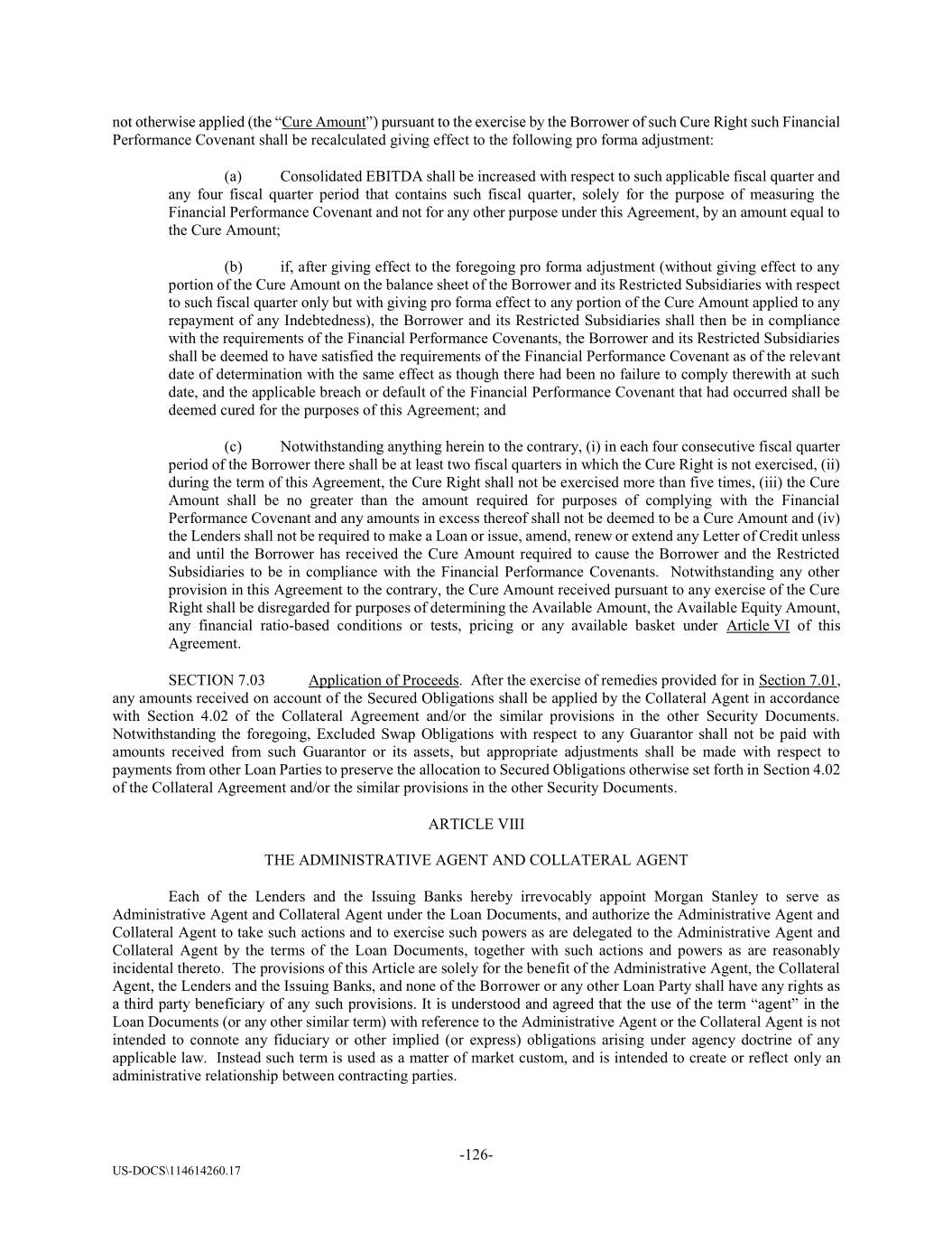 Cure Amount Performance Covenant shall be recalculated giving effect to the following pro forma adjustment: (a) Consolidated EBITDA shall be increased with respect to such applicable fiscal quarter and any four fiscal quarter period that contains such fiscal quarter, solely for the purpose of measuring the Financial Performance Covenant and not for any other purpose under this Agreement, by an amount equal to the Cure Amount; (b) if, after giving effect to the foregoing pro forma adjustment (without giving effect to any portion of the Cure Amount on the balance sheet of the Borrower and its Restricted Subsidiaries with respect to such fiscal quarter only but with giving pro forma effect to any portion of the Cure Amount applied to any repayment of any Indebtedness), the Borrower and its Restricted Subsidiaries shall then be in compliance with the requirements of the Financial Performance Covenants, the Borrower and its Restricted Subsidiaries shall be deemed to have satisfied the requirements of the Financial Performance Covenant as of the relevant date of determination with the same effect as though there had been no failure to comply therewith at such date, and the applicable breach or default of the Financial Performance Covenant that had occurred shall be deemed cured for the purposes of this Agreement; and (c) Notwithstanding anything herein to the contrary, (i) in each four consecutive fiscal quarter period of the Borrower there shall be at least two fiscal quarters in which the Cure Right is not exercised, (ii) during the term of this Agreement, the Cure Right shall not be exercised more than five times, (iii) the Cure Amount shall be no greater than the amount required for purposes of complying with the Financial Performance Covenant and any amounts in excess thereof shall not be deemed to be a Cure Amount and (iv) the Lenders shall not be required to make a Loan or issue, amend, renew or extend any Letter of Credit unless and until the Borrower has received the Cure Amount required to cause the Borrower and the Restricted Subsidiaries to be in compliance with the Financial Performance Covenants. Notwithstanding any other provision in this Agreement to the contrary, the Cure Amount received pursuant to any exercise of the Cure Right shall be disregarded for purposes of determining the Available Amount, the Available Equity Amount, any financial ratio-based conditions or tests, pricing or any available basket under Article VI of this Agreement. SECTION 7.03 Application of Proceeds. After the exercise of remedies provided for in Section 7.01, any amounts received on account of the Secured Obligations shall be applied by the Collateral Agent in accordance with Section 4.02 of the Collateral Agreement and/or the similar provisions in the other Security Documents. Notwithstanding the foregoing, Excluded Swap Obligations with respect to any Guarantor shall not be paid with amounts received from such Guarantor or its assets, but appropriate adjustments shall be made with respect to payments from other Loan Parties to preserve the allocation to Secured Obligations otherwise set forth in Section 4.02 of the Collateral Agreement and/or the similar provisions in the other Security Documents. ARTICLE VIII THE ADMINISTRATIVE AGENT AND COLLATERAL AGENT Each of the Lenders and the Issuing Banks hereby irrevocably appoint Morgan Stanley to serve as Administrative Agent and Collateral Agent under the Loan Documents, and authorize the Administrative Agent and Collateral Agent to take such actions and to exercise such powers as are delegated to the Administrative Agent and Collateral Agent by the terms of the Loan Documents, together with such actions and powers as are reasonably incidental thereto. The provisions of this Article are solely for the benefit of the Administrative Agent, the Collateral Agent, the Lenders and the Issuing Banks, and none of the Borrower or any other Loan Party shall have any rights as Loan Documents (or any other similar term) with reference to the Administrative Agent or the Collateral Agent is not intended to connote any fiduciary or other implied (or express) obligations arising under agency doctrine of any applicable law. Instead such term is used as a matter of market custom, and is intended to create or reflect only an administrative relationship between contracting parties. -126- US-DOCS\114614260.17