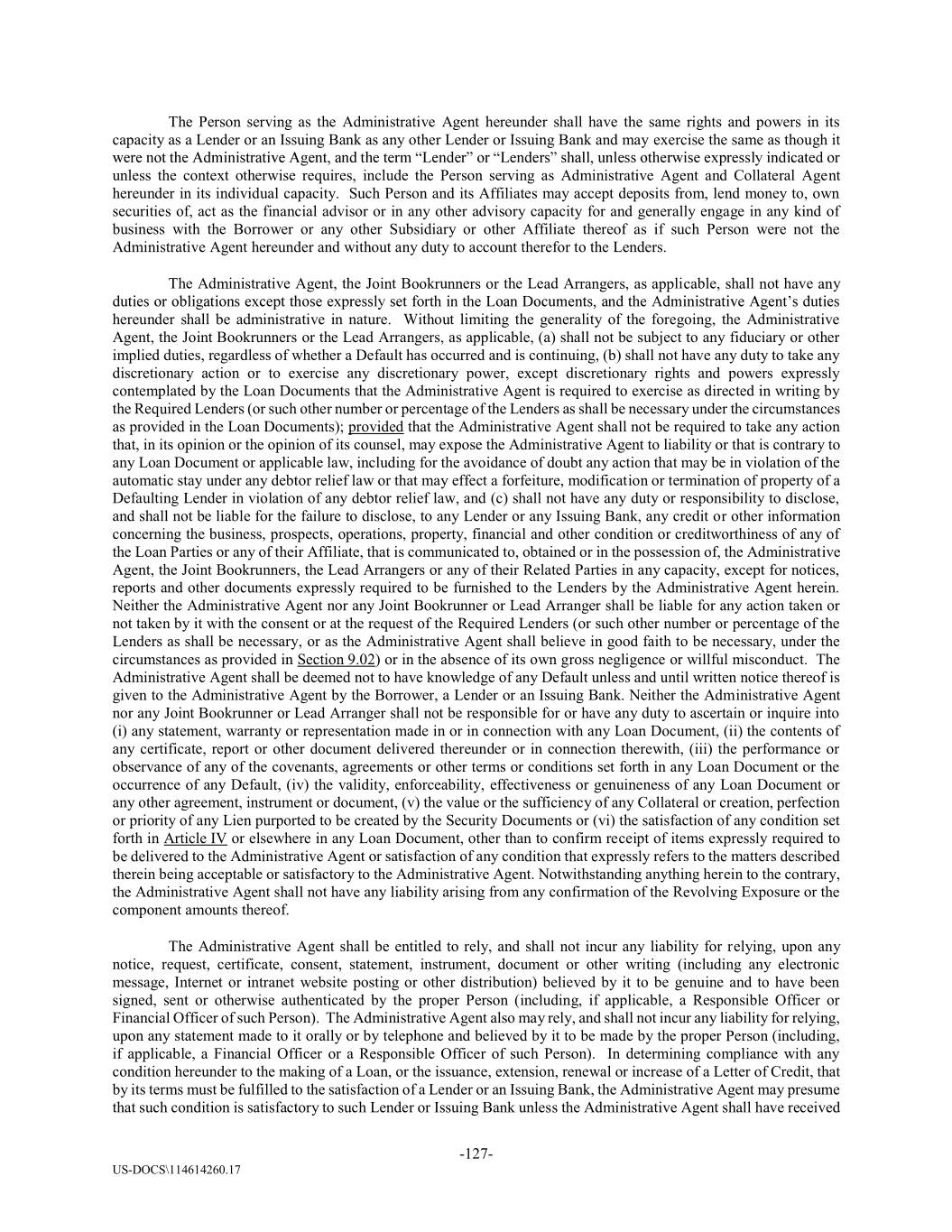 The Person serving as the Administrative Agent hereunder shall have the same rights and powers in its capacity as a Lender or an Issuing Bank as any other Lender or Issuing Bank and may exercise the same as though it unless the context otherwise requires, include the Person serving as Administrative Agent and Collateral Agent hereunder in its individual capacity. Such Person and its Affiliates may accept deposits from, lend money to, own securities of, act as the financial advisor or in any other advisory capacity for and generally engage in any kind of business with the Borrower or any other Subsidiary or other Affiliate thereof as if such Person were not the Administrative Agent hereunder and without any duty to account therefor to the Lenders. The Administrative Agent, the Joint Bookrunners or the Lead Arrangers, as applicable, shall not have any hereunder shall be administrative in nature. Without limiting the generality of the foregoing, the Administrative Agent, the Joint Bookrunners or the Lead Arrangers, as applicable, (a) shall not be subject to any fiduciary or other implied duties, regardless of whether a Default has occurred and is continuing, (b) shall not have any duty to take any discretionary action or to exercise any discretionary power, except discretionary rights and powers expressly contemplated by the Loan Documents that the Administrative Agent is required to exercise as directed in writing by the Required Lenders (or such other number or percentage of the Lenders as shall be necessary under the circumstances as provided in the Loan Documents); provided that the Administrative Agent shall not be required to take any action that, in its opinion or the opinion of its counsel, may expose the Administrative Agent to liability or that is contrary to any Loan Document or applicable law, including for the avoidance of doubt any action that may be in violation of the automatic stay under any debtor relief law or that may effect a forfeiture, modification or termination of property of a Defaulting Lender in violation of any debtor relief law, and (c) shall not have any duty or responsibility to disclose, and shall not be liable for the failure to disclose, to any Lender or any Issuing Bank, any credit or other information concerning the business, prospects, operations, property, financial and other condition or creditworthiness of any of the Loan Parties or any of their Affiliate, that is communicated to, obtained or in the possession of, the Administrative Agent, the Joint Bookrunners, the Lead Arrangers or any of their Related Parties in any capacity, except for notices, reports and other documents expressly required to be furnished to the Lenders by the Administrative Agent herein. Neither the Administrative Agent nor any Joint Bookrunner or Lead Arranger shall be liable for any action taken or not taken by it with the consent or at the request of the Required Lenders (or such other number or percentage of the Lenders as shall be necessary, or as the Administrative Agent shall believe in good faith to be necessary, under the circumstances as provided in Section 9.02) or in the absence of its own gross negligence or willful misconduct. The Administrative Agent shall be deemed not to have knowledge of any Default unless and until written notice thereof is given to the Administrative Agent by the Borrower, a Lender or an Issuing Bank. Neither the Administrative Agent nor any Joint Bookrunner or Lead Arranger shall not be responsible for or have any duty to ascertain or inquire into (i) any statement, warranty or representation made in or in connection with any Loan Document, (ii) the contents of any certificate, report or other document delivered thereunder or in connection therewith, (iii) the performance or observance of any of the covenants, agreements or other terms or conditions set forth in any Loan Document or the occurrence of any Default, (iv) the validity, enforceability, effectiveness or genuineness of any Loan Document or any other agreement, instrument or document, (v) the value or the sufficiency of any Collateral or creation, perfection or priority of any Lien purported to be created by the Security Documents or (vi) the satisfaction of any condition set forth in Article IV or elsewhere in any Loan Document, other than to confirm receipt of items expressly required to be delivered to the Administrative Agent or satisfaction of any condition that expressly refers to the matters described therein being acceptable or satisfactory to the Administrative Agent. Notwithstanding anything herein to the contrary, the Administrative Agent shall not have any liability arising from any confirmation of the Revolving Exposure or the component amounts thereof. The Administrative Agent shall be entitled to rely, and shall not incur any liability for relying, upon any notice, request, certificate, consent, statement, instrument, document or other writing (including any electronic message, Internet or intranet website posting or other distribution) believed by it to be genuine and to have been signed, sent or otherwise authenticated by the proper Person (including, if applicable, a Responsible Officer or Financial Officer of such Person). The Administrative Agent also may rely, and shall not incur any liability for relying, upon any statement made to it orally or by telephone and believed by it to be made by the proper Person (including, if applicable, a Financial Officer or a Responsible Officer of such Person). In determining compliance with any condition hereunder to the making of a Loan, or the issuance, extension, renewal or increase of a Letter of Credit, that by its terms must be fulfilled to the satisfaction of a Lender or an Issuing Bank, the Administrative Agent may presume that such condition is satisfactory to such Lender or Issuing Bank unless the Administrative Agent shall have received -127- US-DOCS\114614260.17