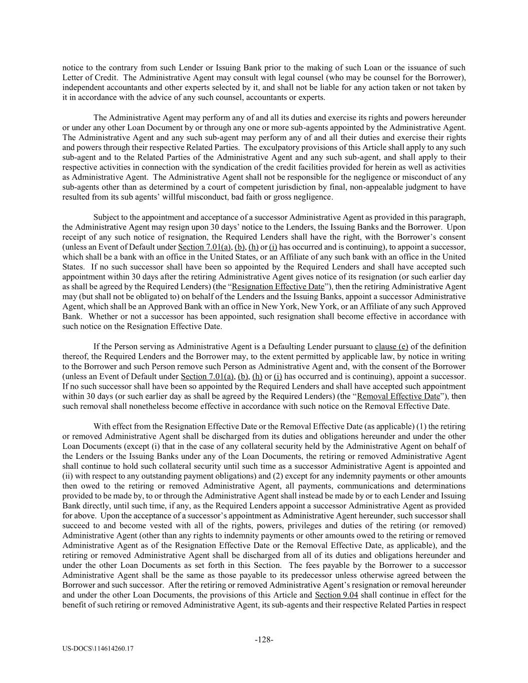 notice to the contrary from such Lender or Issuing Bank prior to the making of such Loan or the issuance of such Letter of Credit. The Administrative Agent may consult with legal counsel (who may be counsel for the Borrower), independent accountants and other experts selected by it, and shall not be liable for any action taken or not taken by it in accordance with the advice of any such counsel, accountants or experts. The Administrative Agent may perform any of and all its duties and exercise its rights and powers hereunder or under any other Loan Document by or through any one or more sub-agents appointed by the Administrative Agent. The Administrative Agent and any such sub-agent may perform any of and all their duties and exercise their rights and powers through their respective Related Parties. The exculpatory provisions of this Article shall apply to any such sub-agent and to the Related Parties of the Administrative Agent and any such sub-agent, and shall apply to their respective activities in connection with the syndication of the credit facilities provided for herein as well as activities as Administrative Agent. The Administrative Agent shall not be responsible for the negligence or misconduct of any sub-agents other than as determined by a court of competent jurisdiction by final, non-appealable judgment to have resulted from . Subject to the appointment and acceptance of a successor Administrative Agent as provided in this paragraph, receipt of any such notice of re (unless an Event of Default under Section 7.01(a), (b), (h) or (i) has occurred and is continuing), to appoint a successor, which shall be a bank with an office in the United States, or an Affiliate of any such bank with an office in the United States. If no such successor shall have been so appointed by the Required Lenders and shall have accepted such appointment within 30 days after the retiring Administrative Agent gives notice of its resignation (or such earlier day as shall be agreed by the Req Resignation Effective Date may (but shall not be obligated to) on behalf of the Lenders and the Issuing Banks, appoint a successor Administrative Agent, which shall be an Approved Bank with an office in New York, New York, or an Affiliate of any such Approved Bank. Whether or not a successor has been appointed, such resignation shall become effective in accordance with such notice on the Resignation Effective Date. If the Person serving as Administrative Agent is a Defaulting Lender pursuant to clause (e) of the definition thereof, the Required Lenders and the Borrower may, to the extent permitted by applicable law, by notice in writing to the Borrower and such Person remove such Person as Administrative Agent and, with the consent of the Borrower (unless an Event of Default under Section 7.01(a), (b), (h) or (i) has occurred and is continuing), appoint a successor. If no such successor shall have been so appointed by the Required Lenders and shall have accepted such appointment Removal Effective Date such removal shall nonetheless become effective in accordance with such notice on the Removal Effective Date. With effect from the Resignation Effective Date or the Removal Effective Date (as applicable) (1) the retiring or removed Administrative Agent shall be discharged from its duties and obligations hereunder and under the other Loan Documents (except (i) that in the case of any collateral security held by the Administrative Agent on behalf of the Lenders or the Issuing Banks under any of the Loan Documents, the retiring or removed Administrative Agent shall continue to hold such collateral security until such time as a successor Administrative Agent is appointed and (ii) with respect to any outstanding payment obligations) and (2) except for any indemnity payments or other amounts then owed to the retiring or removed Administrative Agent, all payments, communications and determinations provided to be made by, to or through the Administrative Agent shall instead be made by or to each Lender and Issuing Bank directly, until such time, if any, as the Required Lenders appoint a successor Administrative Agent as provided succeed to and become vested with all of the rights, powers, privileges and duties of the retiring (or removed) Administrative Agent (other than any rights to indemnity payments or other amounts owed to the retiring or removed Administrative Agent as of the Resignation Effective Date or the Removal Effective Date, as applicable), and the retiring or removed Administrative Agent shall be discharged from all of its duties and obligations hereunder and under the other Loan Documents as set forth in this Section. The fees payable by the Borrower to a successor Administrative Agent shall be the same as those payable to its predecessor unless otherwise agreed between the and under the other Loan Documents, the provisions of this Article and Section 9.04 shall continue in effect for the benefit of such retiring or removed Administrative Agent, its sub-agents and their respective Related Parties in respect -128- US-DOCS\114614260.17