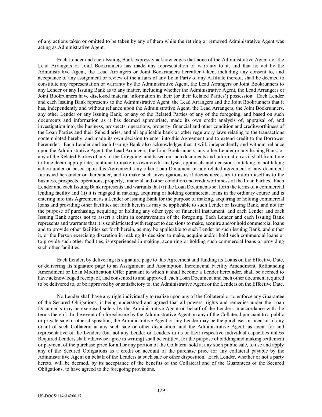 of any actions taken or omitted to be taken by any of them while the retiring or removed Administrative Agent was acting as Administrative Agent. Each Lender and each Issuing Bank expressly acknowledges that none of the Administrative Agent nor the Lead Arrangers or Joint Bookrunners has made any representation or warranty to it, and that no act by the Administrative Agent, the Lead Arrangers or Joint Bookrunners hereafter taken, including any consent to, and acceptance of any assignment or review of the affairs of any Loan Party of any Affiliate thereof, shall be deemed to constitute any representation or warranty by the Administrative Agent, the Lead Arrangers or Joint Bookrunners to any Lender or any Issuing Bank as to any matter, including whether the Administrative Agent, the Lead Arrangers or and each Issuing Bank represents to the Administrative Agent, the Lead Arrangers and the Joint Bookrunners that it has, independently and without reliance upon the Administrative Agent, the Lead Arrangers, the Joint Bookrunners, any other Lender or any Issuing Bank, or any of the Related Parties of any of the foregoing, and based on such documents and information as it has deemed appropriate, made its own credit analysis of, appraisal of, and investigation into, the business, prospects, operations, property, financial and other condition and creditworthiness of the Loan Parties and their Subsidiaries, and all applicable bank or other regulatory laws relating to the transactions contemplated hereby, and made its own decision to enter into this Agreement and to extend credit to the Borrower hereunder. Each Lender and each Issuing Bank also acknowledges that it will, independently and without reliance upon the Administrative Agent, the Lead Arrangers, the Joint Bookrunners, any other Lender or any Issuing Bank, or any of the Related Parties of any of the foregoing, and based on such documents and information as it shall from time to time deem appropriate, continue to make its own credit analysis, appraisals and decisions in taking or not taking action under or based upon this Agreement, any other Loan Document or any related agreement or any document furnished hereunder or thereunder, and to make such investigations as it deems necessary to inform itself as to the business, prospects, operations, property, financial and other condition and creditworthiness of the Loan Parties. Each Lender and each Issuing Bank represents and warrants that (i) the Loan Documents set forth the terms of a commercial lending facility and (ii) it is engaged in making, acquiring or holding commercial loans in the ordinary course and is entering into this Agreement as a Lender or Issuing Bank for the purpose of making, acquiring or holding commercial loans and providing other facilities set forth herein as may be applicable to such Lender or Issuing Bank, and not for the purpose of purchasing, acquiring or holding any other type of financial instrument, and each Lender and each Issuing Bank agrees not to assert a claim in contravention of the foregoing. Each Lender and each Issuing Bank represents and warrants that it is sophisticated with respect to decisions to make, acquire and/or hold commercial loans and to provide other facilities set forth herein, as may be applicable to such Lender or such Issuing Bank, and either it, or the Person exercising discretion in making its decision to make, acquire and/or hold such commercial loans or to provide such other facilities, is experienced in making, acquiring or holding such commercial loans or providing such other facilities. Each Lender, by delivering its signature page to this Agreement and funding its Loans on the Effective Date, or delivering its signature page to an Assignment and Assumption, Incremental Facility Amendment, Refinancing Amendment or Loan Modification Offer pursuant to which it shall become a Lender hereunder, shall be deemed to have acknowledged receipt of, and consented to and approved, each Loan Document and each other document required to be delivered to, or be approved by or satisfactory to, the Administrative Agent or the Lenders on the Effective Date. No Lender shall have any right individually to realize upon any of the Collateral or to enforce any Guarantee of the Secured Obligations, it being understood and agreed that all powers, rights and remedies under the Loan Documents may be exercised solely by the Administrative Agent on behalf of the Lenders in accordance with the terms thereof. In the event of a foreclosure by the Administrative Agent on any of the Collateral pursuant to a public or private sale or other disposition, the Administrative Agent or any Lender may be the purchaser or licensor of any or all of such Collateral at any such sale or other disposition, and the Administrative Agent, as agent for and representative of the Lenders (but not any Lender or Lenders in its or their respective individual capacities unless Required Lenders shall otherwise agree in writing) shall be entitled, for the purpose of bidding and making settlement or payment of the purchase price for all or any portion of the Collateral sold at any such public sale, to use and apply any of the Secured Obligations as a credit on account of the purchase price for any collateral payable by the Administrative Agent on behalf of the Lenders at such sale or other disposition. Each Lender, whether or not a party hereto, will be deemed, by its acceptance of the benefits of the Collateral and of the Guarantees of the Secured Obligations, to have agreed to the foregoing provisions. -129- US-DOCS\114614260.17
