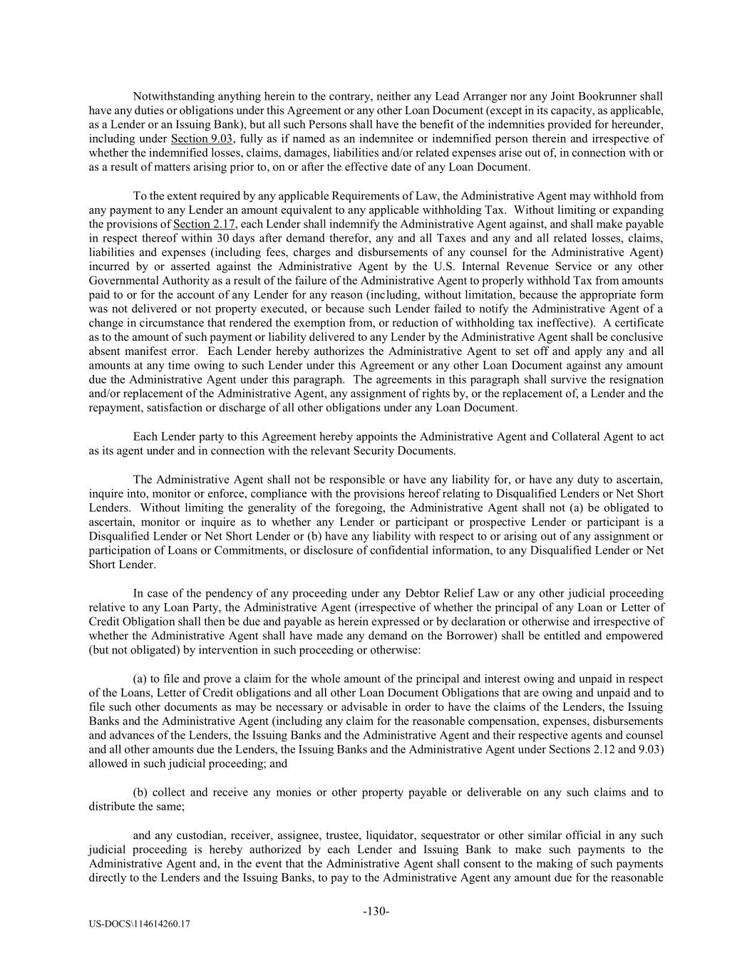 Notwithstanding anything herein to the contrary, neither any Lead Arranger nor any Joint Bookrunner shall have any duties or obligations under this Agreement or any other Loan Document (except in its capacity, as applicable, as a Lender or an Issuing Bank), but all such Persons shall have the benefit of the indemnities provided for hereunder, including under Section 9.03, fully as if named as an indemnitee or indemnified person therein and irrespective of whether the indemnified losses, claims, damages, liabilities and/or related expenses arise out of, in connection with or as a result of matters arising prior to, on or after the effective date of any Loan Document. To the extent required by any applicable Requirements of Law, the Administrative Agent may withhold from any payment to any Lender an amount equivalent to any applicable withholding Tax. Without limiting or expanding the provisions of Section 2.17, each Lender shall indemnify the Administrative Agent against, and shall make payable in respect thereof within 30 days after demand therefor, any and all Taxes and any and all related losses, claims, liabilities and expenses (including fees, charges and disbursements of any counsel for the Administrative Agent) incurred by or asserted against the Administrative Agent by the U.S. Internal Revenue Service or any other Governmental Authority as a result of the failure of the Administrative Agent to properly withhold Tax from amounts paid to or for the account of any Lender for any reason (including, without limitation, because the appropriate form was not delivered or not property executed, or because such Lender failed to notify the Administrative Agent of a change in circumstance that rendered the exemption from, or reduction of withholding tax ineffective). A certificate as to the amount of such payment or liability delivered to any Lender by the Administrative Agent shall be conclusive absent manifest error. Each Lender hereby authorizes the Administrative Agent to set off and apply any and all amounts at any time owing to such Lender under this Agreement or any other Loan Document against any amount due the Administrative Agent under this paragraph. The agreements in this paragraph shall survive the resignation and/or replacement of the Administrative Agent, any assignment of rights by, or the replacement of, a Lender and the repayment, satisfaction or discharge of all other obligations under any Loan Document. Each Lender party to this Agreement hereby appoints the Administrative Agent and Collateral Agent to act as its agent under and in connection with the relevant Security Documents. The Administrative Agent shall not be responsible or have any liability for, or have any duty to ascertain, inquire into, monitor or enforce, compliance with the provisions hereof relating to Disqualified Lenders or Net Short Lenders. Without limiting the generality of the foregoing, the Administrative Agent shall not (a) be obligated to ascertain, monitor or inquire as to whether any Lender or participant or prospective Lender or participant is a Disqualified Lender or Net Short Lender or (b) have any liability with respect to or arising out of any assignment or participation of Loans or Commitments, or disclosure of confidential information, to any Disqualified Lender or Net Short Lender. In case of the pendency of any proceeding under any Debtor Relief Law or any other judicial proceeding relative to any Loan Party, the Administrative Agent (irrespective of whether the principal of any Loan or Letter of Credit Obligation shall then be due and payable as herein expressed or by declaration or otherwise and irrespective of whether the Administrative Agent shall have made any demand on the Borrower) shall be entitled and empowered (but not obligated) by intervention in such proceeding or otherwise: (a) to file and prove a claim for the whole amount of the principal and interest owing and unpaid in respect of the Loans, Letter of Credit obligations and all other Loan Document Obligations that are owing and unpaid and to file such other documents as may be necessary or advisable in order to have the claims of the Lenders, the Issuing Banks and the Administrative Agent (including any claim for the reasonable compensation, expenses, disbursements and advances of the Lenders, the Issuing Banks and the Administrative Agent and their respective agents and counsel and all other amounts due the Lenders, the Issuing Banks and the Administrative Agent under Sections 2.12 and 9.03) allowed in such judicial proceeding; and (b) collect and receive any monies or other property payable or deliverable on any such claims and to distribute the same; and any custodian, receiver, assignee, trustee, liquidator, sequestrator or other similar official in any such judicial proceeding is hereby authorized by each Lender and Issuing Bank to make such payments to the Administrative Agent and, in the event that the Administrative Agent shall consent to the making of such payments directly to the Lenders and the Issuing Banks, to pay to the Administrative Agent any amount due for the reasonable -130- US-DOCS\114614260.17