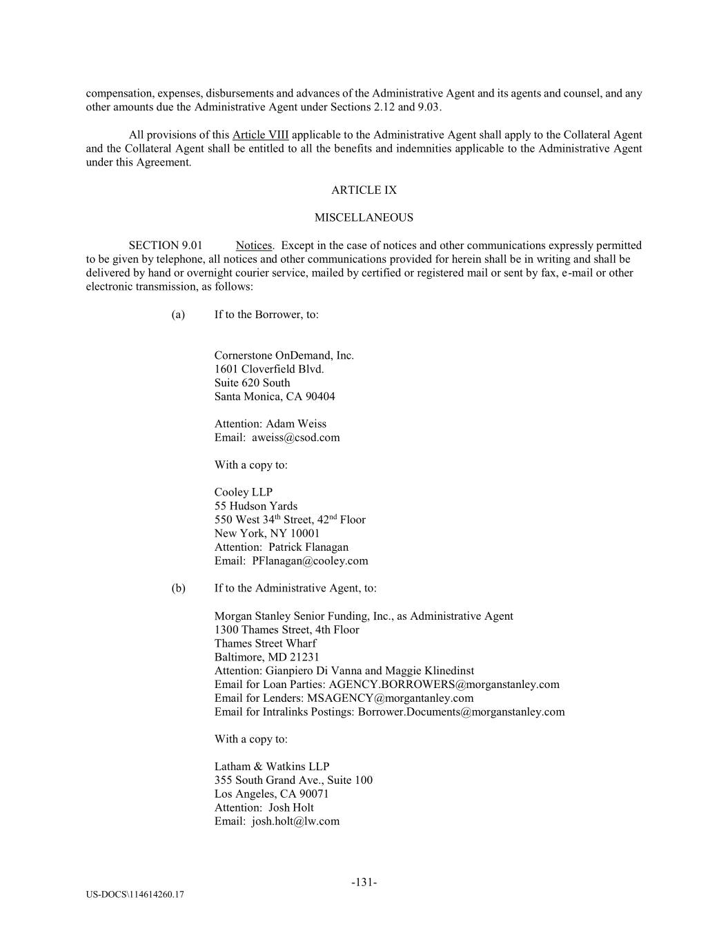 compensation, expenses, disbursements and advances of the Administrative Agent and its agents and counsel, and any other amounts due the Administrative Agent under Sections 2.12 and 9.03. All provisions of this Article VIII applicable to the Administrative Agent shall apply to the Collateral Agent and the Collateral Agent shall be entitled to all the benefits and indemnities applicable to the Administrative Agent under this Agreement. ARTICLE IX MISCELLANEOUS SECTION 9.01 Notices. Except in the case of notices and other communications expressly permitted to be given by telephone, all notices and other communications provided for herein shall be in writing and shall be delivered by hand or overnight courier service, mailed by certified or registered mail or sent by fax, e-mail or other electronic transmission, as follows: (a) If to the Borrower, to: Cornerstone OnDemand, Inc. 1601 Cloverfield Blvd. Suite 620 South Santa Monica, CA 90404 Attention: Adam Weiss Email: aweiss@csod.com With a copy to: Cooley LLP 55 Hudson Yards 550 West 34th Street, 42nd Floor New York, NY 10001 Attention: Patrick Flanagan Email: PFlanagan@cooley.com (b) If to the Administrative Agent, to: Morgan Stanley Senior Funding, Inc., as Administrative Agent 1300 Thames Street, 4th Floor Thames Street Wharf Baltimore, MD 21231 Attention: Gianpiero Di Vanna and Maggie Klinedinst Email for Loan Parties: AGENCY.BORROWERS@morganstanley.com Email for Lenders: MSAGENCY@morgantanley.com Email for Intralinks Postings: Borrower.Documents@morganstanley.com With a copy to: Latham & Watkins LLP 355 South Grand Ave., Suite 100 Los Angeles, CA 90071 Attention: Josh Holt Email: josh.holt@lw.com -131- US-DOCS\114614260.17