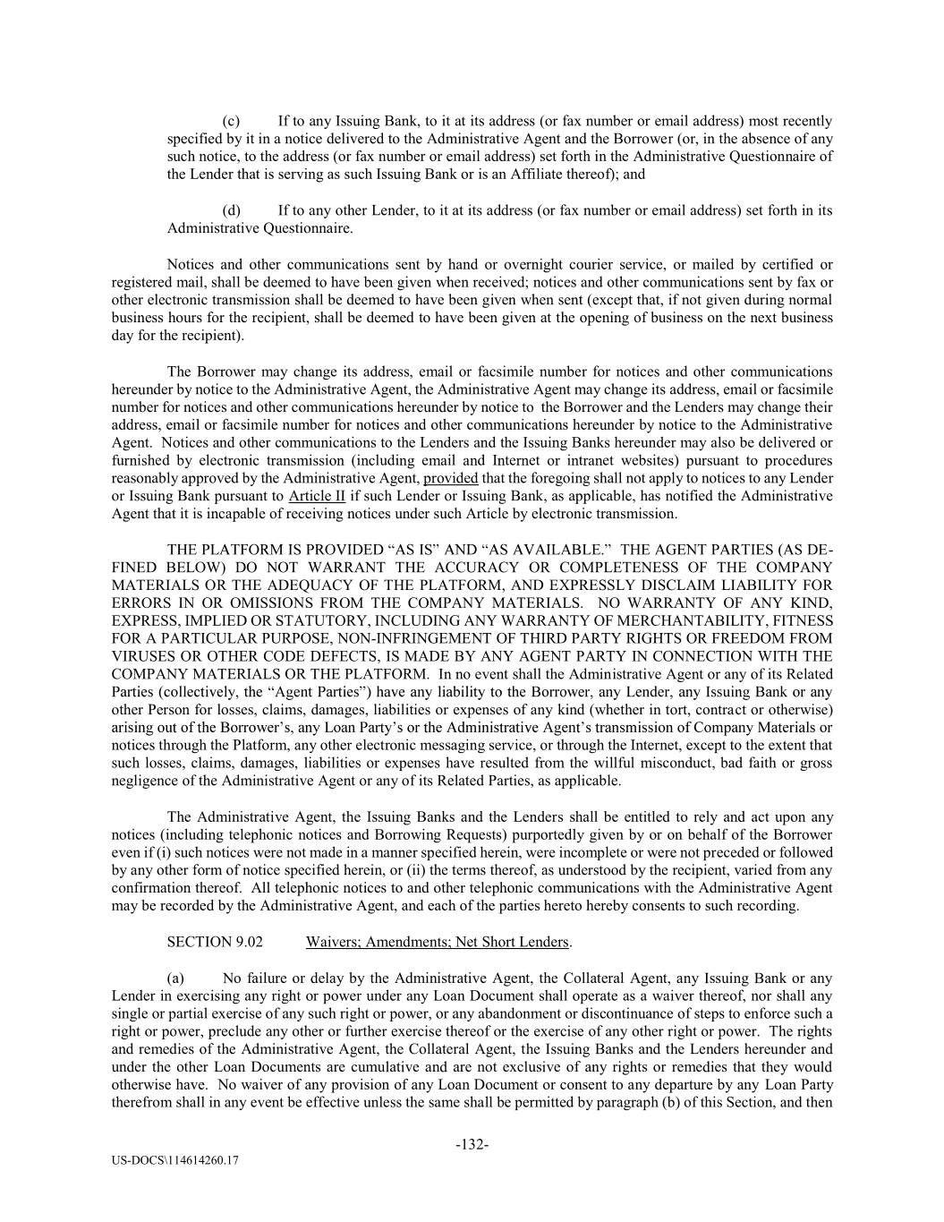 (c) If to any Issuing Bank, to it at its address (or fax number or email address) most recently specified by it in a notice delivered to the Administrative Agent and the Borrower (or, in the absence of any such notice, to the address (or fax number or email address) set forth in the Administrative Questionnaire of the Lender that is serving as such Issuing Bank or is an Affiliate thereof); and (d) If to any other Lender, to it at its address (or fax number or email address) set forth in its Administrative Questionnaire. Notices and other communications sent by hand or overnight courier service, or mailed by certified or registered mail, shall be deemed to have been given when received; notices and other communications sent by fax or other electronic transmission shall be deemed to have been given when sent (except that, if not given during normal business hours for the recipient, shall be deemed to have been given at the opening of business on the next business day for the recipient). The Borrower may change its address, email or facsimile number for notices and other communications hereunder by notice to the Administrative Agent, the Administrative Agent may change its address, email or facsimile number for notices and other communications hereunder by notice to the Borrower and the Lenders may change their address, email or facsimile number for notices and other communications hereunder by notice to the Administrative Agent. Notices and other communications to the Lenders and the Issuing Banks hereunder may also be delivered or furnished by electronic transmission (including email and Internet or intranet websites) pursuant to procedures reasonably approved by the Administrative Agent, provided that the foregoing shall not apply to notices to any Lender or Issuing Bank pursuant to Article II if such Lender or Issuing Bank, as applicable, has notified the Administrative Agent that it is incapable of receiving notices under such Article by electronic transmission. - FINED BELOW) DO NOT WARRANT THE ACCURACY OR COMPLETENESS OF THE COMPANY MATERIALS OR THE ADEQUACY OF THE PLATFORM, AND EXPRESSLY DISCLAIM LIABILITY FOR ERRORS IN OR OMISSIONS FROM THE COMPANY MATERIALS. NO WARRANTY OF ANY KIND, EXPRESS, IMPLIED OR STATUTORY, INCLUDING ANY WARRANTY OF MERCHANTABILITY, FITNESS FOR A PARTICULAR PURPOSE, NON-INFRINGEMENT OF THIRD PARTY RIGHTS OR FREEDOM FROM VIRUSES OR OTHER CODE DEFECTS, IS MADE BY ANY AGENT PARTY IN CONNECTION WITH THE COMPANY MATERIALS OR THE PLATFORM. In no event shall the Administrative Agent or any of its Related other Person for losses, claims, damages, liabilities or expenses of any kind (whether in tort, contract or otherwise) notices through the Platform, any other electronic messaging service, or through the Internet, except to the extent that such losses, claims, damages, liabilities or expenses have resulted from the willful misconduct, bad faith or gross negligence of the Administrative Agent or any of its Related Parties, as applicable. The Administrative Agent, the Issuing Banks and the Lenders shall be entitled to rely and act upon any notices (including telephonic notices and Borrowing Requests) purportedly given by or on behalf of the Borrower even if (i) such notices were not made in a manner specified herein, were incomplete or were not preceded or followed by any other form of notice specified herein, or (ii) the terms thereof, as understood by the recipient, varied from any confirmation thereof. All telephonic notices to and other telephonic communications with the Administrative Agent may be recorded by the Administrative Agent, and each of the parties hereto hereby consents to such recording. SECTION 9.02 Waivers; Amendments; Net Short Lenders. (a) No failure or delay by the Administrative Agent, the Collateral Agent, any Issuing Bank or any Lender in exercising any right or power under any Loan Document shall operate as a waiver thereof, nor shall any single or partial exercise of any such right or power, or any abandonment or discontinuance of steps to enforce such a right or power, preclude any other or further exercise thereof or the exercise of any other right or power. The rights and remedies of the Administrative Agent, the Collateral Agent, the Issuing Banks and the Lenders hereunder and under the other Loan Documents are cumulative and are not exclusive of any rights or remedies that they would otherwise have. No waiver of any provision of any Loan Document or consent to any departure by any Loan Party therefrom shall in any event be effective unless the same shall be permitted by paragraph (b) of this Section, and then -132- US-DOCS\114614260.17