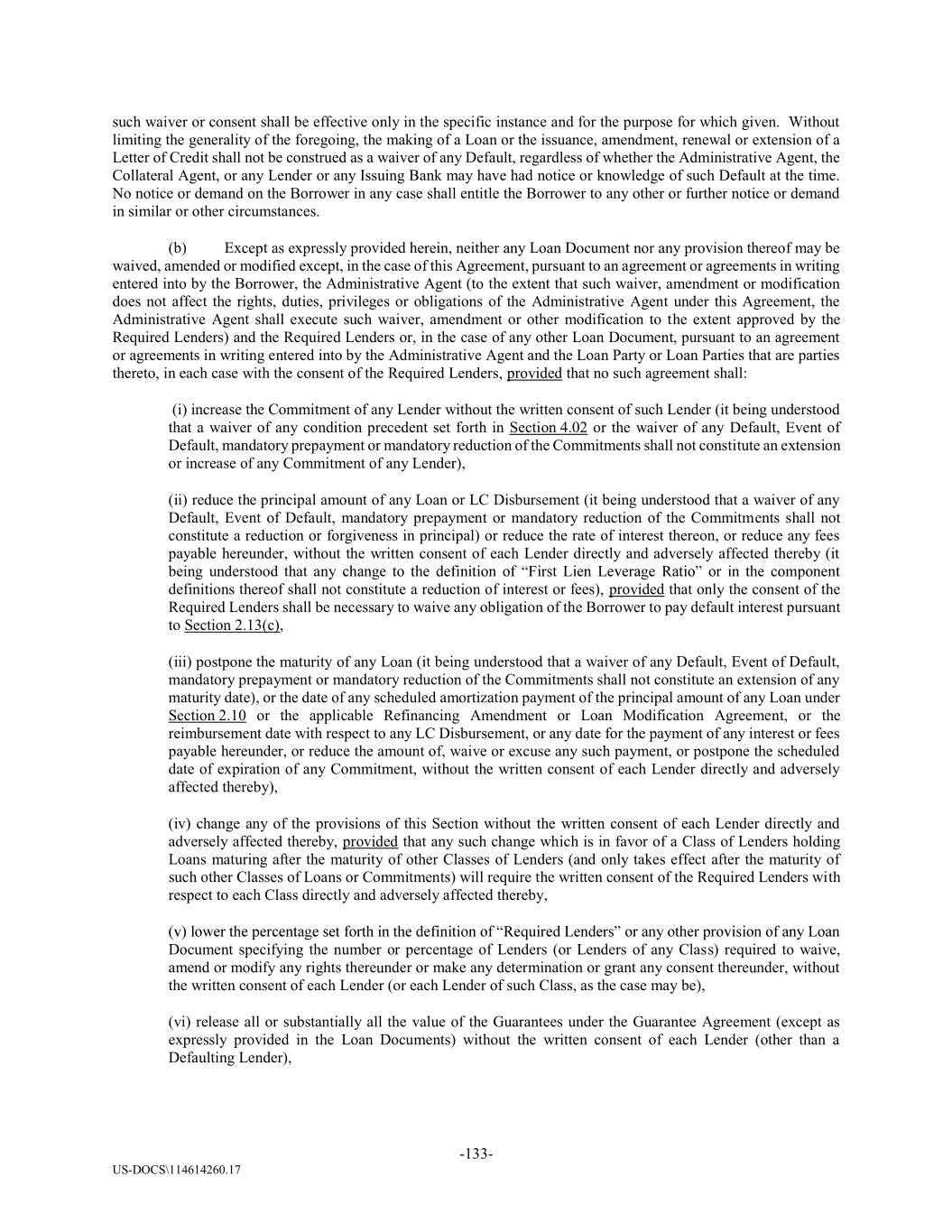 such waiver or consent shall be effective only in the specific instance and for the purpose for which given. Without limiting the generality of the foregoing, the making of a Loan or the issuance, amendment, renewal or extension of a Letter of Credit shall not be construed as a waiver of any Default, regardless of whether the Administrative Agent, the Collateral Agent, or any Lender or any Issuing Bank may have had notice or knowledge of such Default at the time. No notice or demand on the Borrower in any case shall entitle the Borrower to any other or further notice or demand in similar or other circumstances. (b) Except as expressly provided herein, neither any Loan Document nor any provision thereof may be waived, amended or modified except, in the case of this Agreement, pursuant to an agreement or agreements in writing entered into by the Borrower, the Administrative Agent (to the extent that such waiver, amendment or modification does not affect the rights, duties, privileges or obligations of the Administrative Agent under this Agreement, the Administrative Agent shall execute such waiver, amendment or other modification to the extent approved by the Required Lenders) and the Required Lenders or, in the case of any other Loan Document, pursuant to an agreement or agreements in writing entered into by the Administrative Agent and the Loan Party or Loan Parties that are parties thereto, in each case with the consent of the Required Lenders, provided that no such agreement shall: (i) increase the Commitment of any Lender without the written consent of such Lender (it being understood that a waiver of any condition precedent set forth in Section 4.02 or the waiver of any Default, Event of Default, mandatory prepayment or mandatory reduction of the Commitments shall not constitute an extension or increase of any Commitment of any Lender), (ii) reduce the principal amount of any Loan or LC Disbursement (it being understood that a waiver of any Default, Event of Default, mandatory prepayment or mandatory reduction of the Commitments shall not constitute a reduction or forgiveness in principal) or reduce the rate of interest thereon, or reduce any fees payable hereunder, without the written consent of each Lender directly and adversely affected thereby (it being understood that an definitions thereof shall not constitute a reduction of interest or fees), provided that only the consent of the Required Lenders shall be necessary to waive any obligation of the Borrower to pay default interest pursuant to Section 2.13(c), (iii) postpone the maturity of any Loan (it being understood that a waiver of any Default, Event of Default, mandatory prepayment or mandatory reduction of the Commitments shall not constitute an extension of any maturity date), or the date of any scheduled amortization payment of the principal amount of any Loan under Section 2.10 or the applicable Refinancing Amendment or Loan Modification Agreement, or the reimbursement date with respect to any LC Disbursement, or any date for the payment of any interest or fees payable hereunder, or reduce the amount of, waive or excuse any such payment, or postpone the scheduled date of expiration of any Commitment, without the written consent of each Lender directly and adversely affected thereby), (iv) change any of the provisions of this Section without the written consent of each Lender directly and adversely affected thereby, provided that any such change which is in favor of a Class of Lenders holding Loans maturing after the maturity of other Classes of Lenders (and only takes effect after the maturity of such other Classes of Loans or Commitments) will require the written consent of the Required Lenders with respect to each Class directly and adversely affected thereby, Document specifying the number or percentage of Lenders (or Lenders of any Class) required to waive, amend or modify any rights thereunder or make any determination or grant any consent thereunder, without the written consent of each Lender (or each Lender of such Class, as the case may be), (vi) release all or substantially all the value of the Guarantees under the Guarantee Agreement (except as expressly provided in the Loan Documents) without the written consent of each Lender (other than a Defaulting Lender), -133- US-DOCS\114614260.17