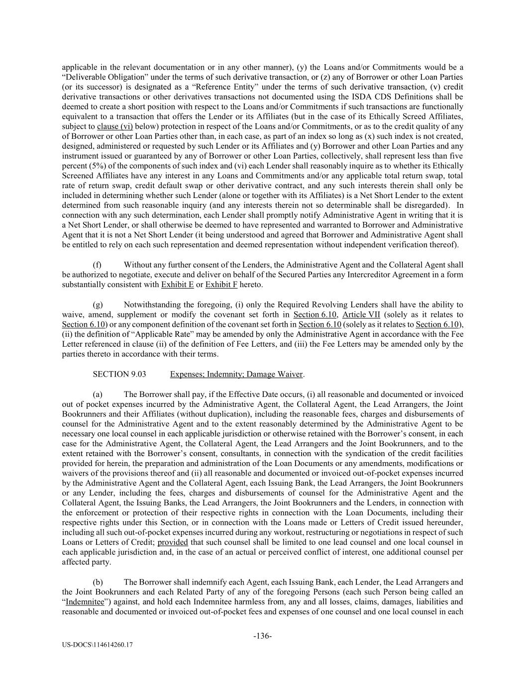 applicable in the relevant documentation or in any other manner), (y) the Loans and/or Commitments would be a (or its successor) derivative transactions or other derivatives transactions not documented using the ISDA CDS Definitions shall be deemed to create a short position with respect to the Loans and/or Commitments if such transactions are functionally equivalent to a transaction that offers the Lender or its Affiliates (but in the case of its Ethically Screed Affiliates, subject to clause (vi) below) protection in respect of the Loans and/or Commitments, or as to the credit quality of any of Borrower or other Loan Parties other than, in each case, as part of an index so long as (x) such index is not created, designed, administered or requested by such Lender or its Affiliates and (y) Borrower and other Loan Parties and any instrument issued or guaranteed by any of Borrower or other Loan Parties, collectively, shall represent less than five percent (5%) of the components of such index and (vi) each Lender shall reasonably inquire as to whether its Ethically Screened Affiliates have any interest in any Loans and Commitments and/or any applicable total return swap, total rate of return swap, credit default swap or other derivative contract, and any such interests therein shall only be included in determining whether such Lender (alone or together with its Affiliates) is a Net Short Lender to the extent determined from such reasonable inquiry (and any interests therein not so determinable shall be disregarded). In connection with any such determination, each Lender shall promptly notify Administrative Agent in writing that it is a Net Short Lender, or shall otherwise be deemed to have represented and warranted to Borrower and Administrative Agent that it is not a Net Short Lender (it being understood and agreed that Borrower and Administrative Agent shall be entitled to rely on each such representation and deemed representation without independent verification thereof). (f) Without any further consent of the Lenders, the Administrative Agent and the Collateral Agent shall be authorized to negotiate, execute and deliver on behalf of the Secured Parties any Intercreditor Agreement in a form substantially consistent with Exhibit E or Exhibit F hereto. (g) Notwithstanding the foregoing, (i) only the Required Revolving Lenders shall have the ability to waive, amend, supplement or modify the covenant set forth in Section 6.10, Article VII (solely as it relates to Section 6.10) or any component definition of the covenant set forth in Section 6.10 (solely as it relates to Section 6.10), (ii) in accordance with the Fee Letter referenced in clause (ii) of the definition of Fee Letters, and (iii) the Fee Letters may be amended only by the parties thereto in accordance with their terms. SECTION 9.03 Expenses; Indemnity; Damage Waiver. (a) The Borrower shall pay, if the Effective Date occurs, (i) all reasonable and documented or invoiced out of pocket expenses incurred by the Administrative Agent, the Collateral Agent, the Lead Arrangers, the Joint Bookrunners and their Affiliates (without duplication), including the reasonable fees, charges and disbursements of counsel for the Administrative Agent and to the extent reasonably determined by the Administrative Agent to be case for the Administrative Agent, the Collateral Agent, the Lead Arrangers and the Joint Bookrunners, and to the provided for herein, the preparation and administration of the Loan Documents or any amendments, modifications or waivers of the provisions thereof and (ii) all reasonable and documented or invoiced out-of-pocket expenses incurred by the Administrative Agent and the Collateral Agent, each Issuing Bank, the Lead Arrangers, the Joint Bookrunners or any Lender, including the fees, charges and disbursements of counsel for the Administrative Agent and the Collateral Agent, the Issuing Banks, the Lead Arrangers, the Joint Bookrunners and the Lenders, in connection with the enforcement or protection of their respective rights in connection with the Loan Documents, including their respective rights under this Section, or in connection with the Loans made or Letters of Credit issued hereunder, including all such out-of-pocket expenses incurred during any workout, restructuring or negotiations in respect of such Loans or Letters of Credit; provided that such counsel shall be limited to one lead counsel and one local counsel in each applicable jurisdiction and, in the case of an actual or perceived conflict of interest, one additional counsel per affected party. (b) The Borrower shall indemnify each Agent, each Issuing Bank, each Lender, the Lead Arrangers and the Joint Bookrunners and each Related Party of any of the foregoing Persons (each such Person being called an Indemnitee reasonable and documented or invoiced out-of-pocket fees and expenses of one counsel and one local counsel in each -136- US-DOCS\114614260.17