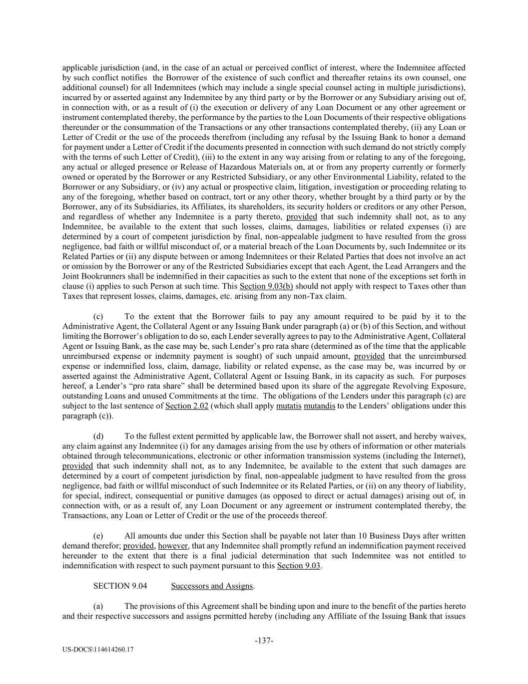applicable jurisdiction (and, in the case of an actual or perceived conflict of interest, where the Indemnitee affected by such conflict notifies the Borrower of the existence of such conflict and thereafter retains its own counsel, one additional counsel) for all Indemnitees (which may include a single special counsel acting in multiple jurisdictions), incurred by or asserted against any Indemnitee by any third party or by the Borrower or any Subsidiary arising out of, in connection with, or as a result of (i) the execution or delivery of any Loan Document or any other agreement or instrument contemplated thereby, the performance by the parties to the Loan Documents of their respective obligations thereunder or the consummation of the Transactions or any other transactions contemplated thereby, (ii) any Loan or Letter of Credit or the use of the proceeds therefrom (including any refusal by the Issuing Bank to honor a demand for payment under a Letter of Credit if the documents presented in connection with such demand do not strictly comply with the terms of such Letter of Credit), (iii) to the extent in any way arising from or relating to any of the foregoing, any actual or alleged presence or Release of Hazardous Materials on, at or from any property currently or formerly owned or operated by the Borrower or any Restricted Subsidiary, or any other Environmental Liability, related to the Borrower or any Subsidiary, or (iv) any actual or prospective claim, litigation, investigation or proceeding relating to any of the foregoing, whether based on contract, tort or any other theory, whether brought by a third party or by the Borrower, any of its Subsidiaries, its Affiliates, its shareholders, its security holders or creditors or any other Person, and regardless of whether any Indemnitee is a party thereto, provided that such indemnity shall not, as to any Indemnitee, be available to the extent that such losses, claims, damages, liabilities or related expenses (i) are determined by a court of competent jurisdiction by final, non-appealable judgment to have resulted from the gross negligence, bad faith or willful misconduct of, or a material breach of the Loan Documents by, such Indemnitee or its Related Parties or (ii) any dispute between or among Indemnitees or their Related Parties that does not involve an act or omission by the Borrower or any of the Restricted Subsidiaries except that each Agent, the Lead Arrangers and the Joint Bookrunners shall be indemnified in their capacities as such to the extent that none of the exceptions set forth in clause (i) applies to such Person at such time. This Section 9.03(b) should not apply with respect to Taxes other than Taxes that represent losses, claims, damages, etc. arising from any non-Tax claim. (c) To the extent that the Borrower fails to pay any amount required to be paid by it to the Administrative Agent, the Collateral Agent or any Issuing Bank under paragraph (a) or (b) of this Section, and without Age unreimbursed expense or indemnity payment is sought) of such unpaid amount, provided that the unreimbursed expense or indemnified loss, claim, damage, liability or related expense, as the case may be, was incurred by or asserted against the Administrative Agent, Collateral Agent or Issuing Bank, in its capacity as such. For purposes d upon its share of the aggregate Revolving Exposure, outstanding Loans and unused Commitments at the time. The obligations of the Lenders under this paragraph (c) are subject to the last sentence of Section 2.02 (which shall apply mutatis mutandis paragraph (c)). (d) To the fullest extent permitted by applicable law, the Borrower shall not assert, and hereby waives, any claim against any Indemnitee (i) for any damages arising from the use by others of information or other materials obtained through telecommunications, electronic or other information transmission systems (including the Internet), provided that such indemnity shall not, as to any Indemnitee, be available to the extent that such damages are determined by a court of competent jurisdiction by final, non-appealable judgment to have resulted from the gross negligence, bad faith or willful misconduct of such Indemnitee or its Related Parties, or (ii) on any theory of liability, for special, indirect, consequential or punitive damages (as opposed to direct or actual damages) arising out of, in connection with, or as a result of, any Loan Document or any agreement or instrument contemplated thereby, the Transactions, any Loan or Letter of Credit or the use of the proceeds thereof. (e) All amounts due under this Section shall be payable not later than 10 Business Days after written demand therefor; provided, however, that any Indemnitee shall promptly refund an indemnification payment received hereunder to the extent that there is a final judicial determination that such Indemnitee was not entitled to indemnification with respect to such payment pursuant to this Section 9.03. SECTION 9.04 Successors and Assigns. (a) The provisions of this Agreement shall be binding upon and inure to the benefit of the parties hereto and their respective successors and assigns permitted hereby (including any Affiliate of the Issuing Bank that issues -137- US-DOCS\114614260.17