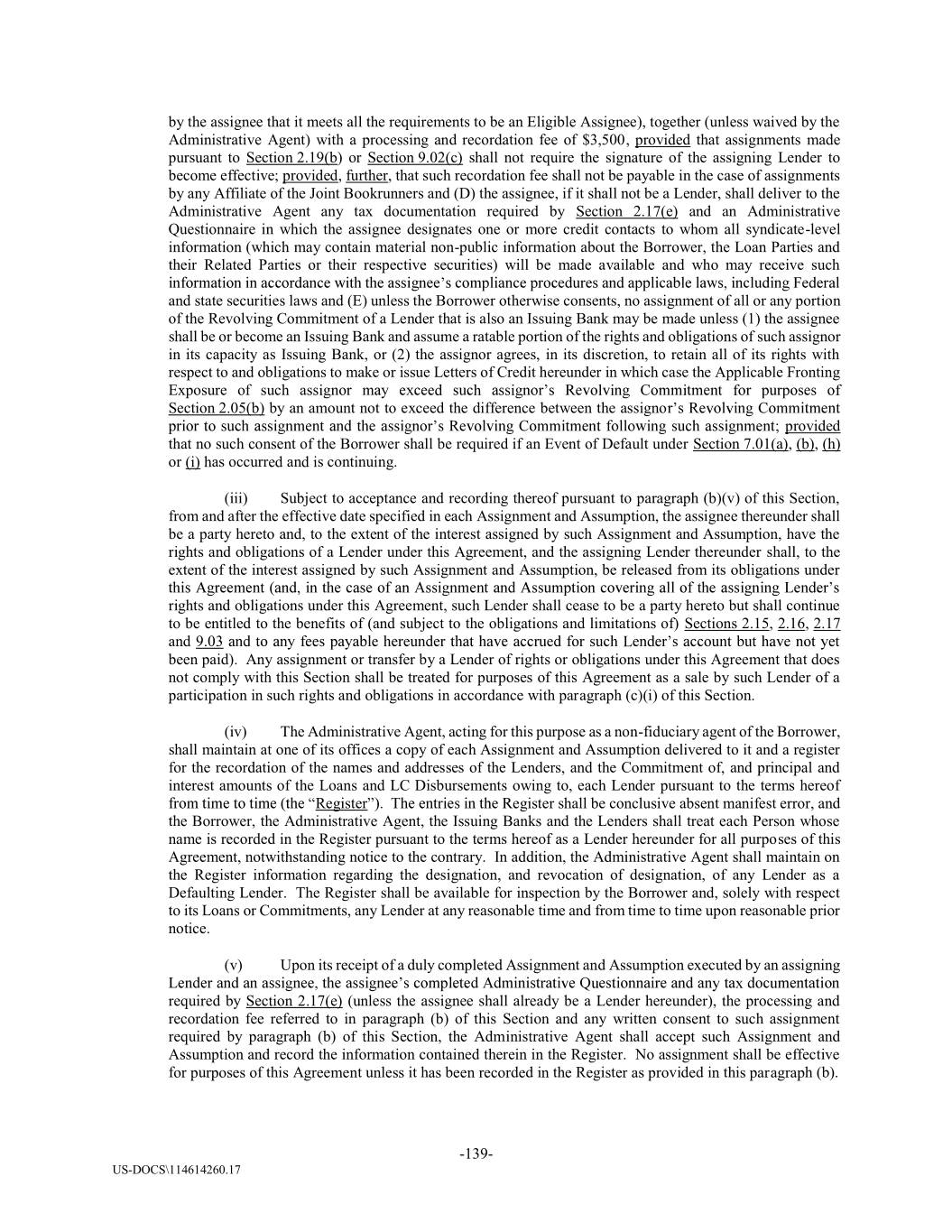 by the assignee that it meets all the requirements to be an Eligible Assignee), together (unless waived by the Administrative Agent) with a processing and recordation fee of $3,500, provided that assignments made pursuant to Section 2.19(b) or Section 9.02(c) shall not require the signature of the assigning Lender to become effective; provided, further, that such recordation fee shall not be payable in the case of assignments by any Affiliate of the Joint Bookrunners and (D) the assignee, if it shall not be a Lender, shall deliver to the Administrative Agent any tax documentation required by Section 2.17(e) and an Administrative Questionnaire in which the assignee designates one or more credit contacts to whom all syndicate-level information (which may contain material non-public information about the Borrower, the Loan Parties and their Related Parties or their respective securities) will be made available and who may receive such and state securities laws and (E) unless the Borrower otherwise consents, no assignment of all or any portion of the Revolving Commitment of a Lender that is also an Issuing Bank may be made unless (1) the assignee shall be or become an Issuing Bank and assume a ratable portion of the rights and obligations of such assignor in its capacity as Issuing Bank, or (2) the assignor agrees, in its discretion, to retain all of its rights with respect to and obligations to make or issue Letters of Credit hereunder in which case the Applicable Fronting Exposure of such as Section 2.05(b) by an amount not to exceed the difference between the assigno provided that no such consent of the Borrower shall be required if an Event of Default under Section 7.01(a), (b), (h) or (i) has occurred and is continuing. (iii) Subject to acceptance and recording thereof pursuant to paragraph (b)(v) of this Section, from and after the effective date specified in each Assignment and Assumption, the assignee thereunder shall be a party hereto and, to the extent of the interest assigned by such Assignment and Assumption, have the rights and obligations of a Lender under this Agreement, and the assigning Lender thereunder shall, to the extent of the interest assigned by such Assignment and Assumption, be released from its obligations under rights and obligations under this Agreement, such Lender shall cease to be a party hereto but shall continue to be entitled to the benefits of (and subject to the obligations and limitations of) Sections 2.15, 2.16, 2.17 and 9.03 been paid). Any assignment or transfer by a Lender of rights or obligations under this Agreement that does not comply with this Section shall be treated for purposes of this Agreement as a sale by such Lender of a participation in such rights and obligations in accordance with paragraph (c)(i) of this Section. (iv) The Administrative Agent, acting for this purpose as a non-fiduciary agent of the Borrower, shall maintain at one of its offices a copy of each Assignment and Assumption delivered to it and a register for the recordation of the names and addresses of the Lenders, and the Commitment of, and principal and interest amounts of the Loans and LC Disbursements owing to, each Lender pursuant to the terms hereof Register egister shall be conclusive absent manifest error, and the Borrower, the Administrative Agent, the Issuing Banks and the Lenders shall treat each Person whose name is recorded in the Register pursuant to the terms hereof as a Lender hereunder for all purposes of this Agreement, notwithstanding notice to the contrary. In addition, the Administrative Agent shall maintain on the Register information regarding the designation, and revocation of designation, of any Lender as a Defaulting Lender. The Register shall be available for inspection by the Borrower and, solely with respect to its Loans or Commitments, any Lender at any reasonable time and from time to time upon reasonable prior notice. (v) Upon its receipt of a duly completed Assignment and Assumption executed by an assigning required by Section 2.17(e) (unless the assignee shall already be a Lender hereunder), the processing and recordation fee referred to in paragraph (b) of this Section and any written consent to such assignment required by paragraph (b) of this Section, the Administrative Agent shall accept such Assignment and Assumption and record the information contained therein in the Register. No assignment shall be effective for purposes of this Agreement unless it has been recorded in the Register as provided in this paragraph (b). -139- US-DOCS\114614260.17