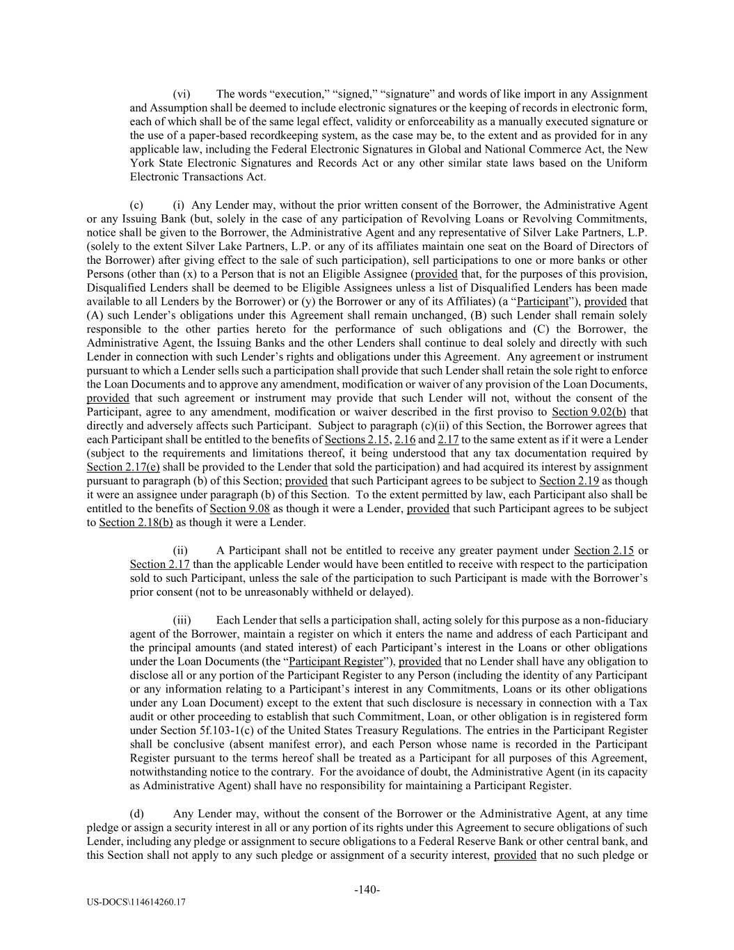 (vi) and Assumption shall be deemed to include electronic signatures or the keeping of records in electronic form, each of which shall be of the same legal effect, validity or enforceability as a manually executed signature or the use of a paper-based recordkeeping system, as the case may be, to the extent and as provided for in any applicable law, including the Federal Electronic Signatures in Global and National Commerce Act, the New York State Electronic Signatures and Records Act or any other similar state laws based on the Uniform Electronic Transactions Act. (c) (i) Any Lender may, without the prior written consent of the Borrower, the Administrative Agent or any Issuing Bank (but, solely in the case of any participation of Revolving Loans or Revolving Commitments, notice shall be given to the Borrower, the Administrative Agent and any representative of Silver Lake Partners, L.P. (solely to the extent Silver Lake Partners, L.P. or any of its affiliates maintain one seat on the Board of Directors of the Borrower) after giving effect to the sale of such participation), sell participations to one or more banks or other Persons (other than (x) to a Person that is not an Eligible Assignee (provided that, for the purposes of this provision, Disqualified Lenders shall be deemed to be Eligible Assignees unless a list of Disqualified Lenders has been made available to all Lenders by the Borrowe Participant provided that responsible to the other parties hereto for the performance of such obligations and (C) the Borrower, the Administrative Agent, the Issuing Banks and the other Lenders shall continue to deal solely and directly with such t or instrument pursuant to which a Lender sells such a participation shall provide that such Lender shall retain the sole right to enforce the Loan Documents and to approve any amendment, modification or waiver of any provision of the Loan Documents, provided that such agreement or instrument may provide that such Lender will not, without the consent of the Participant, agree to any amendment, modification or waiver described in the first proviso to Section 9.02(b) that directly and adversely affects such Participant. Subject to paragraph (c)(ii) of this Section, the Borrower agrees that each Participant shall be entitled to the benefits of Sections 2.15, 2.16 and 2.17 to the same extent as if it were a Lender (subject to the requirements and limitations thereof, it being understood that any tax documentation required by Section 2.17(e) shall be provided to the Lender that sold the participation) and had acquired its interest by assignment pursuant to paragraph (b) of this Section; provided that such Participant agrees to be subject to Section 2.19 as though it were an assignee under paragraph (b) of this Section. To the extent permitted by law, each Participant also shall be entitled to the benefits of Section 9.08 as though it were a Lender, provided that such Participant agrees to be subject to Section 2.18(b) as though it were a Lender. (ii) A Participant shall not be entitled to receive any greater payment under Section 2.15 or Section 2.17 than the applicable Lender would have been entitled to receive with respect to the participation sold to such Participant, unless the sale of the participation to such Participant is made wit prior consent (not to be unreasonably withheld or delayed). (iii) Each Lender that sells a participation shall, acting solely for this purpose as a non-fiduciary agent of the Borrower, maintain a register on which it enters the name and address of each Participant and Participant Register provided that no Lender shall have any obligation to disclose all or any portion of the Participant Register to any Person (including the identity of any Participant under any Loan Document) except to the extent that such disclosure is necessary in connection with a Tax audit or other proceeding to establish that such Commitment, Loan, or other obligation is in registered form under Section 5f.103-1(c) of the United States Treasury Regulations. The entries in the Participant Register shall be conclusive (absent manifest error), and each Person whose name is recorded in the Participant Register pursuant to the terms hereof shall be treated as a Participant for all purposes of this Agreement, notwithstanding notice to the contrary. For the avoidance of doubt, the Administrative Agent (in its capacity as Administrative Agent) shall have no responsibility for maintaining a Participant Register. (d) Any Lender may, without the consent of the Borrower or the Administrative Agent, at any time pledge or assign a security interest in all or any portion of its rights under this Agreement to secure obligations of such Lender, including any pledge or assignment to secure obligations to a Federal Reserve Bank or other central bank, and this Section shall not apply to any such pledge or assignment of a security interest, provided that no such pledge or -140- US-DOCS\114614260.17