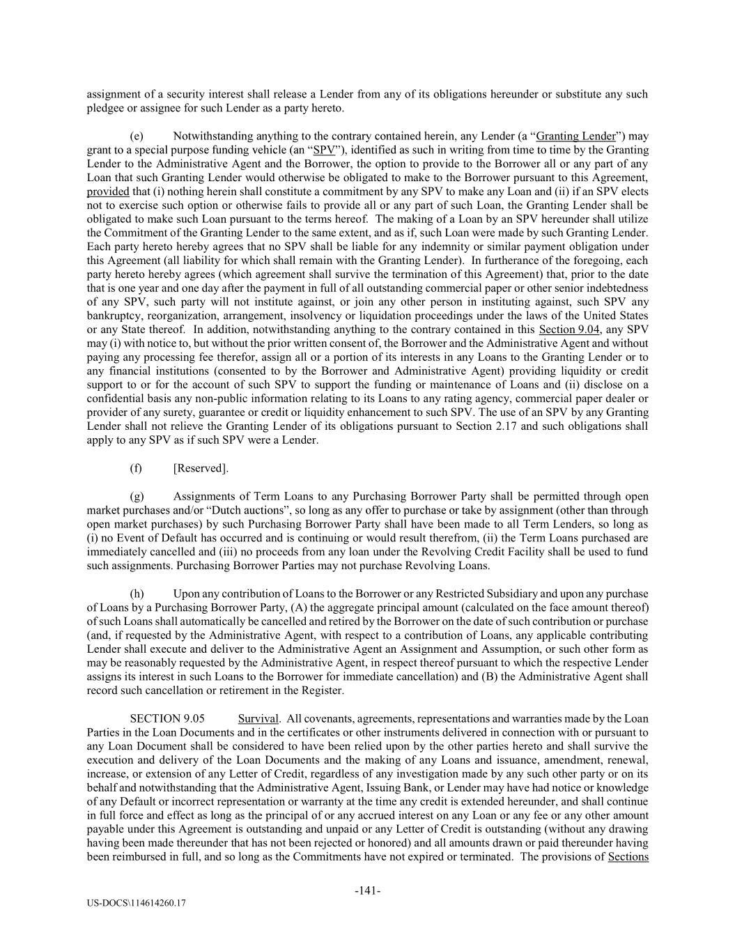 assignment of a security interest shall release a Lender from any of its obligations hereunder or substitute any such pledgee or assignee for such Lender as a party hereto. (e) Granting Lender SPV he Granting Lender to the Administrative Agent and the Borrower, the option to provide to the Borrower all or any part of any Loan that such Granting Lender would otherwise be obligated to make to the Borrower pursuant to this Agreement, provided that (i) nothing herein shall constitute a commitment by any SPV to make any Loan and (ii) if an SPV elects not to exercise such option or otherwise fails to provide all or any part of such Loan, the Granting Lender shall be obligated to make such Loan pursuant to the terms hereof. The making of a Loan by an SPV hereunder shall utilize the Commitment of the Granting Lender to the same extent, and as if, such Loan were made by such Granting Lender. Each party hereto hereby agrees that no SPV shall be liable for any indemnity or similar payment obligation under this Agreement (all liability for which shall remain with the Granting Lender). In furtherance of the foregoing, each party hereto hereby agrees (which agreement shall survive the termination of this Agreement) that, prior to the date that is one year and one day after the payment in full of all outstanding commercial paper or other senior indebtedness of any SPV, such party will not institute against, or join any other person in instituting against, such SPV any bankruptcy, reorganization, arrangement, insolvency or liquidation proceedings under the laws of the United States or any State thereof. In addition, notwithstanding anything to the contrary contained in this Section 9.04, any SPV may (i) with notice to, but without the prior written consent of, the Borrower and the Administrative Agent and without paying any processing fee therefor, assign all or a portion of its interests in any Loans to the Granting Lender or to any financial institutions (consented to by the Borrower and Administrative Agent) providing liquidity or credit support to or for the account of such SPV to support the funding or maintenance of Loans and (ii) disclose on a confidential basis any non-public information relating to its Loans to any rating agency, commercial paper dealer or provider of any surety, guarantee or credit or liquidity enhancement to such SPV. The use of an SPV by any Granting Lender shall not relieve the Granting Lender of its obligations pursuant to Section 2.17 and such obligations shall apply to any SPV as if such SPV were a Lender. (f) [Reserved]. (g) Assignments of Term Loans to any Purchasing Borrower Party shall be permitted through open open market purchases) by such Purchasing Borrower Party shall have been made to all Term Lenders, so long as (i) no Event of Default has occurred and is continuing or would result therefrom, (ii) the Term Loans purchased are immediately cancelled and (iii) no proceeds from any loan under the Revolving Credit Facility shall be used to fund such assignments. Purchasing Borrower Parties may not purchase Revolving Loans. (h) Upon any contribution of Loans to the Borrower or any Restricted Subsidiary and upon any purchase of Loans by a Purchasing Borrower Party, (A) the aggregate principal amount (calculated on the face amount thereof) of such Loans shall automatically be cancelled and retired by the Borrower on the date of such contribution or purchase (and, if requested by the Administrative Agent, with respect to a contribution of Loans, any applicable contributing Lender shall execute and deliver to the Administrative Agent an Assignment and Assumption, or such other form as may be reasonably requested by the Administrative Agent, in respect thereof pursuant to which the respective Lender assigns its interest in such Loans to the Borrower for immediate cancellation) and (B) the Administrative Agent shall record such cancellation or retirement in the Register. SECTION 9.05 Survival. All covenants, agreements, representations and warranties made by the Loan Parties in the Loan Documents and in the certificates or other instruments delivered in connection with or pursuant to any Loan Document shall be considered to have been relied upon by the other parties hereto and shall survive the execution and delivery of the Loan Documents and the making of any Loans and issuance, amendment, renewal, increase, or extension of any Letter of Credit, regardless of any investigation made by any such other party or on its behalf and notwithstanding that the Administrative Agent, Issuing Bank, or Lender may have had notice or knowledge of any Default or incorrect representation or warranty at the time any credit is extended hereunder, and shall continue in full force and effect as long as the principal of or any accrued interest on any Loan or any fee or any other amount payable under this Agreement is outstanding and unpaid or any Letter of Credit is outstanding (without any drawing having been made thereunder that has not been rejected or honored) and all amounts drawn or paid thereunder having been reimbursed in full, and so long as the Commitments have not expired or terminated. The provisions of Sections -141- US-DOCS\114614260.17