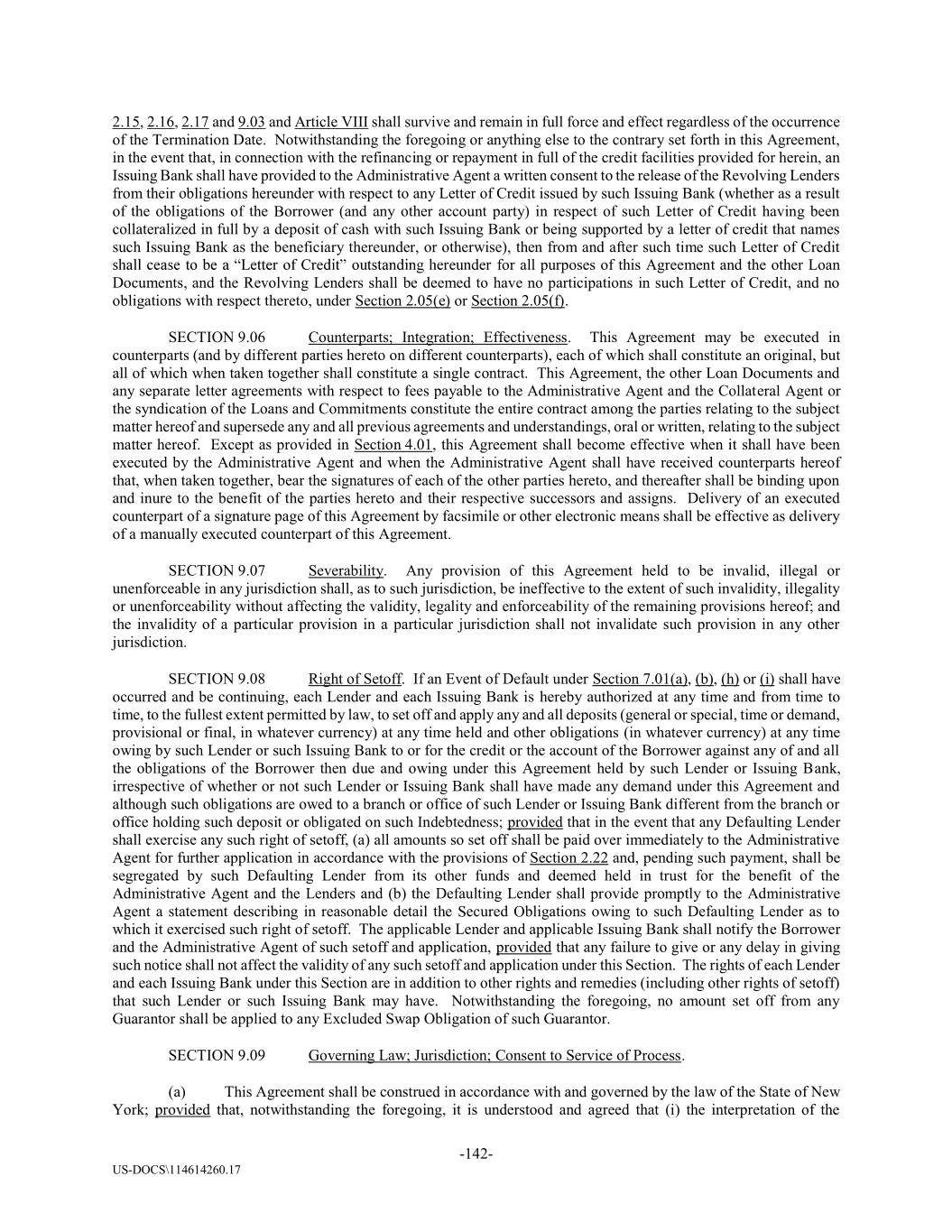 2.15, 2.16, 2.17 and 9.03 and Article VIII shall survive and remain in full force and effect regardless of the occurrence of the Termination Date. Notwithstanding the foregoing or anything else to the contrary set forth in this Agreement, in the event that, in connection with the refinancing or repayment in full of the credit facilities provided for herein, an Issuing Bank shall have provided to the Administrative Agent a written consent to the release of the Revolving Lenders from their obligations hereunder with respect to any Letter of Credit issued by such Issuing Bank (whether as a result of the obligations of the Borrower (and any other account party) in respect of such Letter of Credit having been collateralized in full by a deposit of cash with such Issuing Bank or being supported by a letter of credit that names such Issuing Bank as the beneficiary thereunder, or otherwise), then from and after such time such Letter of Credit for all purposes of this Agreement and the other Loan Documents, and the Revolving Lenders shall be deemed to have no participations in such Letter of Credit, and no obligations with respect thereto, under Section 2.05(e) or Section 2.05(f). SECTION 9.06 Counterparts; Integration; Effectiveness. This Agreement may be executed in counterparts (and by different parties hereto on different counterparts), each of which shall constitute an original, but all of which when taken together shall constitute a single contract. This Agreement, the other Loan Documents and any separate letter agreements with respect to fees payable to the Administrative Agent and the Collateral Agent or the syndication of the Loans and Commitments constitute the entire contract among the parties relating to the subject matter hereof and supersede any and all previous agreements and understandings, oral or written, relating to the subject matter hereof. Except as provided in Section 4.01, this Agreement shall become effective when it shall have been executed by the Administrative Agent and when the Administrative Agent shall have received counterparts hereof that, when taken together, bear the signatures of each of the other parties hereto, and thereafter shall be binding upon and inure to the benefit of the parties hereto and their respective successors and assigns. Delivery of an executed counterpart of a signature page of this Agreement by facsimile or other electronic means shall be effective as delivery of a manually executed counterpart of this Agreement. SECTION 9.07 Severability. Any provision of this Agreement held to be invalid, illegal or unenforceable in any jurisdiction shall, as to such jurisdiction, be ineffective to the extent of such invalidity, illegality or unenforceability without affecting the validity, legality and enforceability of the remaining provisions hereof; and the invalidity of a particular provision in a particular jurisdiction shall not invalidate such provision in any other jurisdiction. SECTION 9.08 Right of Setoff. If an Event of Default under Section 7.01(a), (b), (h) or (i) shall have occurred and be continuing, each Lender and each Issuing Bank is hereby authorized at any time and from time to time, to the fullest extent permitted by law, to set off and apply any and all deposits (general or special, time or demand, provisional or final, in whatever currency) at any time held and other obligations (in whatever currency) at any time owing by such Lender or such Issuing Bank to or for the credit or the account of the Borrower against any of and all the obligations of the Borrower then due and owing under this Agreement held by such Lender or Issuing Bank, irrespective of whether or not such Lender or Issuing Bank shall have made any demand under this Agreement and although such obligations are owed to a branch or office of such Lender or Issuing Bank different from the branch or office holding such deposit or obligated on such Indebtedness; provided that in the event that any Defaulting Lender shall exercise any such right of setoff, (a) all amounts so set off shall be paid over immediately to the Administrative Agent for further application in accordance with the provisions of Section 2.22 and, pending such payment, shall be segregated by such Defaulting Lender from its other funds and deemed held in trust for the benefit of the Administrative Agent and the Lenders and (b) the Defaulting Lender shall provide promptly to the Administrative Agent a statement describing in reasonable detail the Secured Obligations owing to such Defaulting Lender as to which it exercised such right of setoff. The applicable Lender and applicable Issuing Bank shall notify the Borrower and the Administrative Agent of such setoff and application, provided that any failure to give or any delay in giving such notice shall not affect the validity of any such setoff and application under this Section. The rights of each Lender and each Issuing Bank under this Section are in addition to other rights and remedies (including other rights of setoff) that such Lender or such Issuing Bank may have. Notwithstanding the foregoing, no amount set off from any Guarantor shall be applied to any Excluded Swap Obligation of such Guarantor. SECTION 9.09 Governing Law; Jurisdiction; Consent to Service of Process. (a) This Agreement shall be construed in accordance with and governed by the law of the State of New York; provided that, notwithstanding the foregoing, it is understood and agreed that (i) the interpretation of the -142- US-DOCS\114614260.17