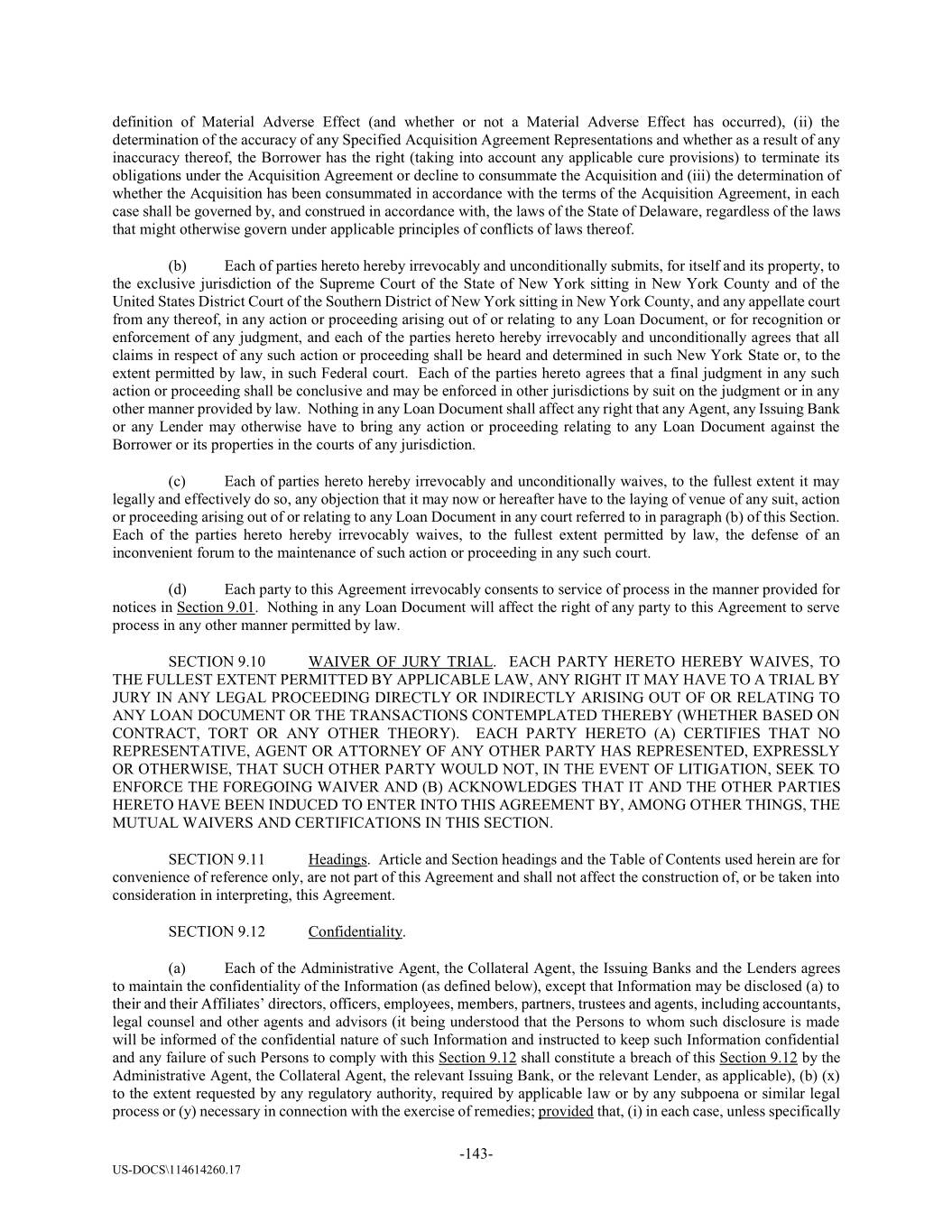 definition of Material Adverse Effect (and whether or not a Material Adverse Effect has occurred), (ii) the determination of the accuracy of any Specified Acquisition Agreement Representations and whether as a result of any inaccuracy thereof, the Borrower has the right (taking into account any applicable cure provisions) to terminate its obligations under the Acquisition Agreement or decline to consummate the Acquisition and (iii) the determination of whether the Acquisition has been consummated in accordance with the terms of the Acquisition Agreement, in each case shall be governed by, and construed in accordance with, the laws of the State of Delaware, regardless of the laws that might otherwise govern under applicable principles of conflicts of laws thereof. (b) Each of parties hereto hereby irrevocably and unconditionally submits, for itself and its property, to the exclusive jurisdiction of the Supreme Court of the State of New York sitting in New York County and of the United States District Court of the Southern District of New York sitting in New York County, and any appellate court from any thereof, in any action or proceeding arising out of or relating to any Loan Document, or for recognition or enforcement of any judgment, and each of the parties hereto hereby irrevocably and unconditionally agrees that all claims in respect of any such action or proceeding shall be heard and determined in such New York State or, to the extent permitted by law, in such Federal court. Each of the parties hereto agrees that a final judgment in any such action or proceeding shall be conclusive and may be enforced in other jurisdictions by suit on the judgment or in any other manner provided by law. Nothing in any Loan Document shall affect any right that any Agent, any Issuing Bank or any Lender may otherwise have to bring any action or proceeding relating to any Loan Document against the Borrower or its properties in the courts of any jurisdiction. (c) Each of parties hereto hereby irrevocably and unconditionally waives, to the fullest extent it may legally and effectively do so, any objection that it may now or hereafter have to the laying of venue of any suit, action or proceeding arising out of or relating to any Loan Document in any court referred to in paragraph (b) of this Section. Each of the parties hereto hereby irrevocably waives, to the fullest extent permitted by law, the defense of an inconvenient forum to the maintenance of such action or proceeding in any such court. (d) Each party to this Agreement irrevocably consents to service of process in the manner provided for notices in Section 9.01. Nothing in any Loan Document will affect the right of any party to this Agreement to serve process in any other manner permitted by law. SECTION 9.10 WAIVER OF JURY TRIAL. EACH PARTY HERETO HEREBY WAIVES, TO THE FULLEST EXTENT PERMITTED BY APPLICABLE LAW, ANY RIGHT IT MAY HAVE TO A TRIAL BY JURY IN ANY LEGAL PROCEEDING DIRECTLY OR INDIRECTLY ARISING OUT OF OR RELATING TO ANY LOAN DOCUMENT OR THE TRANSACTIONS CONTEMPLATED THEREBY (WHETHER BASED ON CONTRACT, TORT OR ANY OTHER THEORY). EACH PARTY HERETO (A) CERTIFIES THAT NO REPRESENTATIVE, AGENT OR ATTORNEY OF ANY OTHER PARTY HAS REPRESENTED, EXPRESSLY OR OTHERWISE, THAT SUCH OTHER PARTY WOULD NOT, IN THE EVENT OF LITIGATION, SEEK TO ENFORCE THE FOREGOING WAIVER AND (B) ACKNOWLEDGES THAT IT AND THE OTHER PARTIES HERETO HAVE BEEN INDUCED TO ENTER INTO THIS AGREEMENT BY, AMONG OTHER THINGS, THE MUTUAL WAIVERS AND CERTIFICATIONS IN THIS SECTION. SECTION 9.11 Headings. Article and Section headings and the Table of Contents used herein are for convenience of reference only, are not part of this Agreement and shall not affect the construction of, or be taken into consideration in interpreting, this Agreement. SECTION 9.12 Confidentiality. (a) Each of the Administrative Agent, the Collateral Agent, the Issuing Banks and the Lenders agrees to maintain the confidentiality of the Information (as defined below), except that Information may be disclosed (a) to nts, legal counsel and other agents and advisors (it being understood that the Persons to whom such disclosure is made will be informed of the confidential nature of such Information and instructed to keep such Information confidential and any failure of such Persons to comply with this Section 9.12 shall constitute a breach of this Section 9.12 by the Administrative Agent, the Collateral Agent, the relevant Issuing Bank, or the relevant Lender, as applicable), (b) (x) to the extent requested by any regulatory authority, required by applicable law or by any subpoena or similar legal process or (y) necessary in connection with the exercise of remedies; provided that, (i) in each case, unless specifically -143- US-DOCS\114614260.17