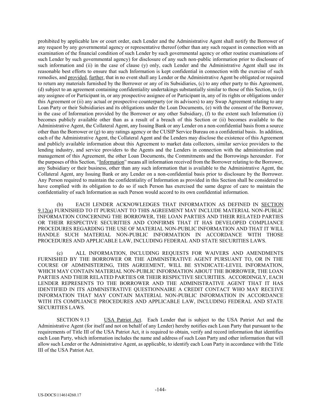 prohibited by applicable law or court order, each Lender and the Administrative Agent shall notify the Borrower of any request by any governmental agency or representative thereof (other than any such request in connection with an examination of the financial condition of such Lender by such governmental agency or other routine examinations of such Lender by such governmental agency) for disclosure of any such non-public information prior to disclosure of such information and (ii) in the case of clause (y) only, each Lender and the Administrative Agent shall use its reasonable best efforts to ensure that such Information is kept confidential in connection with the exercise of such remedies, and provided, further, that in no event shall any Lender or the Administrative Agent be obligated or required to return any materials furnished by the Borrower or any of its Subsidiaries, (c) to any other party to this Agreement, (d) subject to an agreement containing confidentiality undertakings substantially similar to those of this Section, to (i) any assignee of or Participant in, or any prospective assignee of or Participant in, any of its rights or obligations under this Agreement or (ii) any actual or prospective counterparty (or its advisors) to any Swap Agreement relating to any Loan Party or their Subsidiaries and its obligations under the Loan Documents, (e) with the consent of the Borrower, in the case of Information provided by the Borrower or any other Subsidiary, (f) to the extent such Information (i) becomes publicly available other than as a result of a breach of this Section or (ii) becomes available to the Administrative Agent, the Collateral Agent, any Issuing Bank or any Lender on a non-confidential basis from a source other than the Borrower or (g) to any ratings agency or the CUSIP Service Bureau on a confidential basis. In addition, each of the Administrative Agent, the Collateral Agent and the Lenders may disclose the existence of this Agreement and publicly available information about this Agreement to market data collectors, similar service providers to the lending industry, and service providers to the Agents and the Lenders in connection with the administration and management of this Agreement, the other Loan Documents, the Commitments and the Borrowings hereunder. For Information received from the Borrower relating to the Borrower, any Subsidiary or their business, other than any such information that is available to the Administrative Agent, the Collateral Agent, any Issuing Bank or any Lender on a non-confidential basis prior to disclosure by the Borrower. Any Person required to maintain the confidentiality of Information as provided in this Section shall be considered to have complied with its obligation to do so if such Person has exercised the same degree of care to maintain the confidentiality of such Information as such Person would accord to its own confidential information. (b) EACH LENDER ACKNOWLEDGES THAT INFORMATION AS DEFINED IN SECTION 9.12(a) FURNISHED TO IT PURSUANT TO THIS AGREEMENT MAY INCLUDE MATERIAL NON-PUBLIC INFORMATION CONCERNING THE BORROWER, THE LOAN PARTIES AND THEIR RELATED PARTIES OR THEIR RESPECTIVE SECURITIES AND CONFIRMS THAT IT HAS DEVELOPED COMPLIANCE PROCEDURES REGARDING THE USE OF MATERIAL NON-PUBLIC INFORMATION AND THAT IT WILL HANDLE SUCH MATERIAL NON-PUBLIC INFORMATION IN ACCORDANCE WITH THOSE PROCEDURES AND APPLICABLE LAW, INCLUDING FEDERAL AND STATE SECURITIES LAWS. (c) ALL INFORMATION, INCLUDING REQUESTS FOR WAIVERS AND AMENDMENTS FURNISHED BY THE BORROWER OR THE ADMINISTRATIVE AGENT PURSUANT TO, OR IN THE COURSE OF ADMINISTERING, THIS AGREEMENT, WILL BE SYNDICATE-LEVEL INFORMATION, WHICH MAY CONTAIN MATERIAL NON-PUBLIC INFORMATION ABOUT THE BORROWER, THE LOAN PARTIES AND THEIR RELATED PARTIES OR THEIR RESPECTIVE SECURITIES. ACCORDINGLY, EACH LENDER REPRESENTS TO THE BORROWER AND THE ADMINISTRATIVE AGENT THAT IT HAS IDENTIFIED IN ITS ADMINISTRATIVE QUESTIONNAIRE A CREDIT CONTACT WHO MAY RECEIVE INFORMATION THAT MAY CONTAIN MATERIAL NON-PUBLIC INFORMATION IN ACCORDANCE WITH ITS COMPLIANCE PROCEDURES AND APPLICABLE LAW, INCLUDING FEDERAL AND STATE SECURITIES LAWS. SECTION 9.13 USA Patriot Act. Each Lender that is subject to the USA Patriot Act and the Administrative Agent (for itself and not on behalf of any Lender) hereby notifies each Loan Party that pursuant to the requirements of Title III of the USA Patriot Act, it is required to obtain, verify and record information that identifies each Loan Party, which information includes the name and address of such Loan Party and other information that will allow such Lender or the Administrative Agent, as applicable, to identify each Loan Party in accordance with the Title III of the USA Patriot Act. -144- US-DOCS\114614260.17