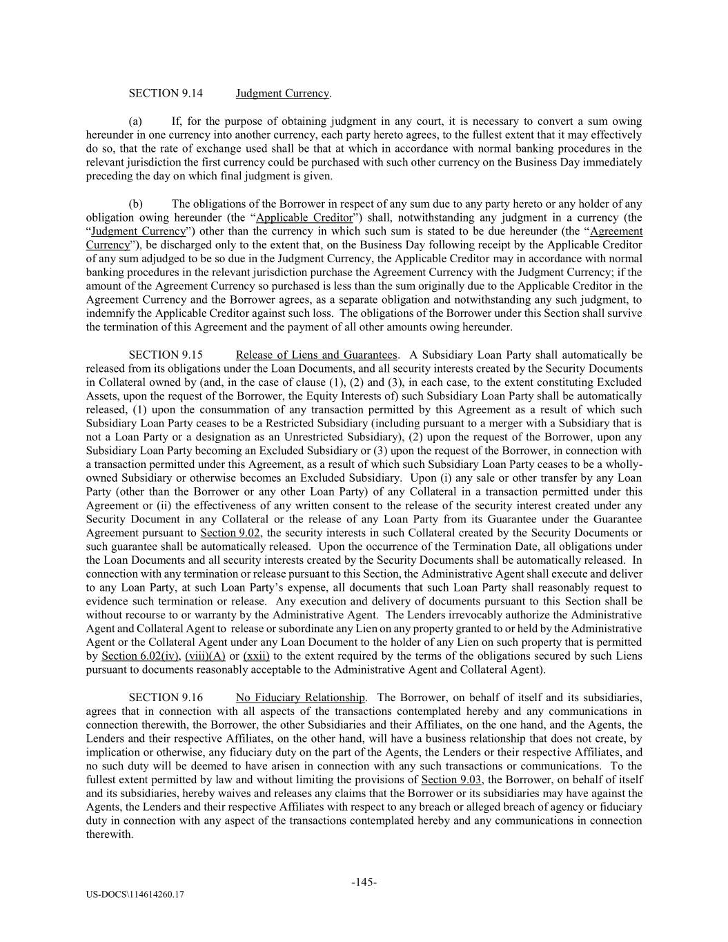 SECTION 9.14 Judgment Currency. (a) If, for the purpose of obtaining judgment in any court, it is necessary to convert a sum owing hereunder in one currency into another currency, each party hereto agrees, to the fullest extent that it may effectively do so, that the rate of exchange used shall be that at which in accordance with normal banking procedures in the relevant jurisdiction the first currency could be purchased with such other currency on the Business Day immediately preceding the day on which final judgment is given. (b) The obligations of the Borrower in respect of any sum due to any party hereto or any holder of any Applicable Creditor Judgment Currency Agreement Currency of any sum adjudged to be so due in the Judgment Currency, the Applicable Creditor may in accordance with normal banking procedures in the relevant jurisdiction purchase the Agreement Currency with the Judgment Currency; if the amount of the Agreement Currency so purchased is less than the sum originally due to the Applicable Creditor in the Agreement Currency and the Borrower agrees, as a separate obligation and notwithstanding any such judgment, to indemnify the Applicable Creditor against such loss. The obligations of the Borrower under this Section shall survive the termination of this Agreement and the payment of all other amounts owing hereunder. SECTION 9.15 Release of Liens and Guarantees. A Subsidiary Loan Party shall automatically be released from its obligations under the Loan Documents, and all security interests created by the Security Documents in Collateral owned by (and, in the case of clause (1), (2) and (3), in each case, to the extent constituting Excluded Assets, upon the request of the Borrower, the Equity Interests of) such Subsidiary Loan Party shall be automatically released, (1) upon the consummation of any transaction permitted by this Agreement as a result of which such Subsidiary Loan Party ceases to be a Restricted Subsidiary (including pursuant to a merger with a Subsidiary that is not a Loan Party or a designation as an Unrestricted Subsidiary), (2) upon the request of the Borrower, upon any Subsidiary Loan Party becoming an Excluded Subsidiary or (3) upon the request of the Borrower, in connection with a transaction permitted under this Agreement, as a result of which such Subsidiary Loan Party ceases to be a wholly- owned Subsidiary or otherwise becomes an Excluded Subsidiary. Upon (i) any sale or other transfer by any Loan Party (other than the Borrower or any other Loan Party) of any Collateral in a transaction permitted under this Agreement or (ii) the effectiveness of any written consent to the release of the security interest created under any Security Document in any Collateral or the release of any Loan Party from its Guarantee under the Guarantee Agreement pursuant to Section 9.02, the security interests in such Collateral created by the Security Documents or such guarantee shall be automatically released. Upon the occurrence of the Termination Date, all obligations under the Loan Documents and all security interests created by the Security Documents shall be automatically released. In connection with any termination or release pursuant to this Section, the Administrative Agent shall execute and deliver evidence such termination or release. Any execution and delivery of documents pursuant to this Section shall be without recourse to or warranty by the Administrative Agent. The Lenders irrevocably authorize the Administrative Agent and Collateral Agent to release or subordinate any Lien on any property granted to or held by the Administrative Agent or the Collateral Agent under any Loan Document to the holder of any Lien on such property that is permitted by Section 6.02(iv), (viii)(A) or (xxii) to the extent required by the terms of the obligations secured by such Liens pursuant to documents reasonably acceptable to the Administrative Agent and Collateral Agent). SECTION 9.16 No Fiduciary Relationship. The Borrower, on behalf of itself and its subsidiaries, agrees that in connection with all aspects of the transactions contemplated hereby and any communications in connection therewith, the Borrower, the other Subsidiaries and their Affiliates, on the one hand, and the Agents, the Lenders and their respective Affiliates, on the other hand, will have a business relationship that does not create, by implication or otherwise, any fiduciary duty on the part of the Agents, the Lenders or their respective Affiliates, and no such duty will be deemed to have arisen in connection with any such transactions or communications. To the fullest extent permitted by law and without limiting the provisions of Section 9.03, the Borrower, on behalf of itself and its subsidiaries, hereby waives and releases any claims that the Borrower or its subsidiaries may have against the Agents, the Lenders and their respective Affiliates with respect to any breach or alleged breach of agency or fiduciary duty in connection with any aspect of the transactions contemplated hereby and any communications in connection therewith. -145- US-DOCS\114614260.17