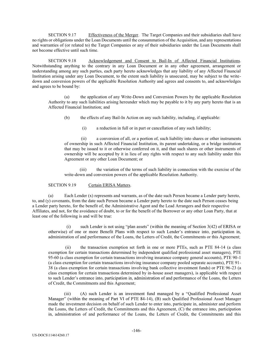 SECTION 9.17 Effectiveness of the Merger. The Target Companies and their subsidiaries shall have no rights or obligations under the Loan Documents until the consummation of the Acquisition, and any representations and warranties of (or related to) the Target Companies or any of their subsidiaries under the Loan Documents shall not become effective until such time. SECTION 9.18 Acknowledgement and Consent to Bail-In of Affected Financial Institutions. Notwithstanding anything to the contrary in any Loan Document or in any other agreement, arrangement or understanding among any such parties, each party hereto acknowledges that any liability of any Affected Financial Institution arising under any Loan Document, to the extent such liability is unsecured, may be subject to the write- down and conversion powers of the applicable Resolution Authority and agrees and consents to, and acknowledges and agrees to be bound by: (a) the application of any Write-Down and Conversion Powers by the applicable Resolution Authority to any such liabilities arising hereunder which may be payable to it by any party hereto that is an Affected Financial Institution; and (b) the effects of any Bail-In Action on any such liability, including, if applicable: (i) a reduction in full or in part or cancellation of any such liability; (ii) a conversion of all, or a portion of, such liability into shares or other instruments of ownership in such Affected Financial Institution, its parent undertaking, or a bridge institution that may be issued to it or otherwise conferred on it, and that such shares or other instruments of ownership will be accepted by it in lieu of any rights with respect to any such liability under this Agreement or any other Loan Document; or (iii) the variation of the terms of such liability in connection with the exercise of the write-down and conversion powers of the applicable Resolution Authority. SECTION 9.19 Certain ERISA Matters. (a) Each Lender (x) represents and warrants, as of the date such Person became a Lender party hereto, to, and (y) covenants, from the date such Person became a Lender party hereto to the date such Person ceases being a Lender party hereto, for the benefit of, the Administrative Agent and the Lead Arrangers and their respective Affiliates, and not, for the avoidance of doubt, to or for the benefit of the Borrower or any other Loan Party, that at least one of the following is and will be true: (i) administration of and performance of the Loans, the Letters of Credit, the Commitments or this Agreement; (ii) the transaction exemption set forth in one or more PTEs, such as PTE 84-14 (a class exemption for certain transactions determined by independent qualified professional asset managers), PTE 95-60 (a class exemption for certain transactions involving insurance company general accounts), PTE 90-1 (a class exemption for certain transactions involving insurance company pooled separate accounts), PTE 91- 38 (a class exemption for certain transactions involving bank collective investment funds) or PTE 96-23 (a class exemption for certain transactions determined by in-house asset managers), is applicable with respect ce of the Loans, the Letters of Credit, the Commitments and this Agreement; (iii) -14), (B) such Qualified Professional Asset Manager made the investment decision on behalf of such Lender to enter into, participate in, administer and perform the Loans, the Letters of Credit, the Commitments and this Agreement, (C) the entrance into, participation in, administration of and performance of the Loans, the Letters of Credit, the Commitments and this -146- US-DOCS\114614260.17