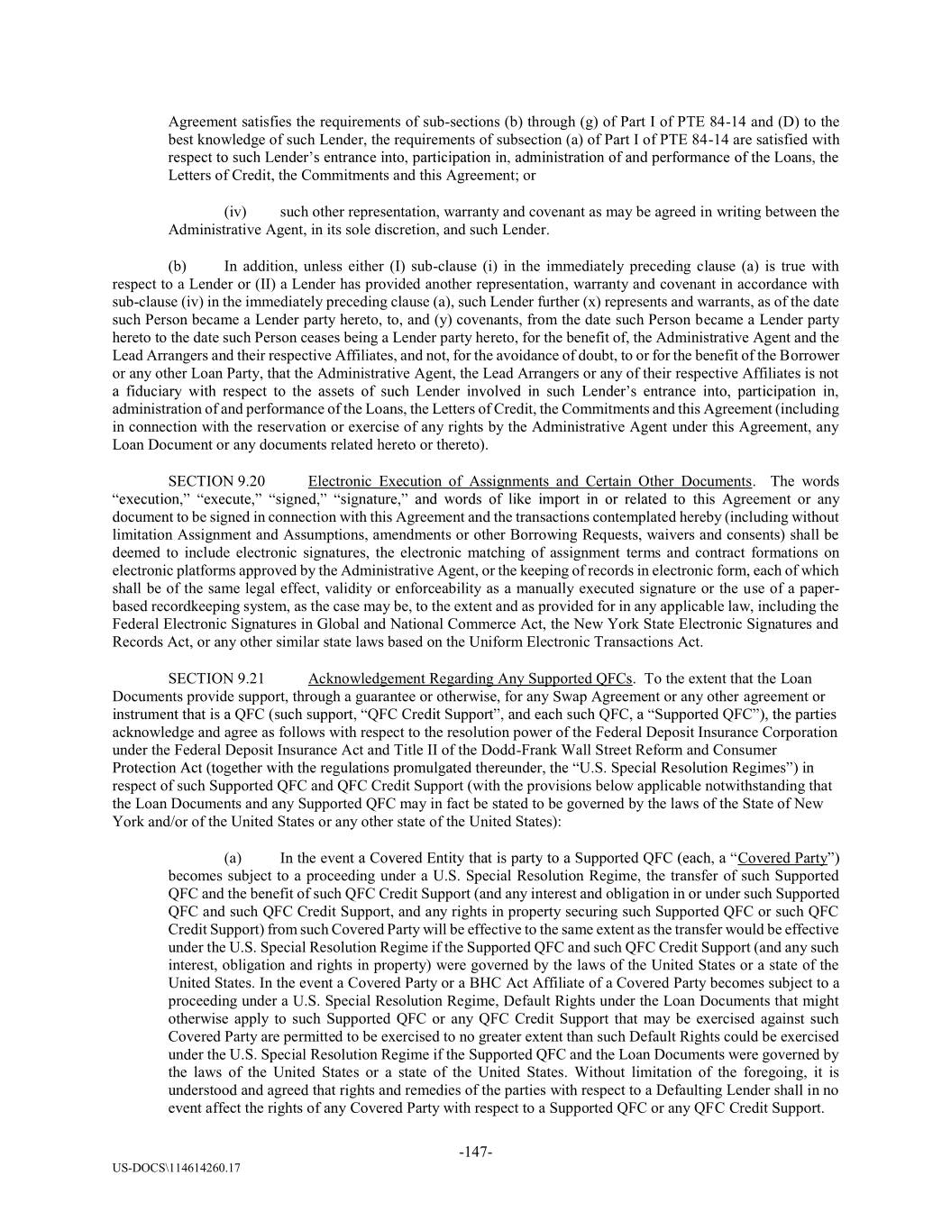 Agreement satisfies the requirements of sub-sections (b) through (g) of Part I of PTE 84-14 and (D) to the best knowledge of such Lender, the requirements of subsection (a) of Part I of PTE 84-14 are satisfied with Letters of Credit, the Commitments and this Agreement; or (iv) such other representation, warranty and covenant as may be agreed in writing between the Administrative Agent, in its sole discretion, and such Lender. (b) In addition, unless either (I) sub-clause (i) in the immediately preceding clause (a) is true with respect to a Lender or (II) a Lender has provided another representation, warranty and covenant in accordance with sub-clause (iv) in the immediately preceding clause (a), such Lender further (x) represents and warrants, as of the date such Person became a Lender party hereto, to, and (y) covenants, from the date such Person became a Lender party hereto to the date such Person ceases being a Lender party hereto, for the benefit of, the Administrative Agent and the Lead Arrangers and their respective Affiliates, and not, for the avoidance of doubt, to or for the benefit of the Borrower or any other Loan Party, that the Administrative Agent, the Lead Arrangers or any of their respective Affiliates is not administration of and performance of the Loans, the Letters of Credit, the Commitments and this Agreement (including in connection with the reservation or exercise of any rights by the Administrative Agent under this Agreement, any Loan Document or any documents related hereto or thereto). SECTION 9.20 Electronic Execution of Assignments and Certain Other Documents. The words this Agreement or any document to be signed in connection with this Agreement and the transactions contemplated hereby (including without limitation Assignment and Assumptions, amendments or other Borrowing Requests, waivers and consents) shall be deemed to include electronic signatures, the electronic matching of assignment terms and contract formations on electronic platforms approved by the Administrative Agent, or the keeping of records in electronic form, each of which shall be of the same legal effect, validity or enforceability as a manually executed signature or the use of a paper- based recordkeeping system, as the case may be, to the extent and as provided for in any applicable law, including the Federal Electronic Signatures in Global and National Commerce Act, the New York State Electronic Signatures and Records Act, or any other similar state laws based on the Uniform Electronic Transactions Act. SECTION 9.21 Acknowledgement Regarding Any Supported QFCs. To the extent that the Loan Documents provide support, through a guarantee or otherwise, for any Swap Agreement or any other agreement or acknowledge and agree as follows with respect to the resolution power of the Federal Deposit Insurance Corporation under the Federal Deposit Insurance Act and Title II of the Dodd-Frank Wall Street Reform and Consumer respect of such Supported QFC and QFC Credit Support (with the provisions below applicable notwithstanding that the Loan Documents and any Supported QFC may in fact be stated to be governed by the laws of the State of New York and/or of the United States or any other state of the United States): (a) In the eve Covered Party becomes subject to a proceeding under a U.S. Special Resolution Regime, the transfer of such Supported QFC and the benefit of such QFC Credit Support (and any interest and obligation in or under such Supported QFC and such QFC Credit Support, and any rights in property securing such Supported QFC or such QFC Credit Support) from such Covered Party will be effective to the same extent as the transfer would be effective under the U.S. Special Resolution Regime if the Supported QFC and such QFC Credit Support (and any such interest, obligation and rights in property) were governed by the laws of the United States or a state of the United States. In the event a Covered Party or a BHC Act Affiliate of a Covered Party becomes subject to a proceeding under a U.S. Special Resolution Regime, Default Rights under the Loan Documents that might otherwise apply to such Supported QFC or any QFC Credit Support that may be exercised against such Covered Party are permitted to be exercised to no greater extent than such Default Rights could be exercised under the U.S. Special Resolution Regime if the Supported QFC and the Loan Documents were governed by the laws of the United States or a state of the United States. Without limitation of the foregoing, it is understood and agreed that rights and remedies of the parties with respect to a Defaulting Lender shall in no event affect the rights of any Covered Party with respect to a Supported QFC or any QFC Credit Support. -147- US-DOCS\114614260.17