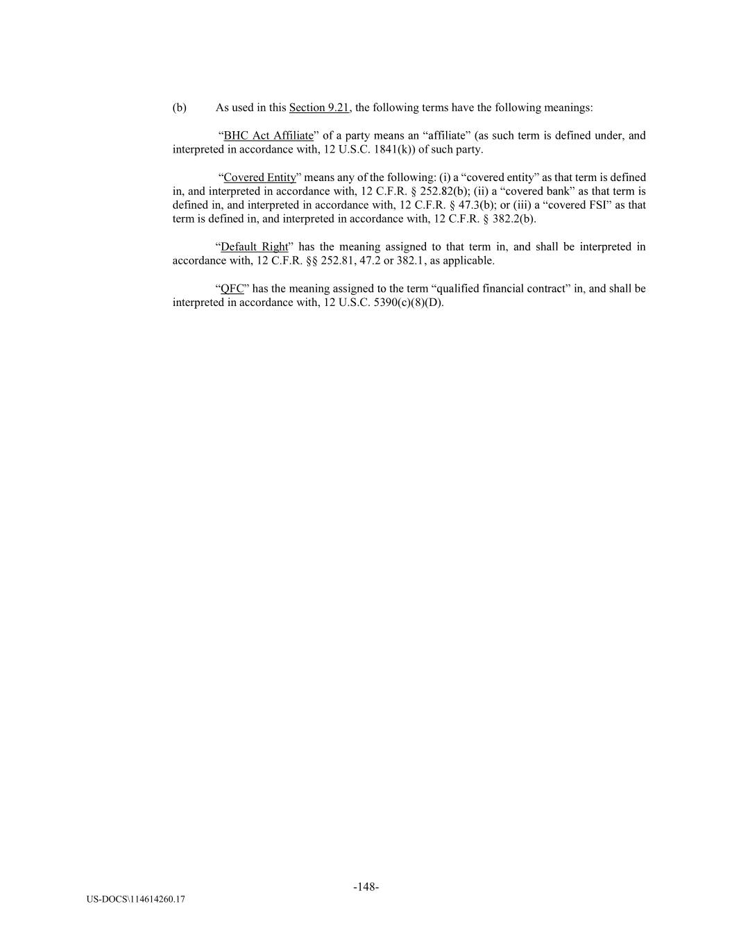 (b) As used in this Section 9.21, the following terms have the following meanings: BHC Act Affiliate interpreted in accordance with, 12 U.S.C. 1841(k)) of such party. Covered Entity in, and interpreted in accordance with, 12 C.F.R. § defined in, and interpreted in accordance with, 12 C.F.R. § 4 term is defined in, and interpreted in accordance with, 12 C.F.R. § 382.2(b). Default Right accordance with, 12 C.F.R. §§ 252.81, 47.2 or 382.1, as applicable. QFC interpreted in accordance with, 12 U.S.C. 5390(c)(8)(D). -148- US-DOCS\114614260.17