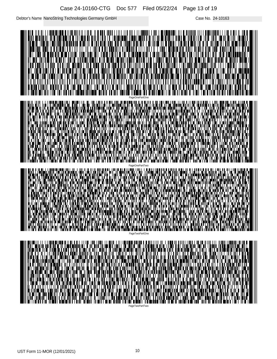 UST Form 11-MOR (12/01/2021) 10 Debtor's Name NanoString Technologies Germany GmbH Case No. 24-10163 PageOnePartOne PageOnePartTwo PageTwoPartOne PageTwoPartTwo Case 24-10160-CTG Doc 577 Filed 05/22/24 Page 13 of 19