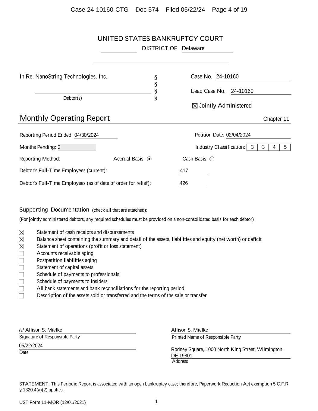 UST Form 11-MOR (12/01/2021) 1 UNITED STATES BANKRUPTCY COURT DISTRICT OF Delaware In Re. NanoString Technologies, Inc. Debtor(s) § § § § Case No. 24-10160 Lead Case No. 24-10160 Jointly Administered Monthly Operating Report Chapter 11 Reporting Period Ended: 04/30/2024 Petition Date: 02/04/2024 Months Pending: 3 Industry Classification: 3 3 4 5 Reporting Method: Accrual Basis Cash Basis Debtor's Full-Time Employees (current): 417 Debtor's Full-Time Employees (as of date of order for relief): 426 Supporting Documentation (check all that are attached): (For jointly administered debtors, any required schedules must be provided on a non-consolidated basis for each debtor) Statement of cash receipts and disbursements Balance sheet containing the summary and detail of the assets, liabilities and equity (net worth) or deficit Statement of operations (profit or loss statement) Accounts receivable aging Postpetition liabilities aging Statement of capital assets Schedule of payments to professionals Schedule of payments to insiders All bank statements and bank reconciliations for the reporting period Description of the assets sold or transferred and the terms of the sale or transfer Signature of Responsible Party Printed Name of Responsible Party Date Address /s/ Allison S. Mielke 05/22/2024 Allison S. Mielke Rodney Square, 1000 North King Street, Wilmington, DE 19801 STATEMENT: This Periodic Report is associated with an open bankruptcy case; therefore, Paperwork Reduction Act exemption 5 C.F.R. § 1320.4(a)(2) applies. Case 24-10160-CTG Doc 574 Filed 05/22/24 Page 4 of 19