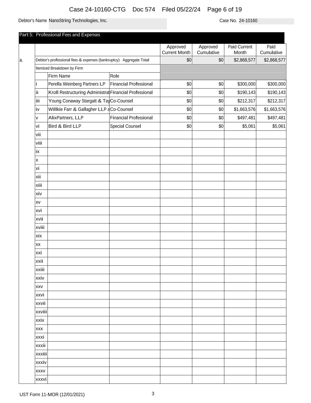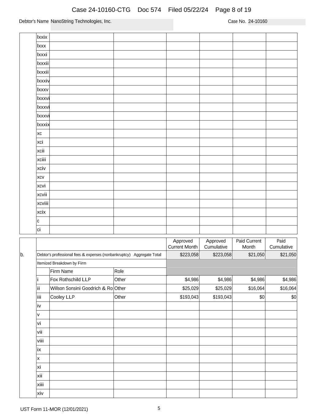UST Form 11-MOR (12/01/2021) 5 Debtor's Name NanoString Technologies Germany GmbH Case No. 24-10163 lxxix lxxx lxxxi lxxxii lxxxii lxxxiv lxxxv lxxxvi lxxxvi lxxxvi lxxxix xc xci xcii xciii xciv xcv xcvi xcvii xcviii xcix c ci Approved Current Month Approved Cumulative Paid Current Month Paid Cumulative b. Debtor's professional fees & expenses (nonbankruptcy) Aggregate Total Itemized Breakdown by Firm Firm Name Role i ii iii iv v vi vii viii ix x xi xii xiii xiv Case 24-10160-CTG Doc 577 Filed 05/22/24 Page 8 of 19