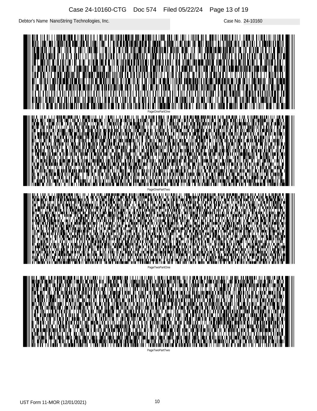 UST Form 11-MOR (12/01/2021) 10 Debtor's Name NanoString Technologies, Inc. Case No. 24-10160 PageOnePartOne PageOnePartTwo PageTwoPartOne PageTwoPartTwo Case 24-10160-CTG Doc 574 Filed 05/22/24 Page 13 of 19