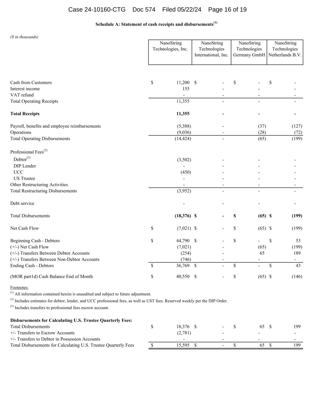 ($ in thousands) NanoString Technologies, Inc. NanoString Technologies International, Inc. NanoString Technologies Germany GmbH NanoString Technologies Netherlands B.V. Cash from Customers 11,200$ -$ -$ -$ Interest income 155 - - - VAT refund - - - - Total Operating Receipts 11,355 - - - Total Receipts 11,355 - - - Payroll, benefits and employee reimbursements (5,388) - (37) (127) Operations (9,036) - (28) (72) Total Operating Disbursements (14,424) - (65) (199) Professional Fees(2) Debtor(3) (3,502) - - - DIP Lender - - - - UCC (450) - - - US Trustee - - - - Other Restructuring Activities - - - - Total Restructuring Disbursements (3,952) - - - Debt service - - - - Total Disbursements (18,376) -$ (65)$ (199)$ Net Cash Flow (7,021)$ -$ (65)$ (199)$ Beginning Cash - Debtors 44,790$ -$ -$ 53$ (+/-) Net Cash Flow (7,021) - (65) (199) (+/-) Transfers Between Debtor Accounts (254) - 65 189 (+/-) Transfers Between Non-Debtor Accounts (746) - - - Ending Cash - Debtors 36,769$ -$ -$ 43$ (MOR part1d) Cash Balance End of Month 40,550$ -$ (65)$ (146)$ Footnotes: (1) All information contained herein is unaudited and subject to future adjustment. (2) Includes estimates for debtor, lender, and UCC professional fees, as well as UST fees. Reserved weekly per the DIP Order. (3) Includes transfers to professional fees escrow account. Disbursements for Calculating U.S. Trustee Quarterly Fees: Total Disbursements 18,376$ -$ 65$ 199$ +/- Transfers to Escrow Accounts (2,781) - - - +/- Transfers to Debtor in Possession Accounts - - - - Total Disbursements for Calculating U.S. Trustee Quarterly Fees 15,595$ -$ 65$ 199$ Schedule A: Statement of cash receipts and disbursements(1) Case 24-10160-CTG Doc 575 Filed 05/22/24 Page 16 of 19