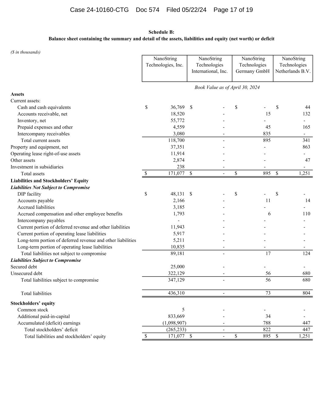 ($ in thousands) NanoString Technologies, Inc. NanoString Technologies International, Inc. NanoString Technologies Germany GmbH NanoString Technologies Netherlands B.V. Assets Current assets: Cash and cash equivalents 36,769$ -$ -$ 44$ Accounts receivable, net 18,520 - 15 132 Inventory, net 55,772 - - - Prepaid expenses and other 4,559 - 45 165 Intercompany receivables 3,080 - 835 - Total current assets 118,700 - 895 341 Property and equipment, net 37,351 - - 863 Operating lease right-of-use assets 11,914 - - - Other assets 2,874 - - 47 Investment in subsidiaries 238 - - - Total assets 171,077$ -$ 895$ 1,251$ Liabilities and Stockholders’ Equity Liabilities Not Subject to Compromise DIP facility 48,131$ -$ -$ -$ Accounts payable 2,166 - 11 14 Accrued liabilities 3,185 - - - Accrued compensation and other employee benefits 1,793 - 6 110 Intercompany payables - - - - Current portion of deferred revenue and other liabilities 11,943 - - - Current portion of operating lease liabilities 5,917 - - - Long-term portion of deferred revenue and other liabilities 5,211 - - - Long-term portion of operating lease liabilities 10,835 - - - Total liabilities not subject to compromise 89,181 - 17 124 Liabilities Subject to Compromise Secured debt 25,000 - - - Unsecured debt 322,129 - 56 680 Total liabilities subject to compromise 347,129 - 56 680 Total liabilities 436,310 - 73 804 Stockholders’ equity Common stock 5 - - - Additional paid-in-capital 833,669 - 34 - Accumulated (deficit) earnings (1,098,907) - 788 447 Total stockholders’ deficit (265,233) - 822 447 Total liabilities and stockholders’ equity 171,077$ -$ 895$ 1,251$ Book Value as of April 30, 2024 Balance sheet containing the summary and detail of the assets, liabilities and equity (net worth) or deficit Schedule B: Case 24-10160-CTG Doc 577 Filed 05/22/24 Page 17 of 19