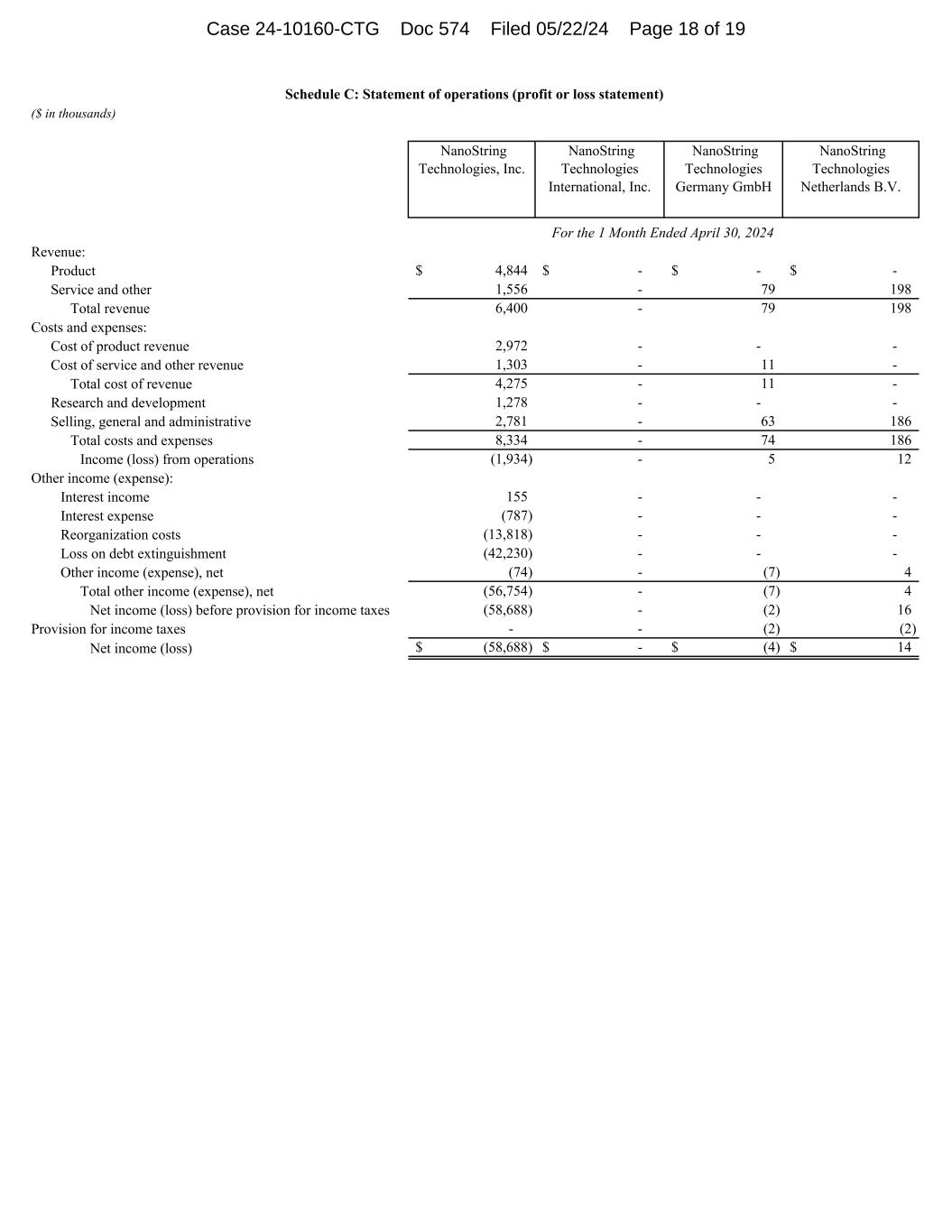 ($ in thousands) NanoString Technologies, Inc. NanoString Technologies International, Inc. NanoString Technologies Germany GmbH NanoString Technologies Netherlands B.V. Revenue: Product 4,844$ -$ -$ -$ Service and other 1,556 - 79 198 Total revenue 6,400 - 79 198 Costs and expenses: Cost of product revenue 2,972 - - - Cost of service and other revenue 1,303 - 11 - Total cost of revenue 4,275 - 11 - Research and development 1,278 - - - Selling, general and administrative 2,781 - 63 186 Total costs and expenses 8,334 - 74 186 Income (loss) from operations (1,934) - 5 12 Other income (expense): Interest income 155 - - - Interest expense (787) - - - Reorganization costs (13,818) - - - Loss on debt extinguishment (42,230) - - - Other income (expense), net (74) - (7) 4 Total other income (expense), net (56,754) - (7) 4 Net income (loss) before provision for income taxes (58,688) - (2) 16 Provision for income taxes - - (2) (2) Net income (loss) (58,688)$ -$ (4)$ 14$ For the 1 Month Ended April 30, 2024 Schedule C: Statement of operations (profit or loss statement) Case 24-10160-CTG Doc 576 Filed 05/22/24 Page 18 of 19