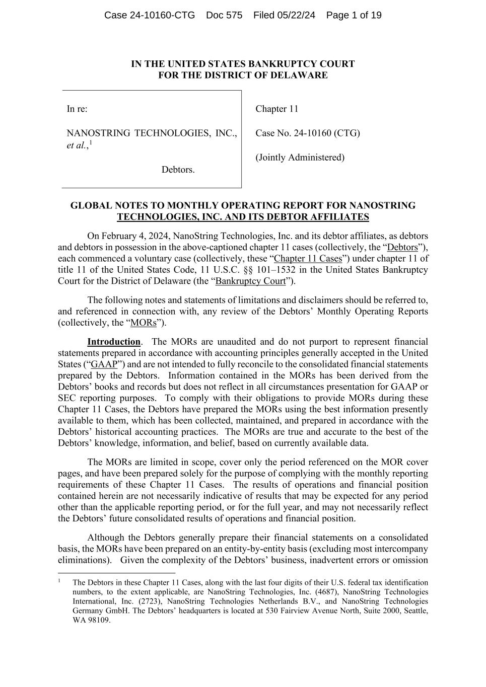 IN THE UNITED STATES BANKRUPTCY COURT FOR THE DISTRICT OF DELAWARE In re: NANOSTRING TECHNOLOGIES, INC., et al.,1 Debtors. Chapter 11 Case No. 24-10160 (CTG) (Jointly Administered) GLOBAL NOTES TO MONTHLY OPERATING REPORT FOR NANOSTRING TECHNOLOGIES, INC. AND ITS DEBTOR AFFILIATES On February 4, 2024, NanoString Technologies, Inc. and its debtor affiliates, as debtors and debtors in possession in the above-captioned chapter 11 cases (collectively, the “Debtors”), each commenced a voluntary case (collectively, these “Chapter 11 Cases”) under chapter 11 of title 11 of the United States Code, 11 U.S.C. §§ 101–1532 in the United States Bankruptcy Court for the District of Delaware (the “Bankruptcy Court”). The following notes and statements of limitations and disclaimers should be referred to, and referenced in connection with, any review of the Debtors’ Monthly Operating Reports (collectively, the “MORs”). Introduction. The MORs are unaudited and do not purport to represent financial statements prepared in accordance with accounting principles generally accepted in the United States (“GAAP”) and are not intended to fully reconcile to the consolidated financial statements prepared by the Debtors. Information contained in the MORs has been derived from the Debtors’ books and records but does not reflect in all circumstances presentation for GAAP or SEC reporting purposes. To comply with their obligations to provide MORs during these Chapter 11 Cases, the Debtors have prepared the MORs using the best information presently available to them, which has been collected, maintained, and prepared in accordance with the Debtors’ historical accounting practices. The MORs are true and accurate to the best of the Debtors’ knowledge, information, and belief, based on currently available data. The MORs are limited in scope, cover only the period referenced on the MOR cover pages, and have been prepared solely for the purpose of complying with the monthly reporting requirements of these Chapter 11 Cases. The results of operations and financial position contained herein are not necessarily indicative of results that may be expected for any period other than the applicable reporting period, or for the full year, and may not necessarily reflect the Debtors’ future consolidated results of operations and financial position. Although the Debtors generally prepare their financial statements on a consolidated basis, the MORs have been prepared on an entity-by-entity basis (excluding most intercompany eliminations). Given the complexity of the Debtors’ business, inadvertent errors or omission 1 The Debtors in these Chapter 11 Cases, along with the last four digits of their U.S. federal tax identification numbers, to the extent applicable, are NanoString Technologies, Inc. (4687), NanoString Technologies International, Inc. (2723), NanoString Technologies Netherlands B.V., and NanoString Technologies Germany GmbH. The Debtors’ headquarters is located at 530 Fairview Avenue North, Suite 2000, Seattle, WA 98109. Case 24-10160-CTG Doc 575 Filed 05/22/24 Page 1 of 19