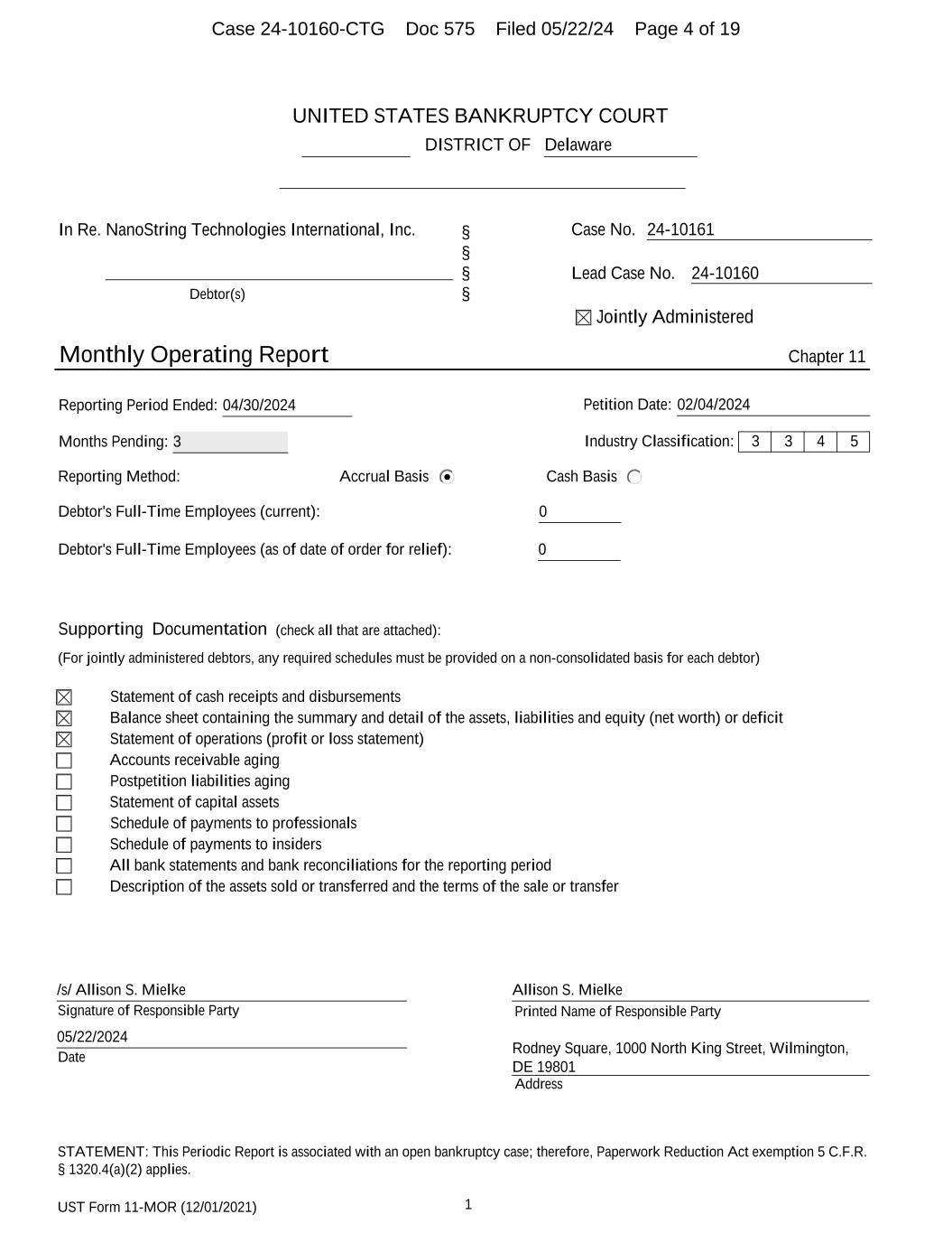 UST Form 11-MOR (12/01/2021) 1 UNITED STATES BANKRUPTCY COURT DISTRICT OF Delaware In Re. NanoString Technologies International, Inc. Debtor(s) § § § § Case No. 24-10161 Lead Case No. 24-10160 Jointly Administered Monthly Operating Report Chapter 11 Reporting Period Ended: 04/30/2024 Petition Date: 02/04/2024 Months Pending: 3 Industry Classification: 3 3 4 5 Reporting Method: Accrual Basis Cash Basis Debtor's Full-Time Employees (current): 0 Debtor's Full-Time Employees (as of date of order for relief): 0 Supporting Documentation (check all that are attached): (For jointly administered debtors, any required schedules must be provided on a non-consolidated basis for each debtor) Statement of cash receipts and disbursements Balance sheet containing the summary and detail of the assets, liabilities and equity (net worth) or deficit Statement of operations (profit or loss statement) Accounts receivable aging Postpetition liabilities aging Statement of capital assets Schedule of payments to professionals Schedule of payments to insiders All bank statements and bank reconciliations for the reporting period Description of the assets sold or transferred and the terms of the sale or transfer Signature of Responsible Party Printed Name of Responsible Party Date Address /s/ Allison S. Mielke 05/22/2024 Allison S. Mielke Rodney Square, 1000 North King Street, Wilmington, DE 19801 STATEMENT: This Periodic Report is associated with an open bankruptcy case; therefore, Paperwork Reduction Act exemption 5 C.F.R. § 1320.4(a)(2) applies. Case 24-10160-CTG Doc 575 Filed 05/22/24 Page 4 of 19