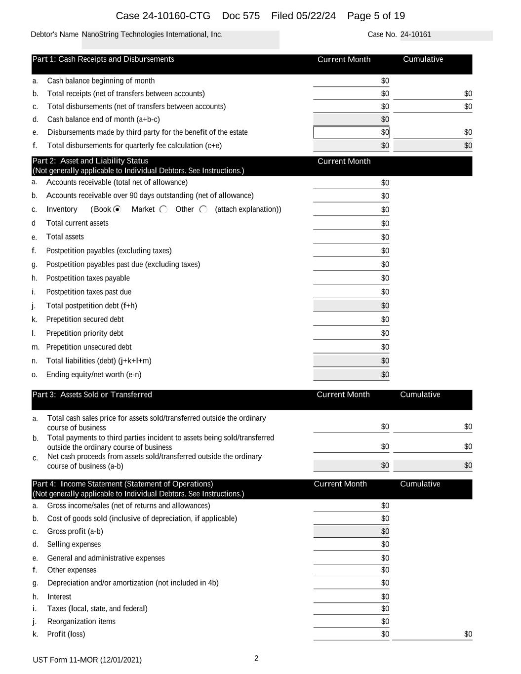 UST Form 11-MOR (12/01/2021) 2 Debtor's Name NanoString Technologies International, Inc. Case No. 24-10161 Part 1: Cash Receipts and Disbursements Current Month Cumulative a. Cash balance beginning of month $0 b. Total receipts (net of transfers between accounts) $0 $0 c. Total disbursements (net of transfers between accounts) $0 $0 d. Cash balance end of month (a+b-c) $0 e. Disbursements made by third party for the benefit of the estate $0 $0 f. Total disbursements for quarterly fee calculation (c+e) $0 $0 Part 2: Asset and Liability Status Current Month (Not generally applicable to Individual Debtors. See Instructions.) a. Accounts receivable (total net of allowance) $0 b. Accounts receivable over 90 days outstanding (net of allowance) $0 c. Inventory ( (attach explanation))Book Market Other $0 d Total current assets $0 e. Total assets $0 f. Postpetition payables (excluding taxes) $0 g. Postpetition payables past due (excluding taxes) $0 h. Postpetition taxes payable $0 i. Postpetition taxes past due $0 j. Total postpetition debt (f+h) $0 k. Prepetition secured debt $0 l. Prepetition priority debt $0 m. Prepetition unsecured debt $0 n. Total liabilities (debt) (j+k+l+m) $0 o. Ending equity/net worth (e-n) $0 Part 3: Assets Sold or Transferred Current Month Cumulative a. Total cash sales price for assets sold/transferred outside the ordinary course of business $0 $0 b. Total payments to third parties incident to assets being sold/transferred outside the ordinary course of business $0 $0 c. Net cash proceeds from assets sold/transferred outside the ordinary course of business (a-b) $0 $0 Part 4: Income Statement (Statement of Operations) Current Month Cumulative (Not generally applicable to Individual Debtors. See Instructions.) a. Gross income/sales (net of returns and allowances) $0 b. Cost of goods sold (inclusive of depreciation, if applicable) $0 c. Gross profit (a-b) $0 d. Selling expenses $0 e. General and administrative expenses $0 f. Other expenses $0 g. Depreciation and/or amortization (not included in 4b) $0 h. Interest $0 i. Taxes (local, state, and federal) $0 j. Reorganization items $0 k. Profit (loss) $0 $0 Case 24-10160-CTG Doc 575 Filed 05/22/24 Page 5 of 19