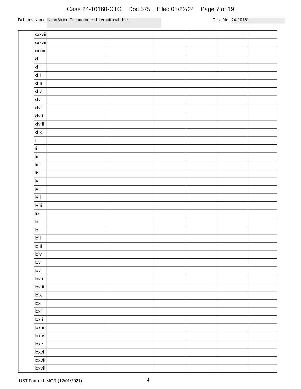 UST Form 11-MOR (12/01/2021) 4 Debtor's Name NanoString Technologies International, Inc. Case No. 24-10161 xxxvii xxxvii xxxix xl xli xlii xliii xliv xlv xlvi xlvii xlviii xlix l li lii liii liv lv lvi lvii lviii lix lx lxi lxii lxiii lxiv lxv lxvi lxvii lxviii lxix lxx lxxi lxxii lxxiii lxxiv lxxv lxxvi lxxvii lxxvii Case 24-10160-CTG Doc 575 Filed 05/22/24 Page 7 of 19